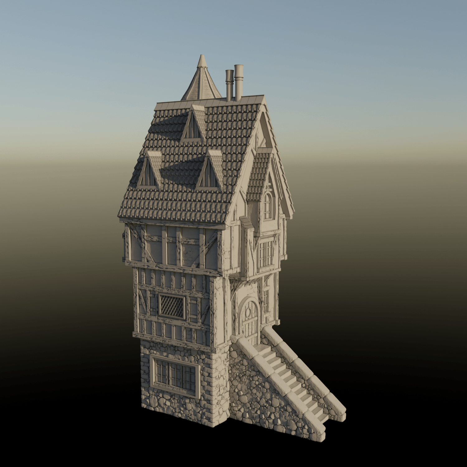 Building 4 from the City of Spiritdale. This building is massive and features a fully playable interior with multiple floors. It's a great addition to any fantasy tabletop. It would fit right in to a game of Age of Sigmar (AOS), Dungeons and Dragons (DND), Malifaux, Kings of War, Middle Earth Miniatures, or other fantasy games. It is available to be 3d printed in 15mm, 20mm, 28mm, or 32mm scale in .2mm high quality resolution.