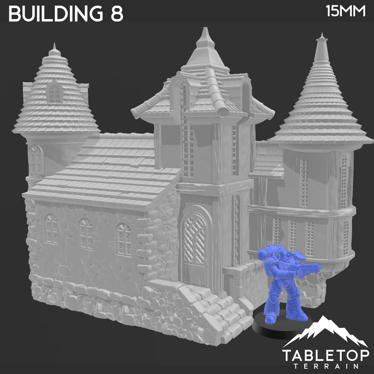 Building 8 from the City of Spiritdale. This building is massive and features a fully playable interior with multiple floors. It's a great addition to any fantasy tabletop. It would fit right in to a game of Age of Sigmar (AOS), Dungeons and Dragons (DND), Malifaux, Kings of War, Middle Earth Miniatures, or other fantasy games. It is available to be 3d printed in 15mm, 20mm, 28mm, or 32mm scale in .2mm high quality resolution.