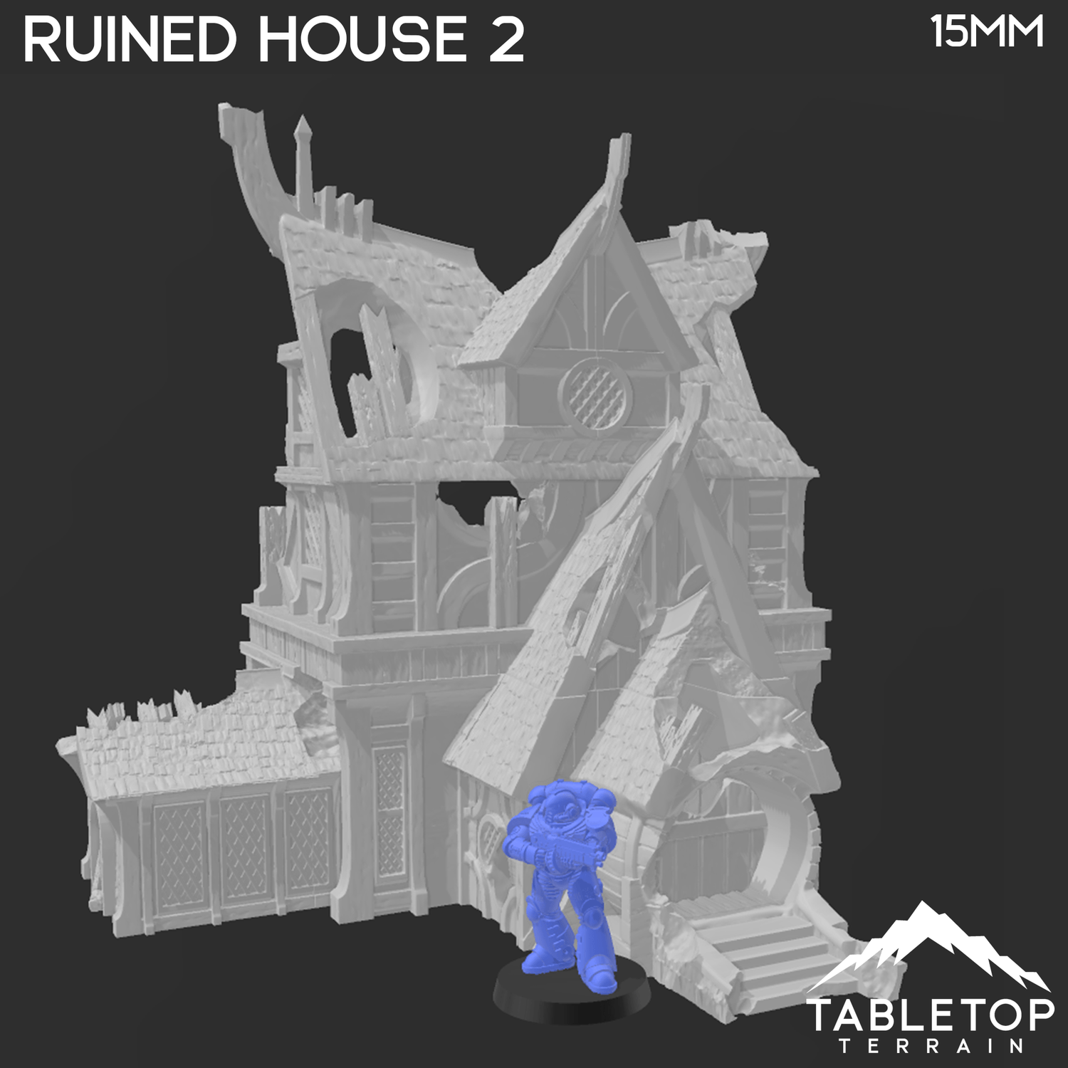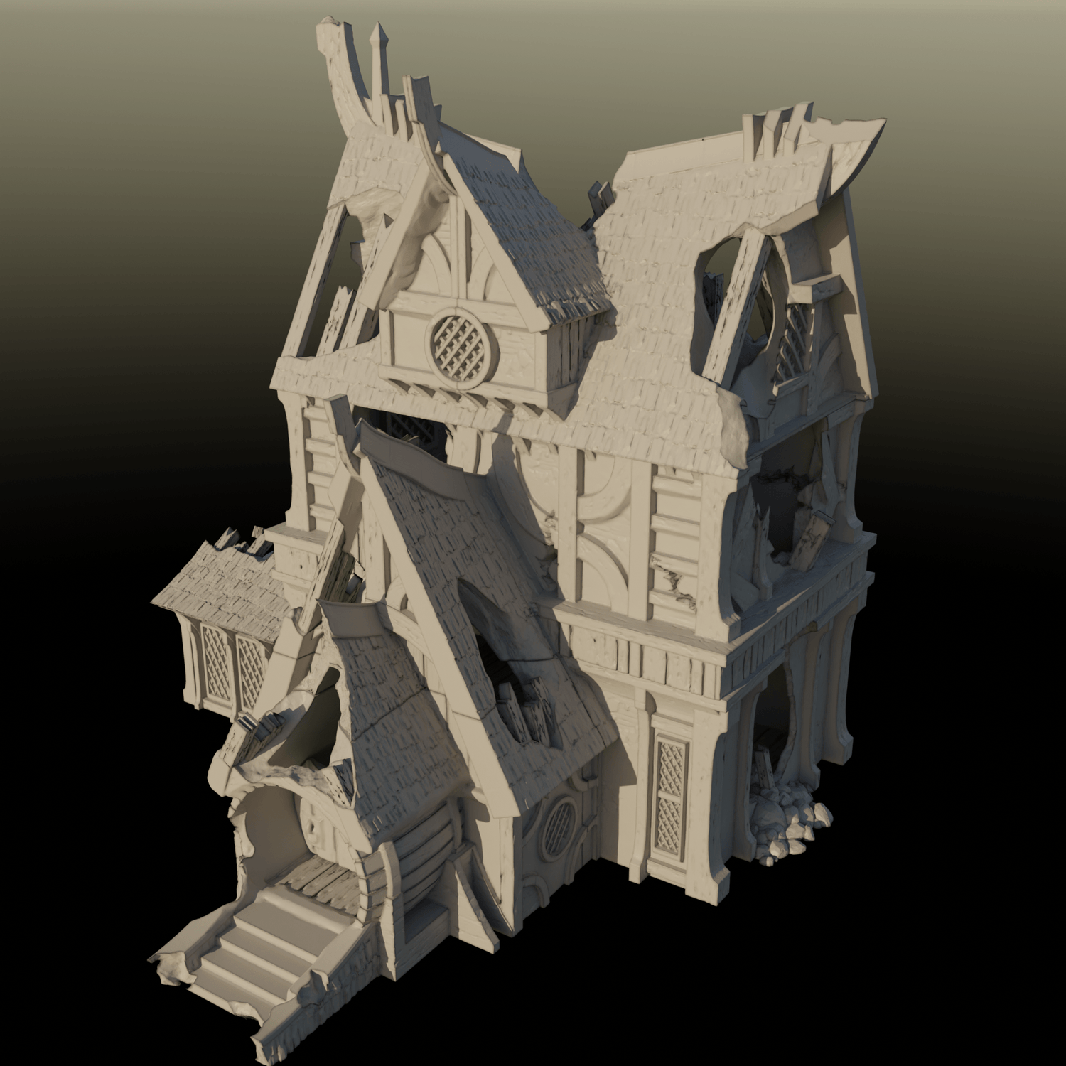 The Ruined House 2 from the City of Spiritdale. It has a playable interior with three stories. It's a great addition to any fantasy tabletop. It would fit right in to a game of Age of Sigmar (AOS), Dungeons and Dragons (DND), Malifaux, Kings of War, Middle Earth Miniatures, or other fantasy games. It is available to be 3d printed in 15mm, 20mm, 28mm, or 32mm scale in .2mm high quality resolution.