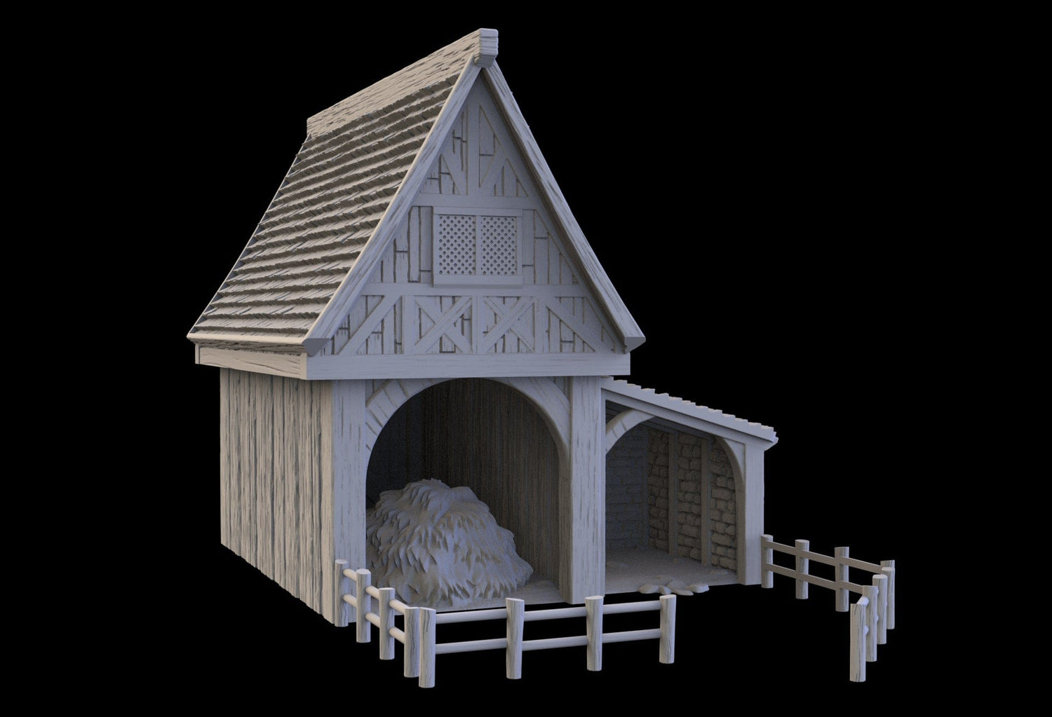The Stables from the Town of Grexdale. It's a great addition to any fantasy tabletop. It would fit right in to a game of Age of Sigmar (AOS), Dungeons and Dragons (DND), Malifaux, Kings of War, Middle Earth Miniatures, or other fantasy games. It is available to be 3d printed in 15mm, 20mm, 28mm, or 32mm scale in .2mm high quality resolution.