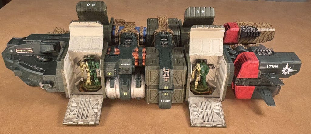 Transport your Mechs in Style! The HEXTECH Borealis Ship is a large transport and cargo craft, with fully-modular pod bays for different attachments. This fully modular ship is a stylish and playable on the table!