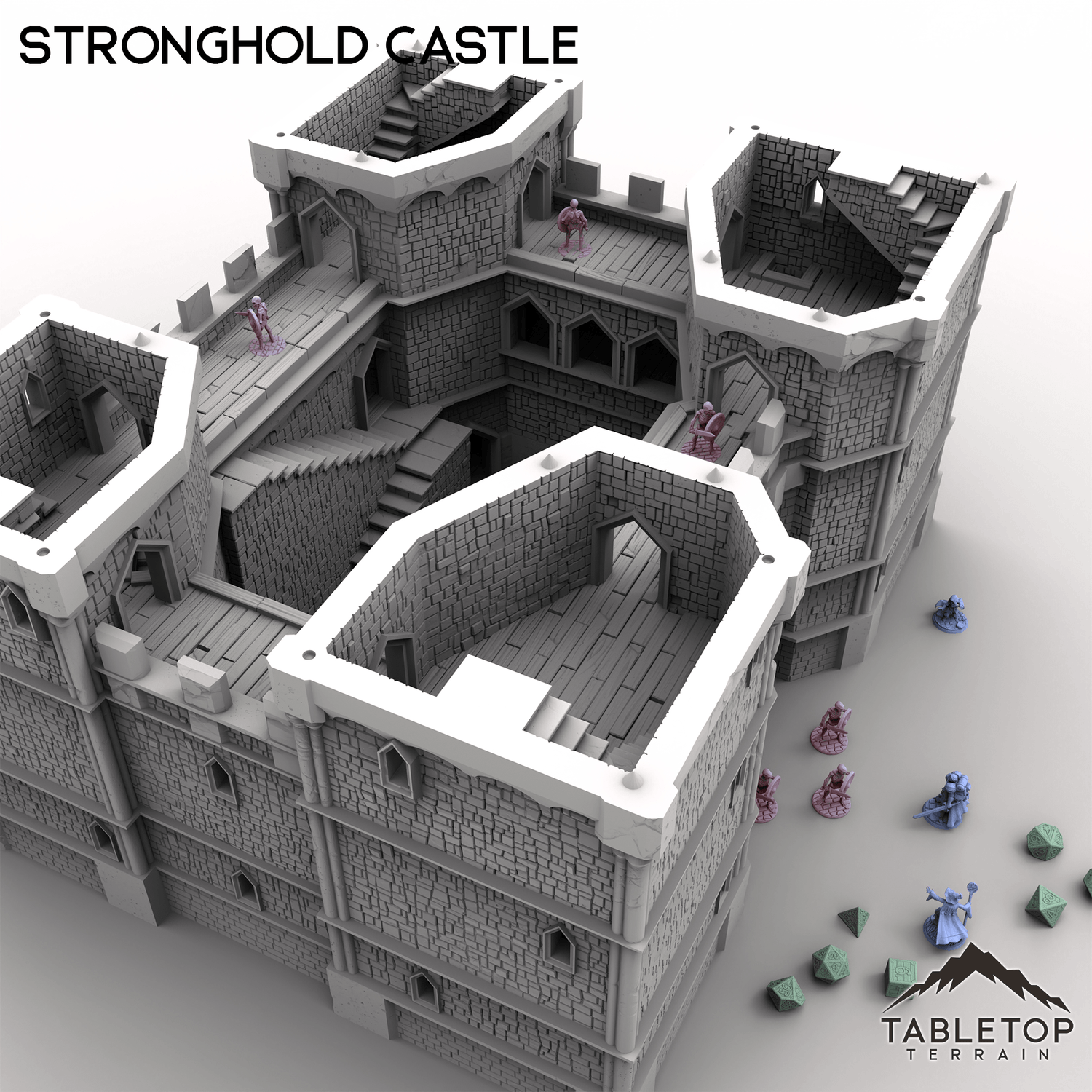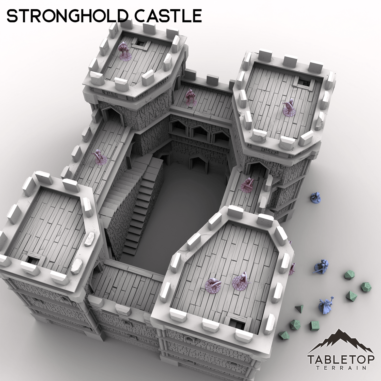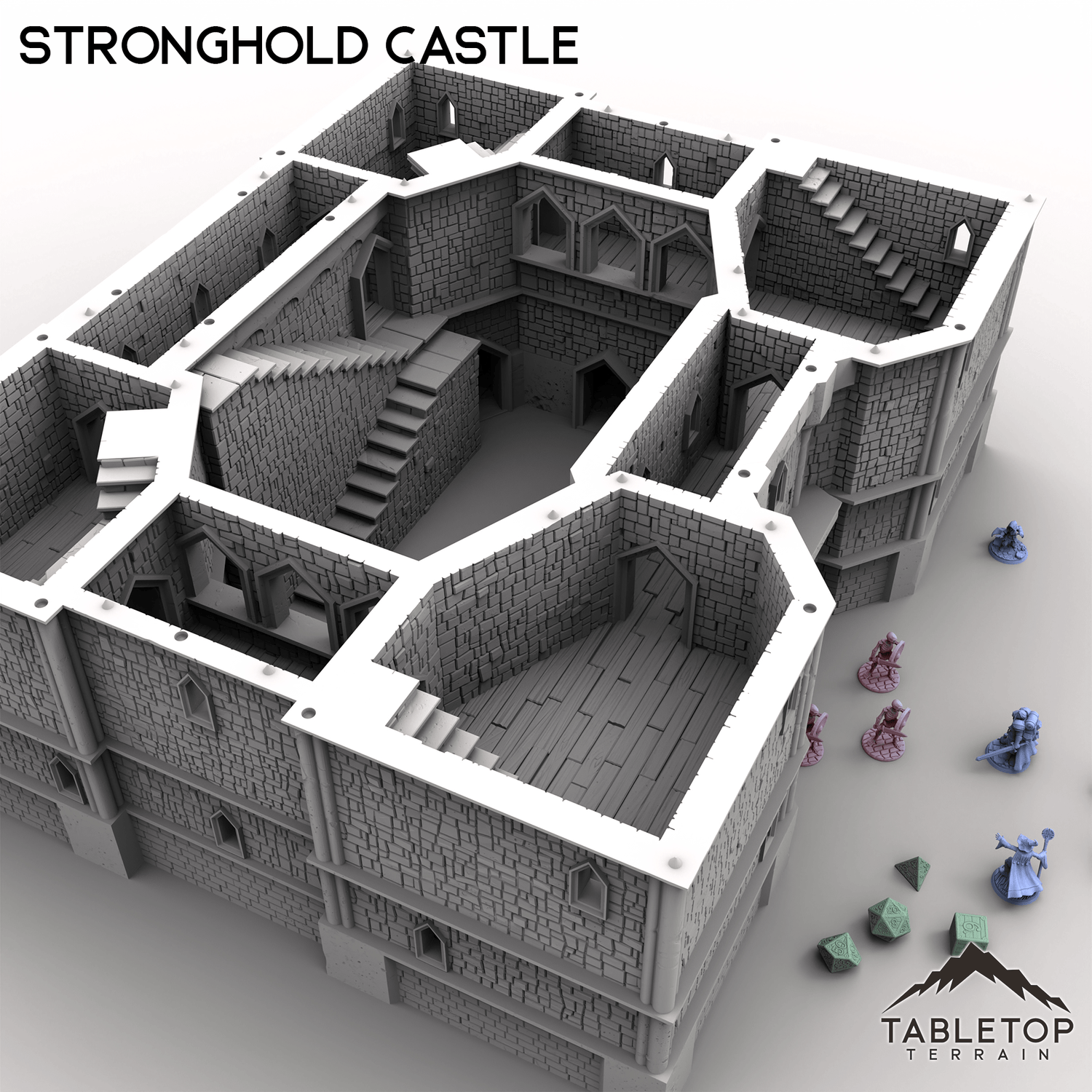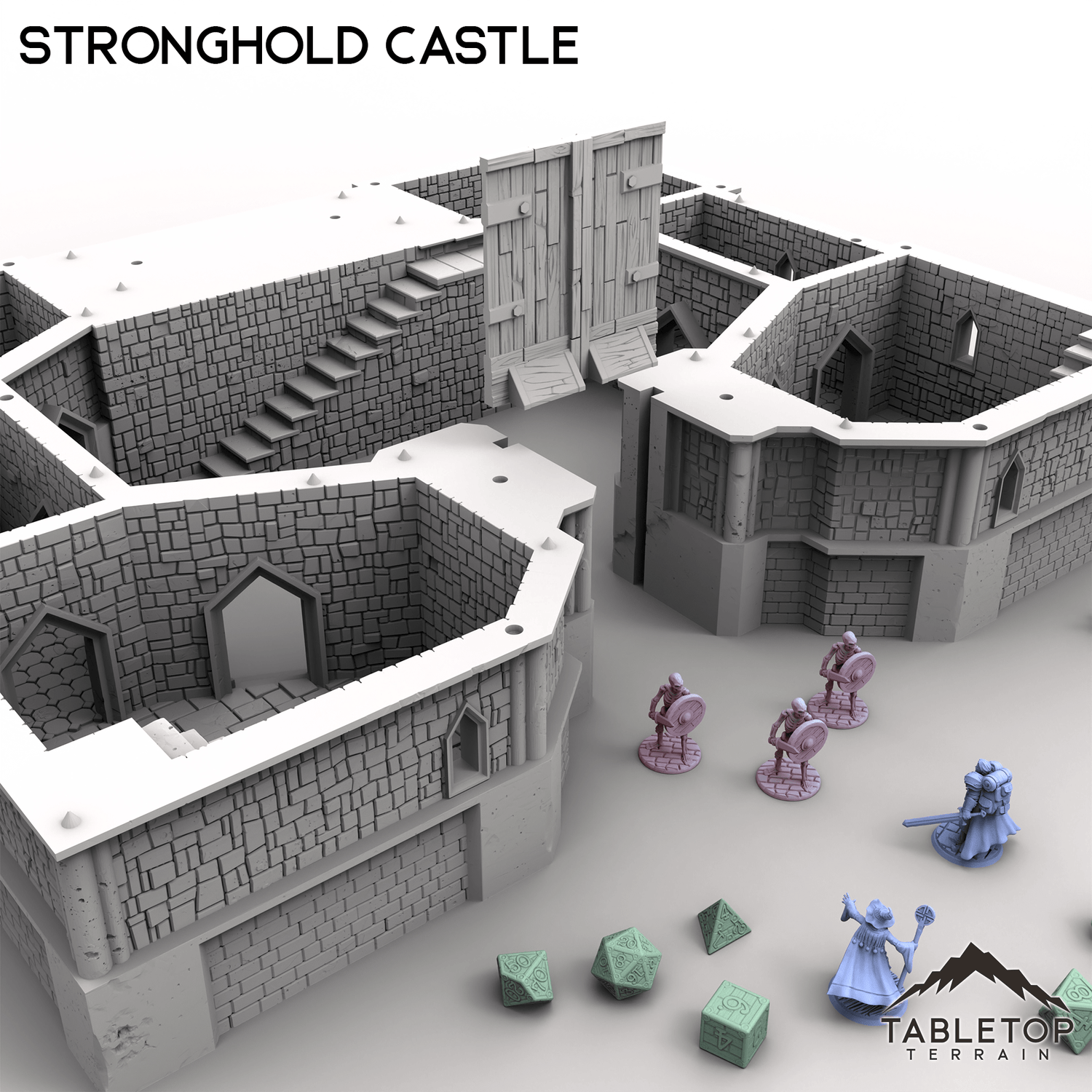 Massive and imposing, this mighty Stronghold Castle is built to withstand any siege! This set is huge, at almost 2-feet wide at the standard 28mm scale, filled with rooms for placing minis and traps, and each section can be removed freely without needing clips and glue. Each floor of the castle has sets of spikes that keep the model held in place while using it, but allow easy access for getting inside. The massive front gates slide out for accessing the courtyards. Stronghold Castle is large enough to serve a variety of functions, from the evil fortress of a dark power, to the kingdom's seat of royal power, or even a base for the players to call their own.