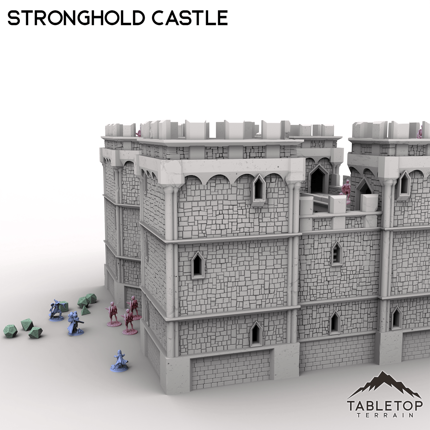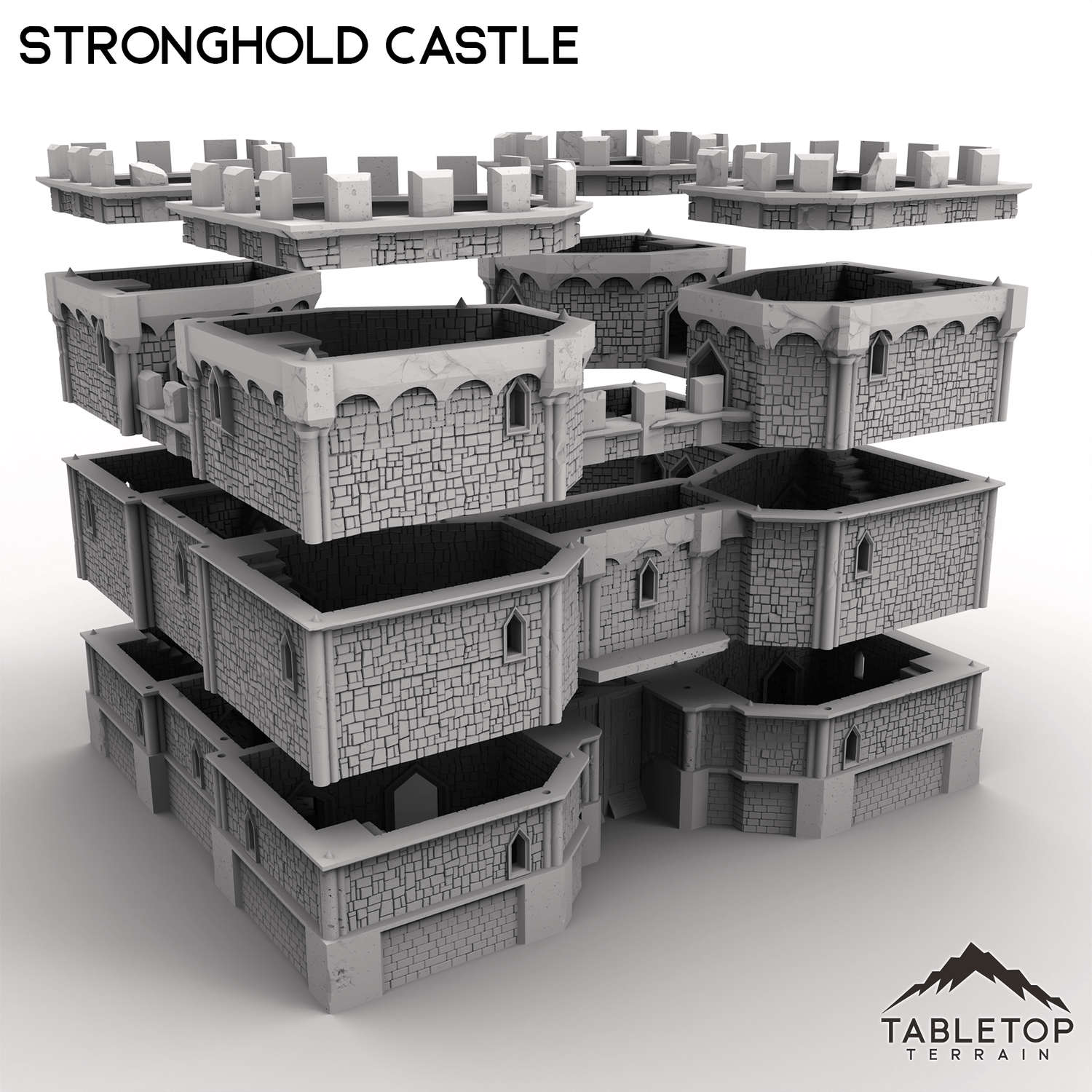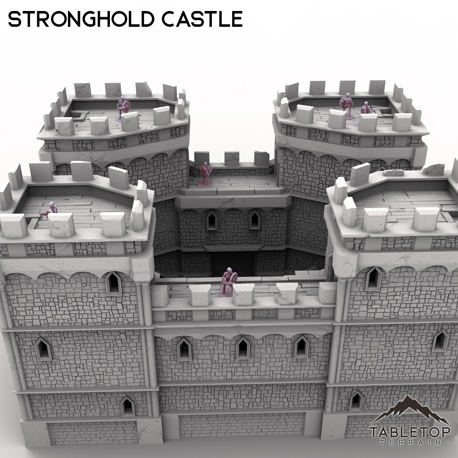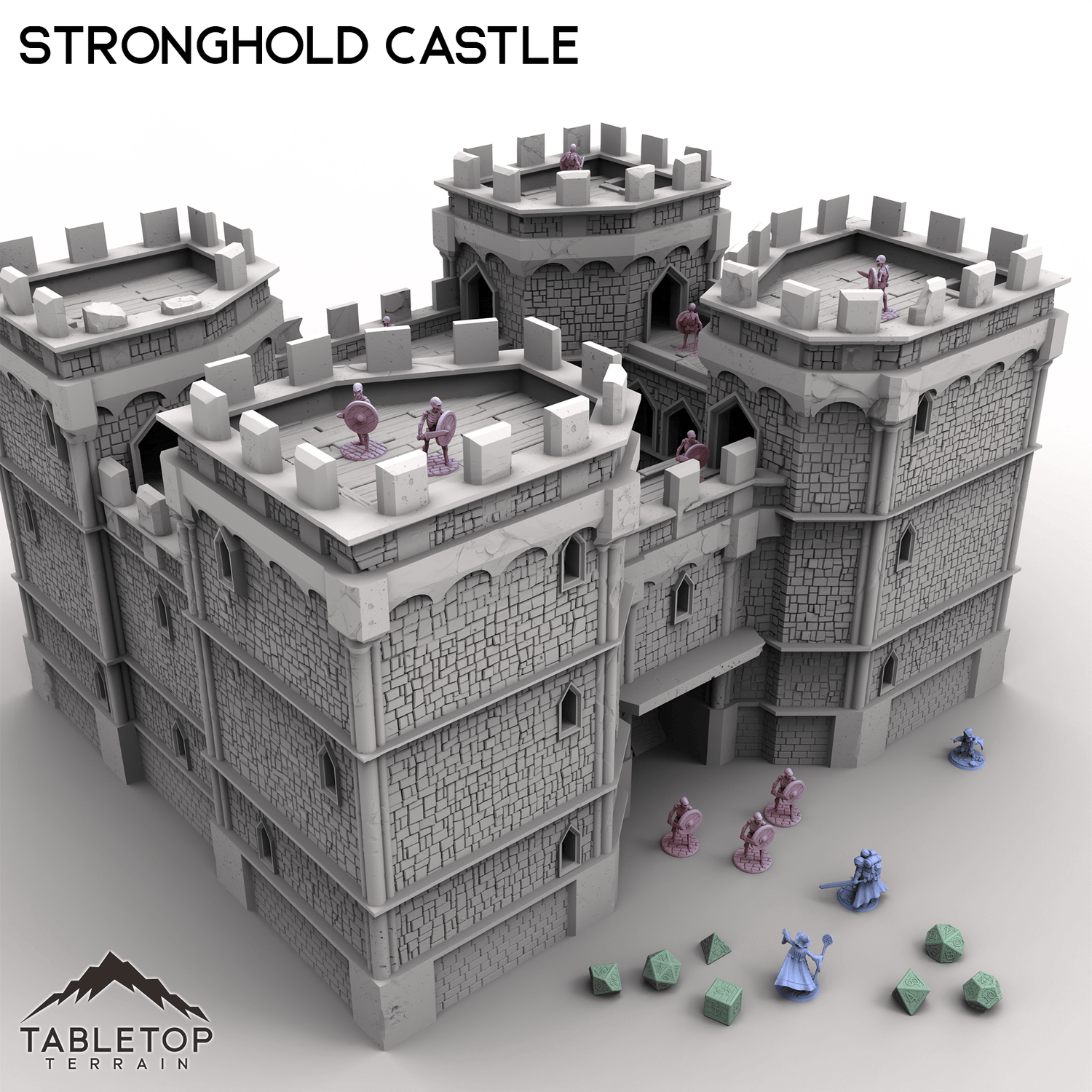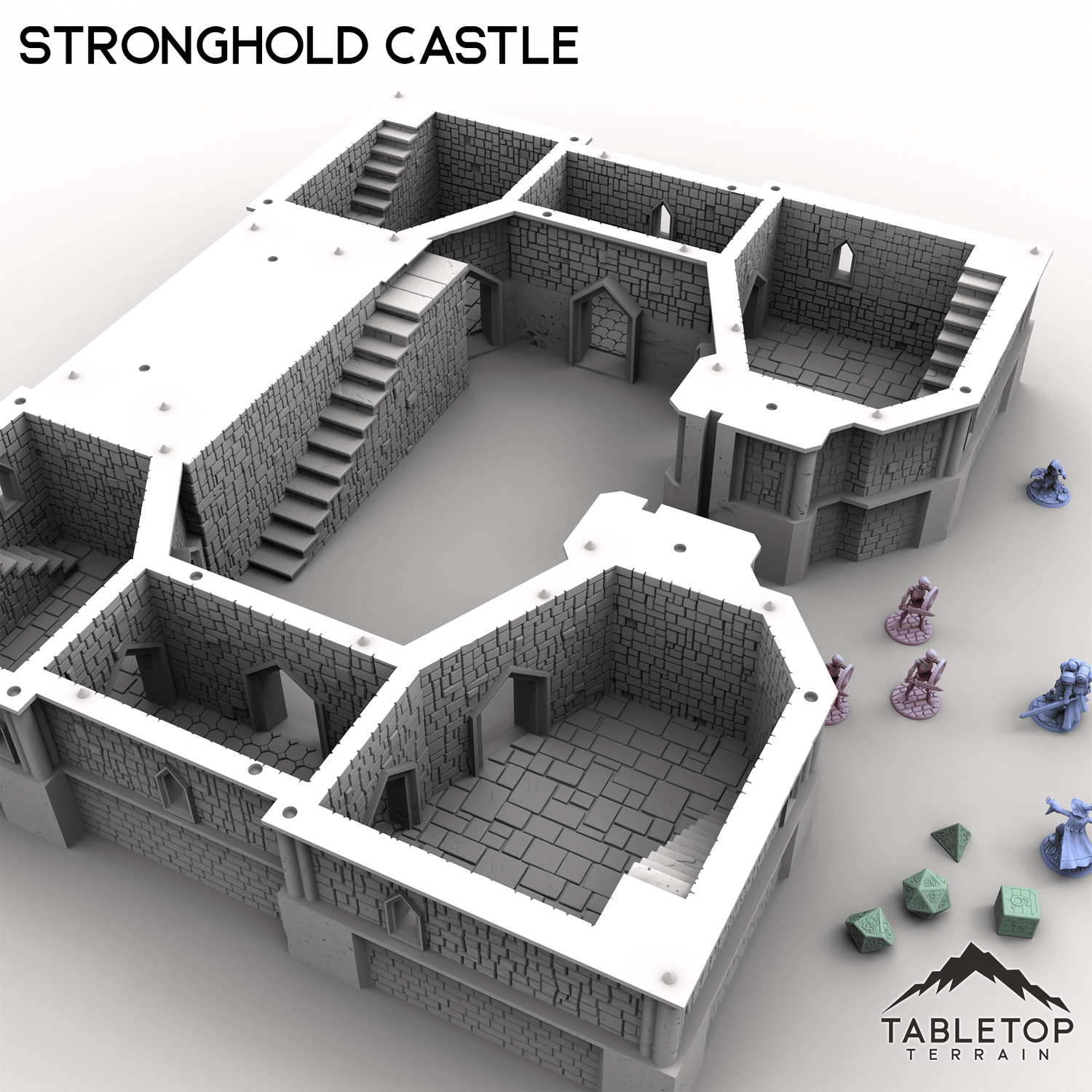 Massive and imposing, this mighty Stronghold Castle is built to withstand any siege! This set is huge, at almost 2-feet wide at the standard 28mm scale, filled with rooms for placing minis and traps, and each section can be removed freely without needing clips and glue. Each floor of the castle has sets of spikes that keep the model held in place while using it, but allow easy access for getting inside. The massive front gates slide out for accessing the courtyards. Stronghold Castle is large enough to serve a variety of functions, from the evil fortress of a dark power, to the kingdom's seat of royal power, or even a base for the players to call their own.