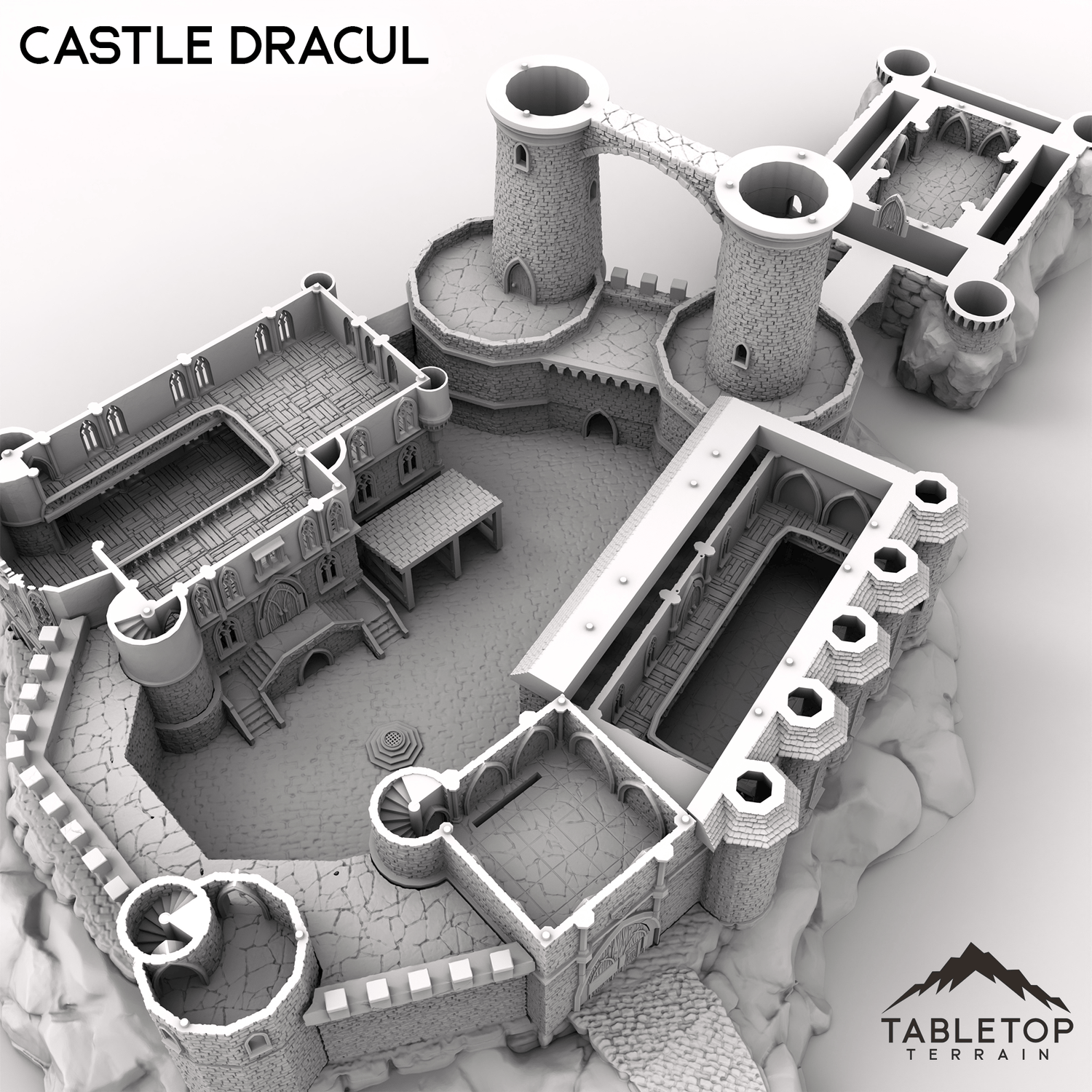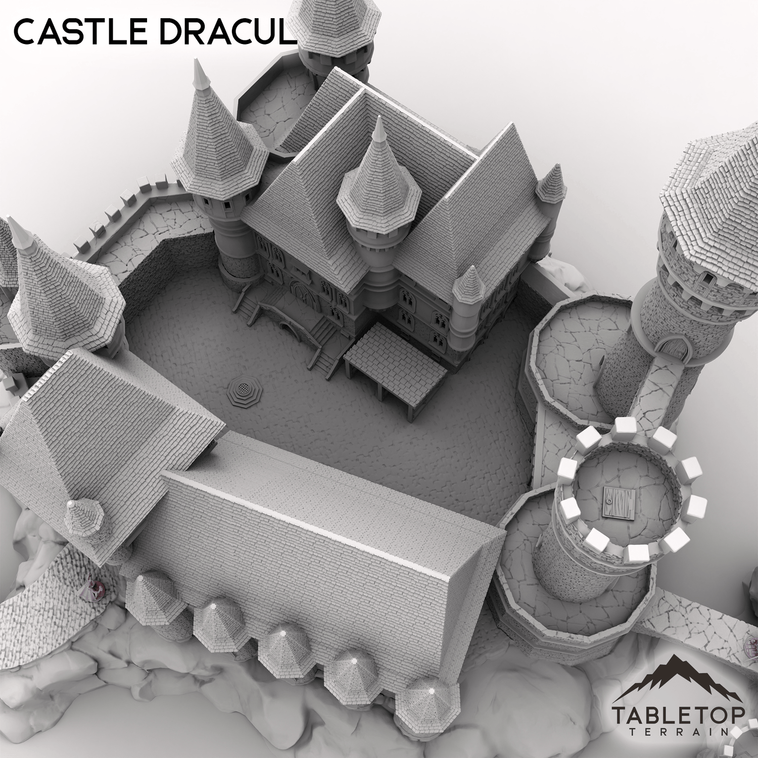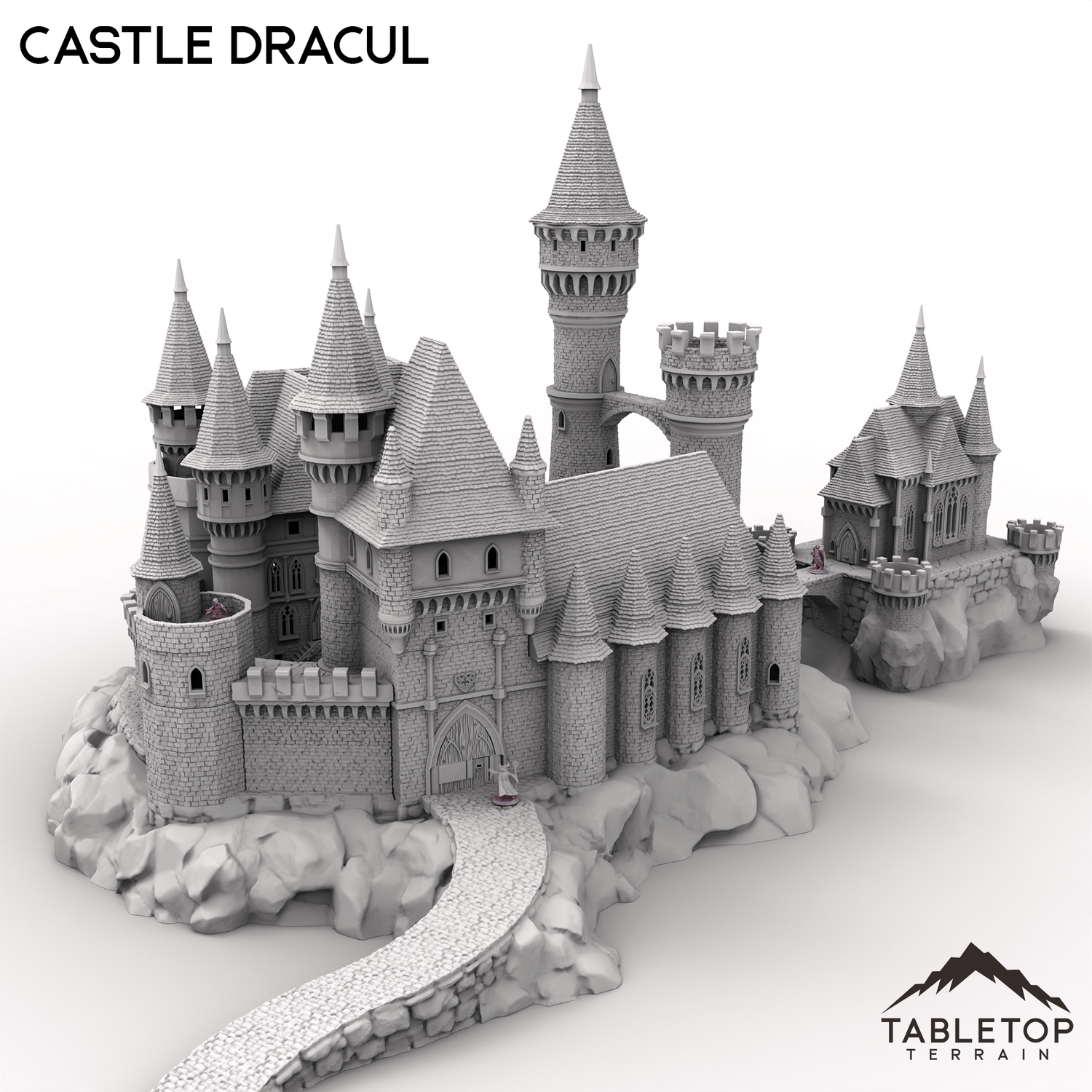 Castle Dracul is a massive fortress with towering spires, bridges, and a side chapel connected by a stone bridge! The entire castle is modeled and meant for minis, including a detailed courtyard and a fleshed out dungeon. The chapel rests off the cliff to the side, while massive wooden doors hide the gate's bars to block the main entrance. The interiors are fully modeled, with halls, rooms, and passages that feel alive and interesting to explore. This set is an outstanding centerpiece to any tabletop game, and could be used with a wide variety of different genres and systems.