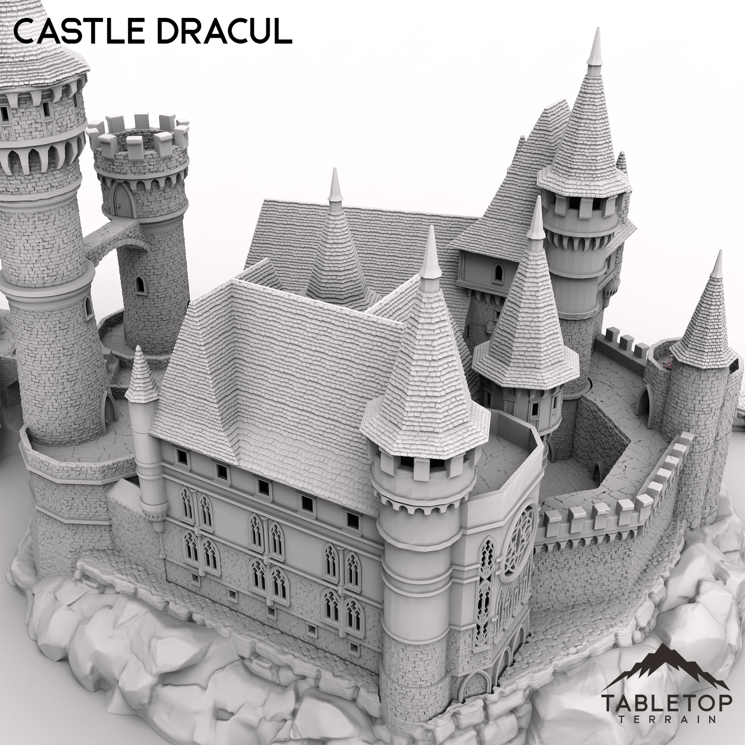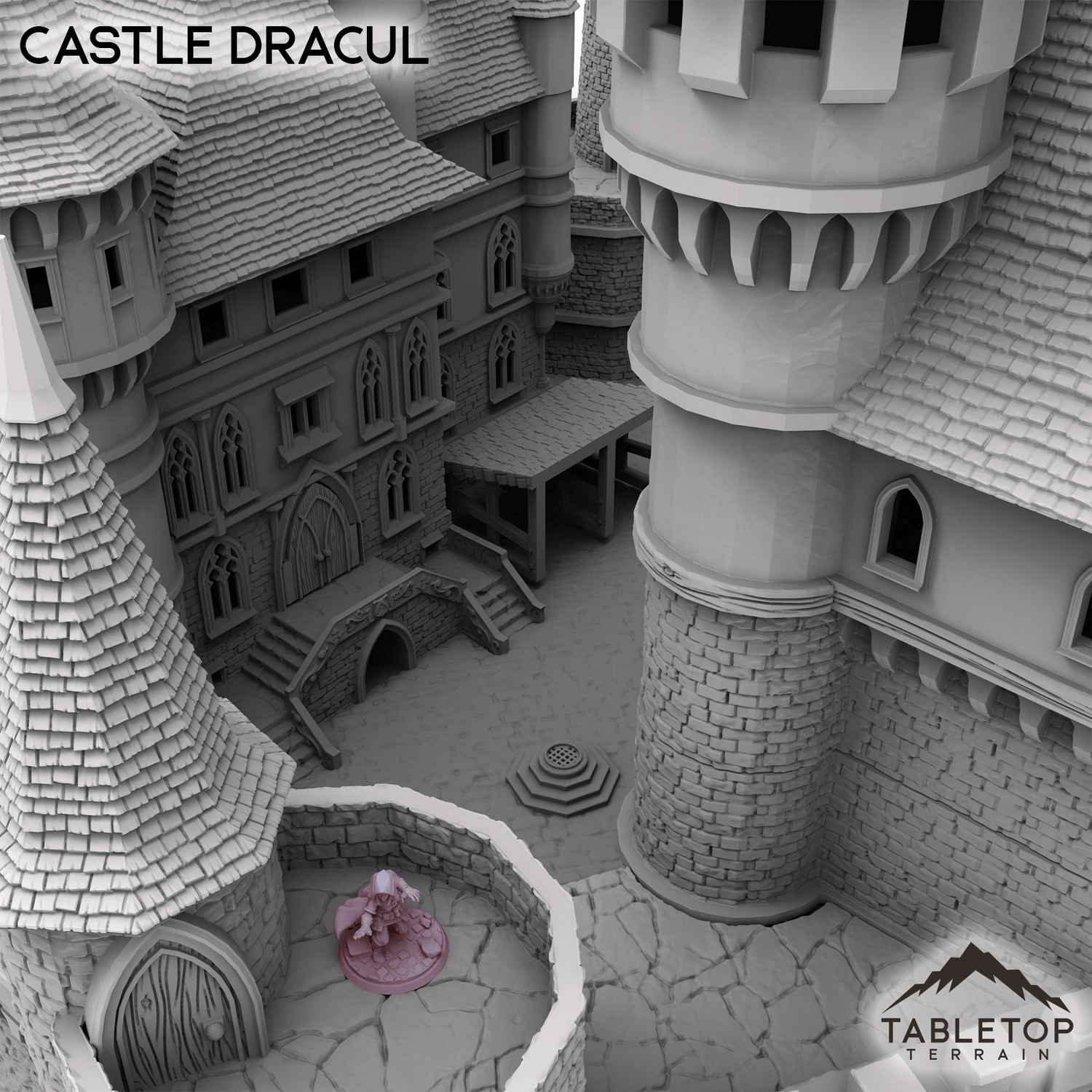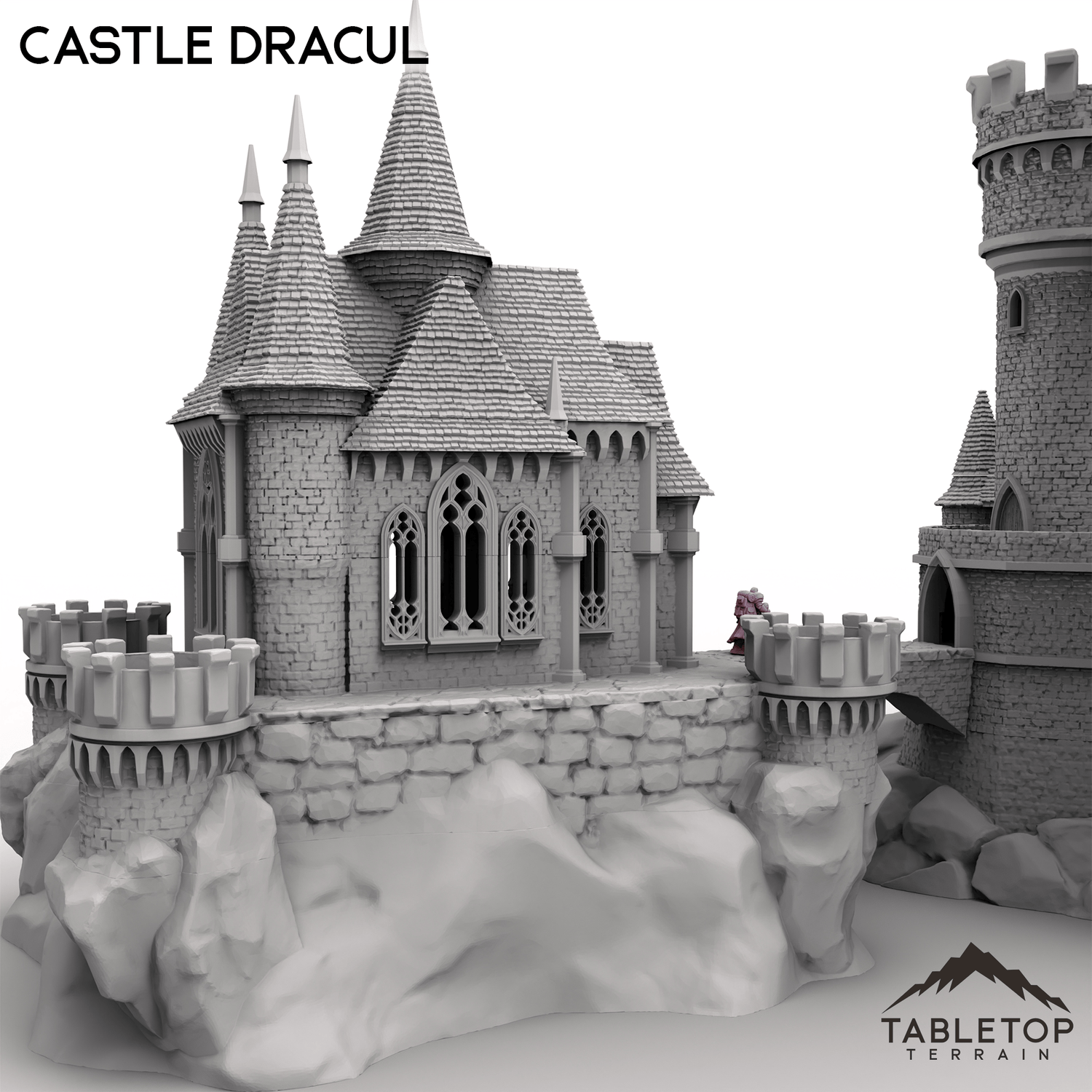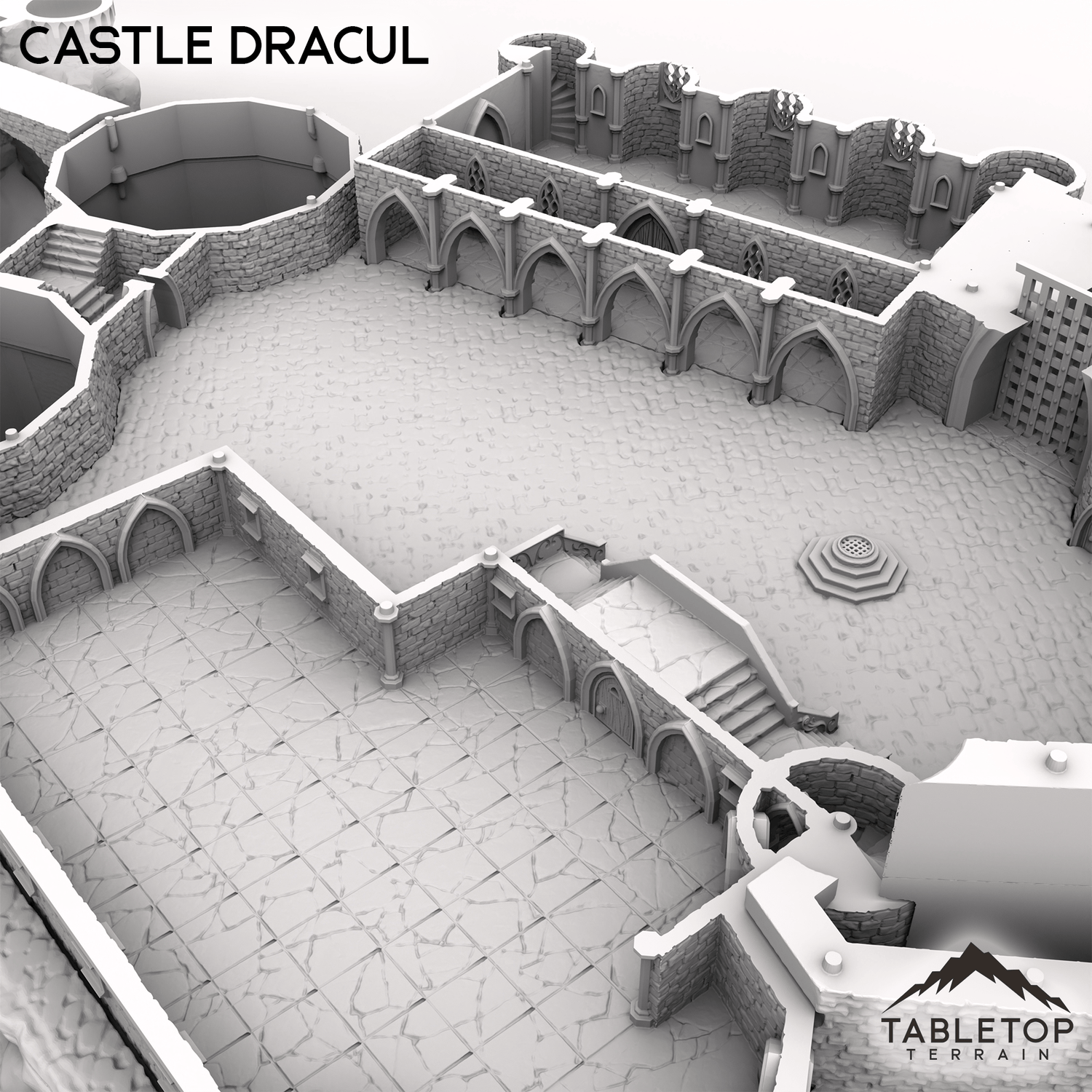 Castle Dracul is a massive fortress with towering spires, bridges, and a side chapel connected by a stone bridge! The entire castle is modeled and meant for minis, including a detailed courtyard and a fleshed out dungeon. The chapel rests off the cliff to the side, while massive wooden doors hide the gate's bars to block the main entrance. The interiors are fully modeled, with halls, rooms, and passages that feel alive and interesting to explore. This set is an outstanding centerpiece to any tabletop game, and could be used with a wide variety of different genres and systems.