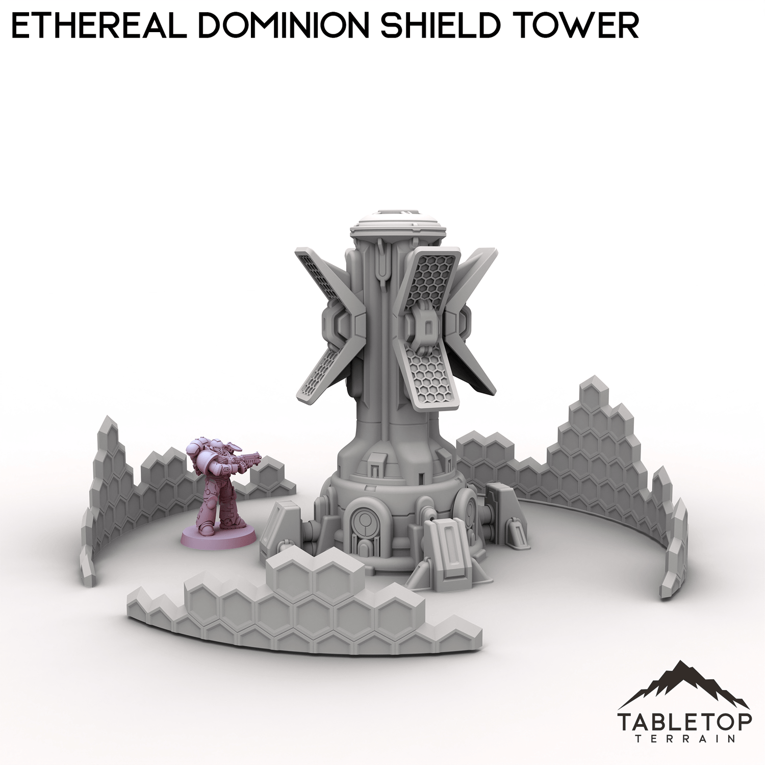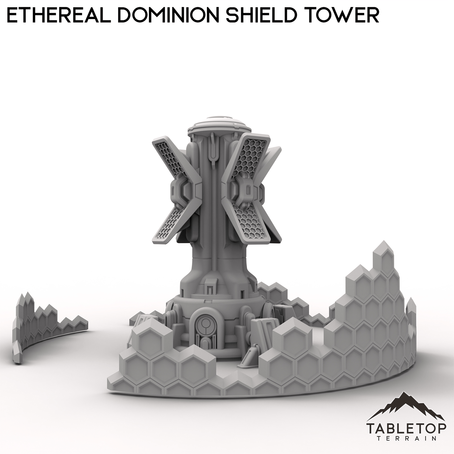 The Ethereal Dominion Shield Tower stands as a formidable defense structure, equipped with advanced energy shielding technology. The powerful barrier is capable of deflecting incoming projectiles and energy blasts. Its angular design and emitter arrays give it a rugged yet high-tech appearance