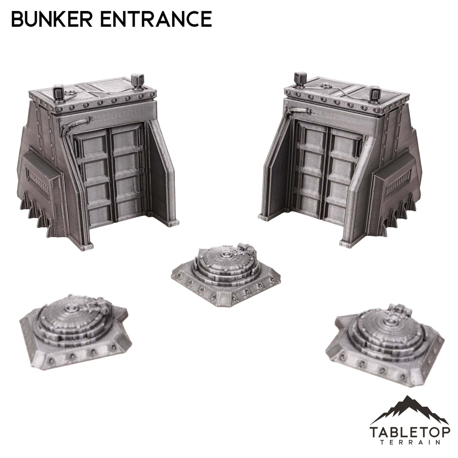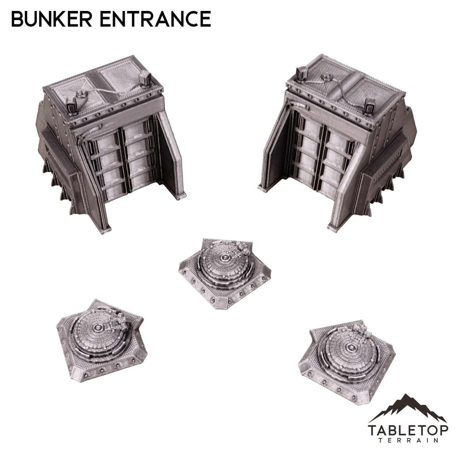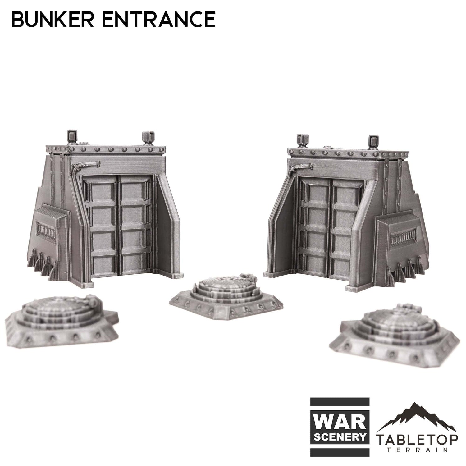 The Bunker Entrance Set includes 5 items. 2 tall infantry entrances and 3 ground hatches. The set is designed for sci-fi wargames but could also work for other genres as there is not any iconography on the items.
