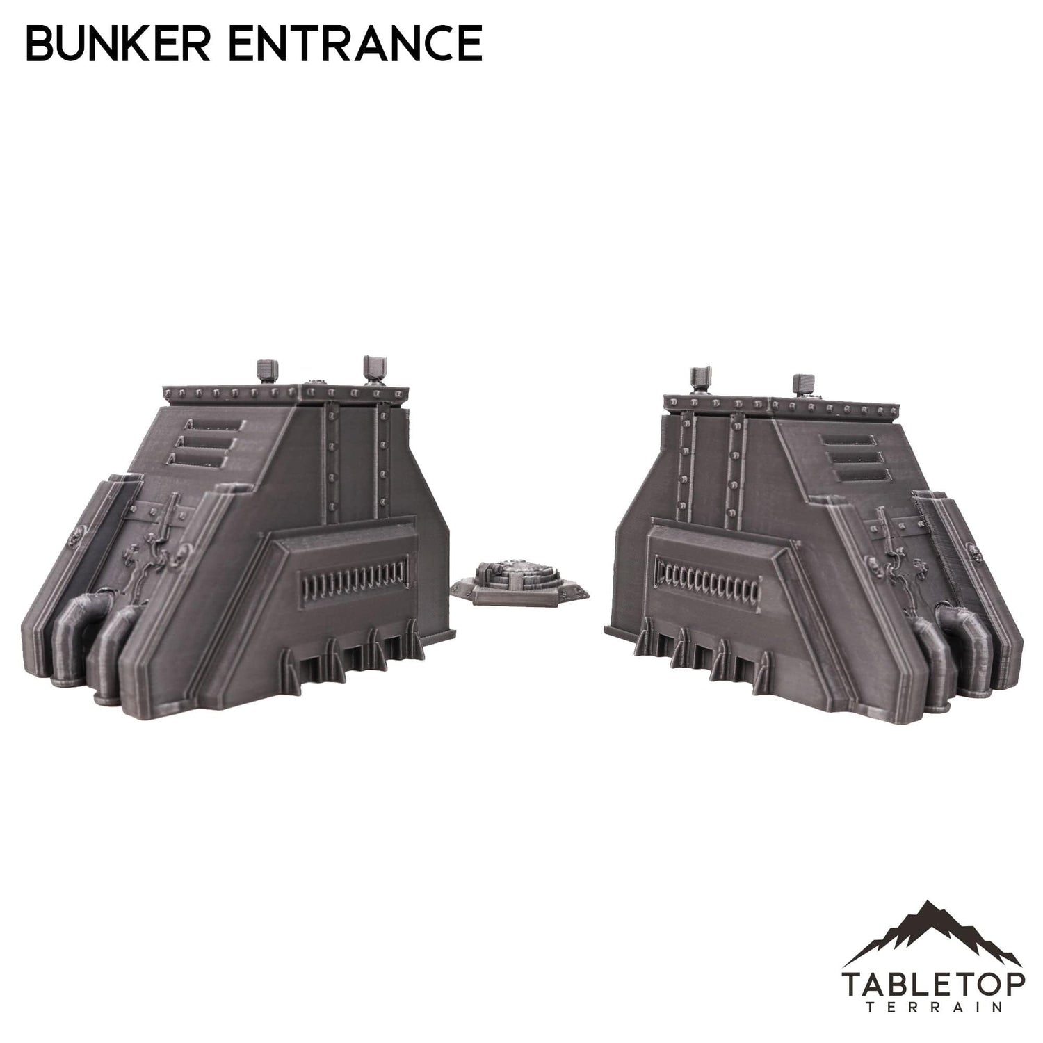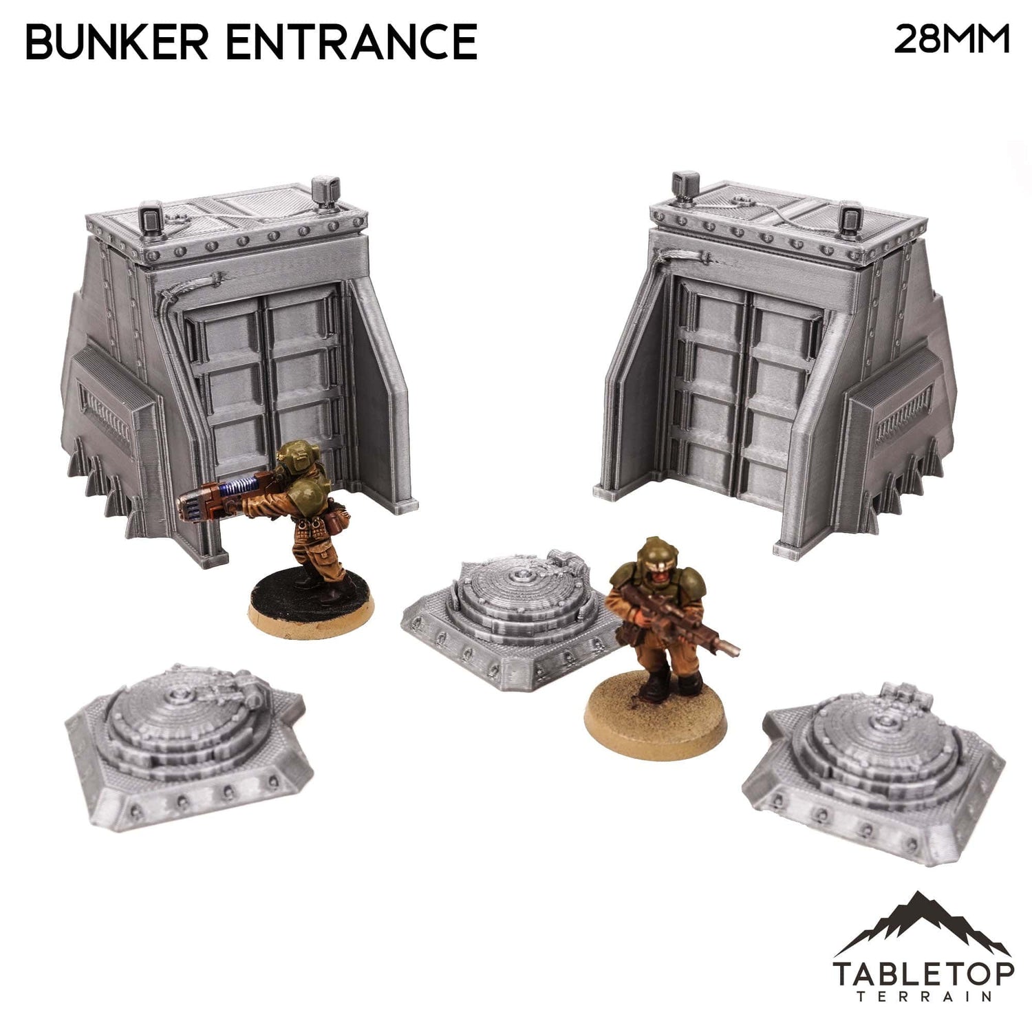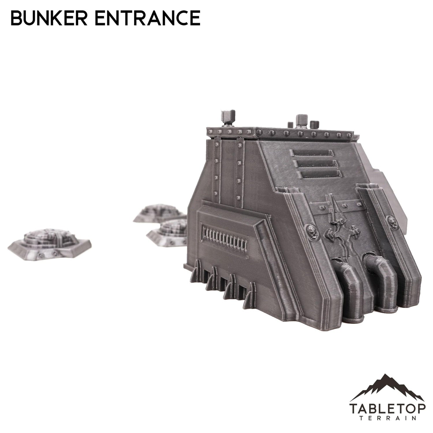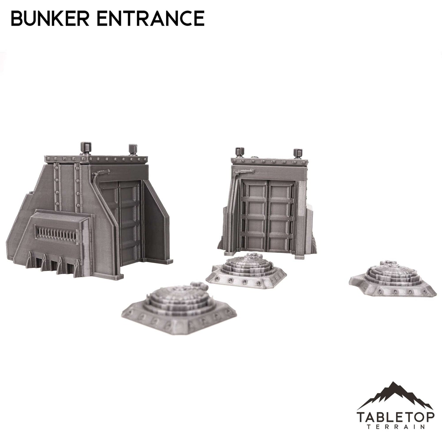 The Bunker Entrance Set includes 5 items. 2 tall infantry entrances and 3 ground hatches. The set is designed for sci-fi wargames but could also work for other genres as there is not any iconography on the items.