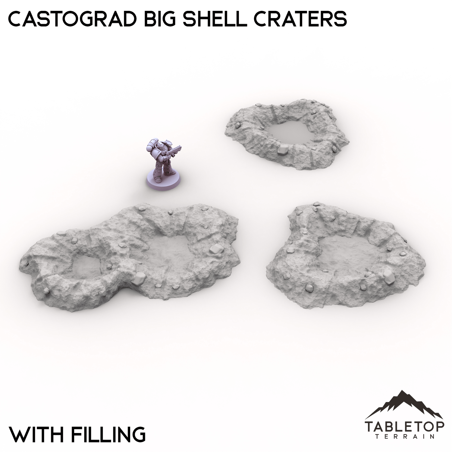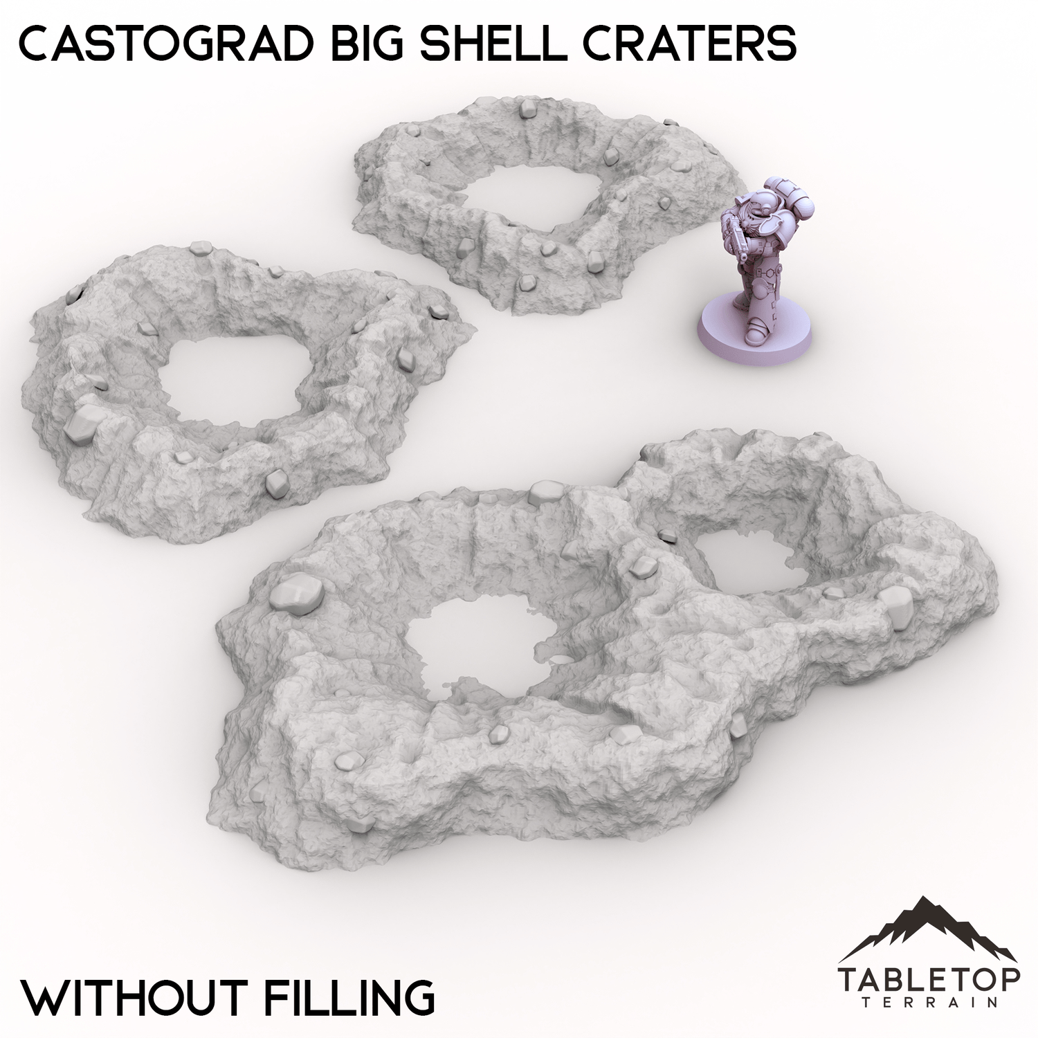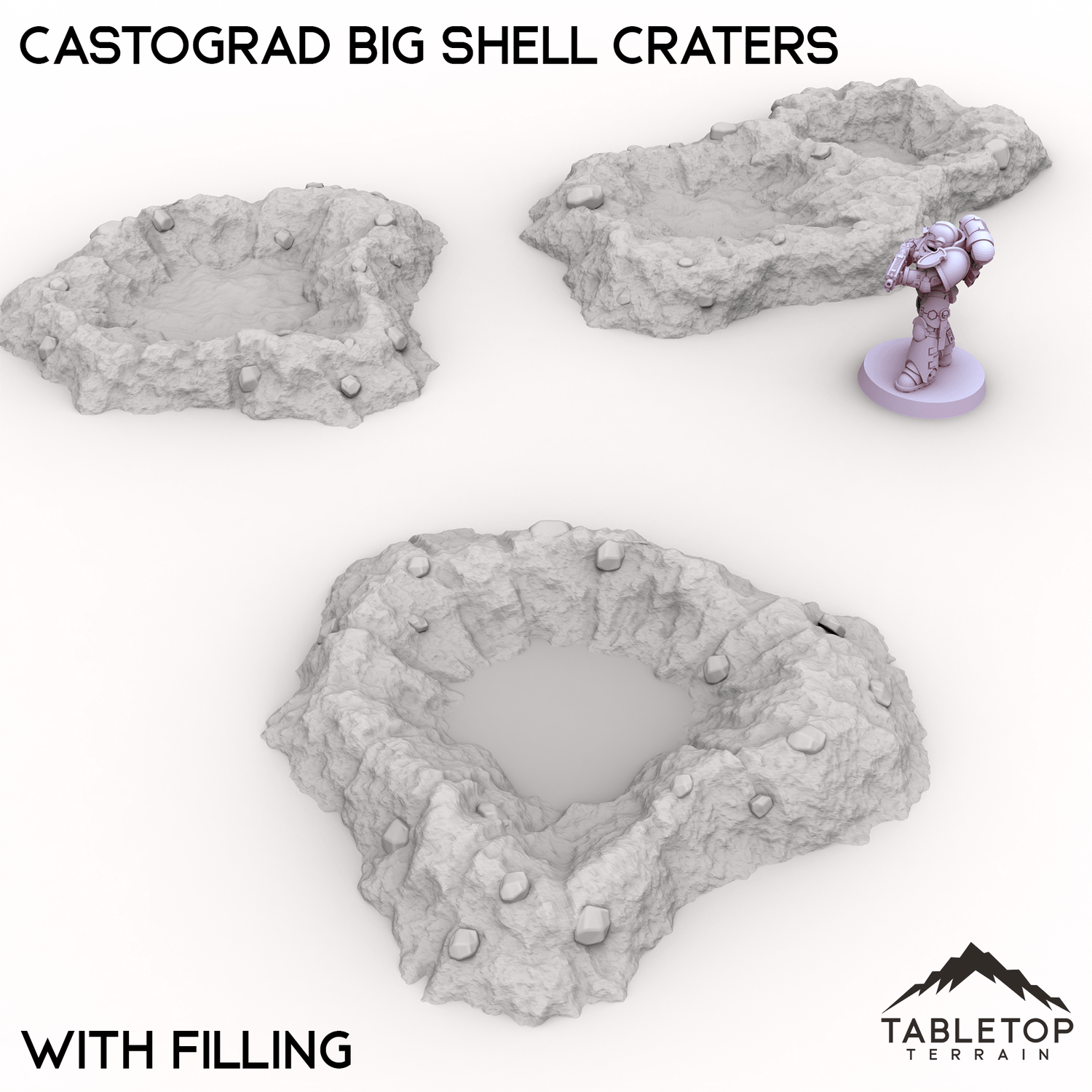 The Castograd Big Shell Craters is a set of 3 craters, available with or without the crater's hole filled in. Each crater has detailed rock texture and blast lines to show the remains of a battle. They are made as part of the Castograd collection but could work with any genre of tabletop.