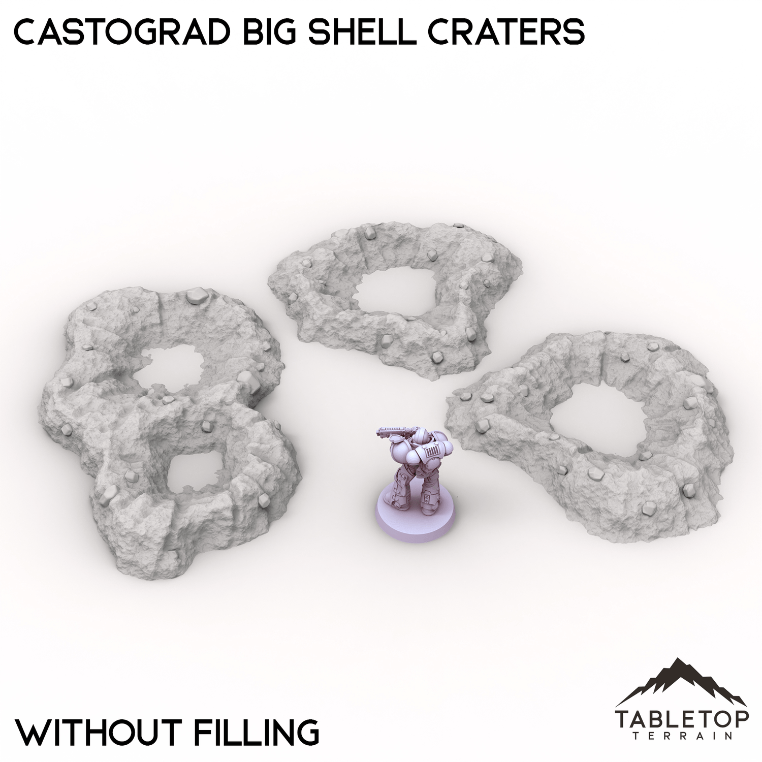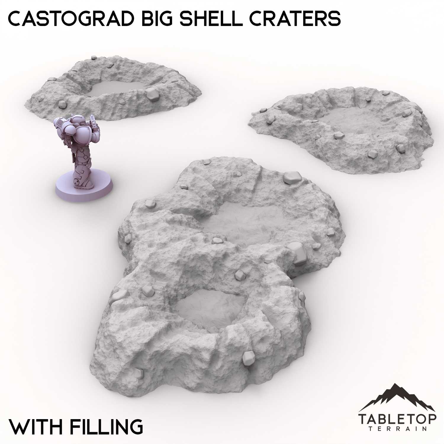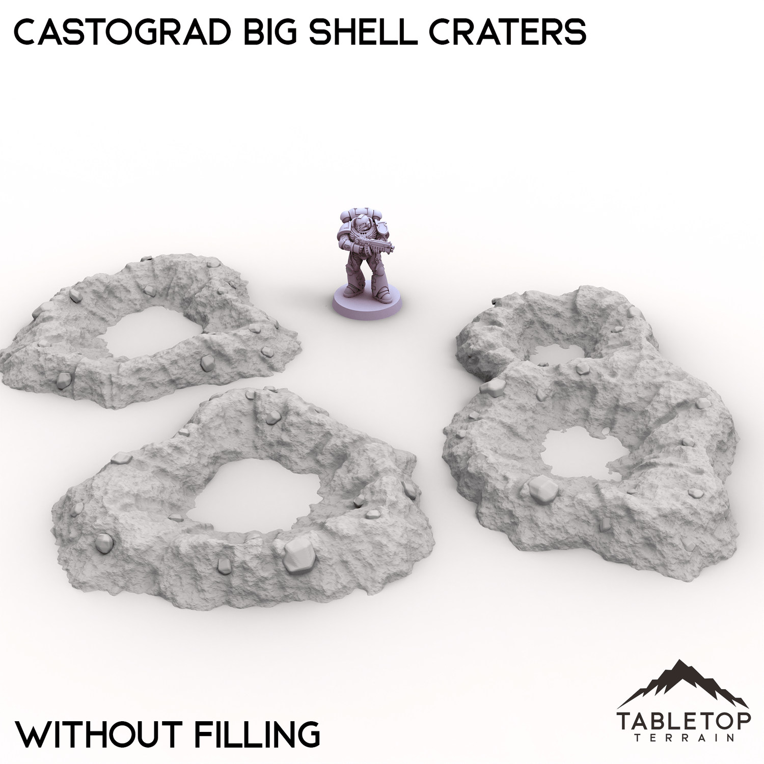 The Castograd Big Shell Craters is a set of 3 craters, available with or without the crater's hole filled in. Each crater has detailed rock texture and blast lines to show the remains of a battle. They are made as part of the Castograd collection but could work with any genre of tabletop.