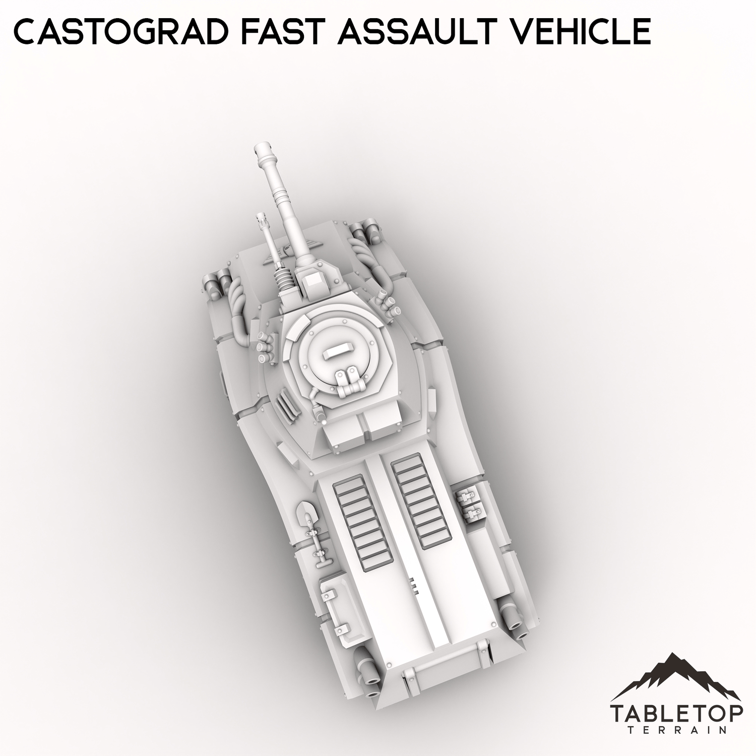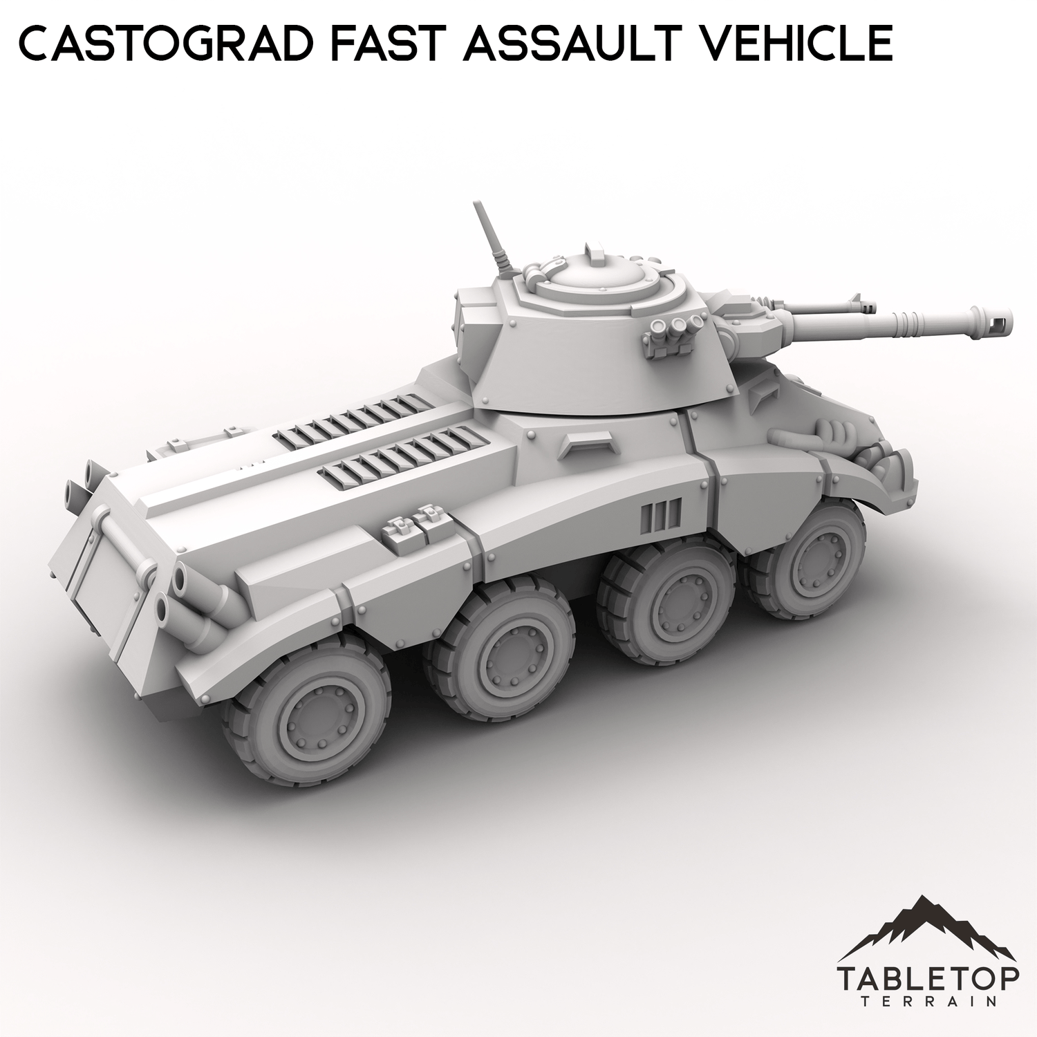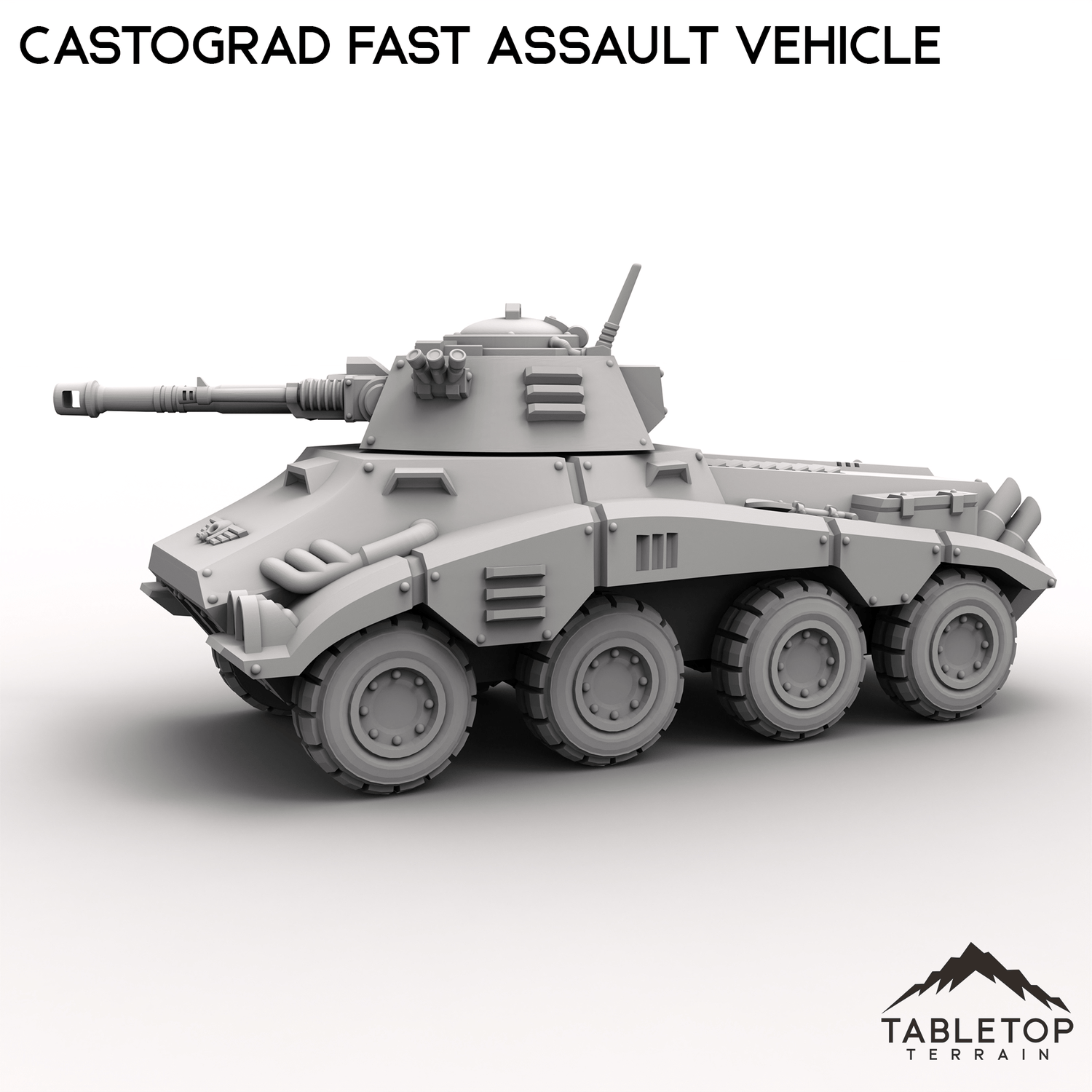 The Castograd Fast Assault Vehicle features moving wheels, and a fully rotating main cannon. The model is made to be easy to paint and store, but features detailed textures all through the vehicle's body.
