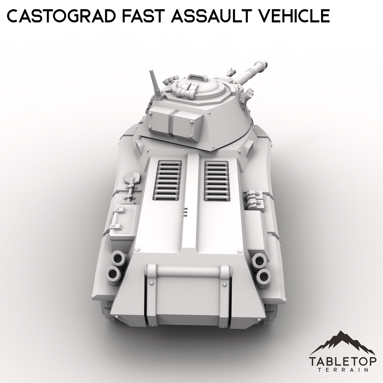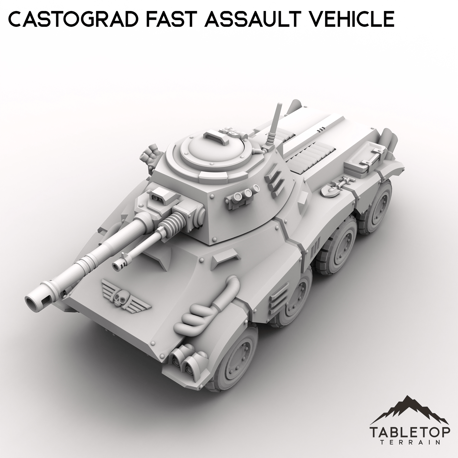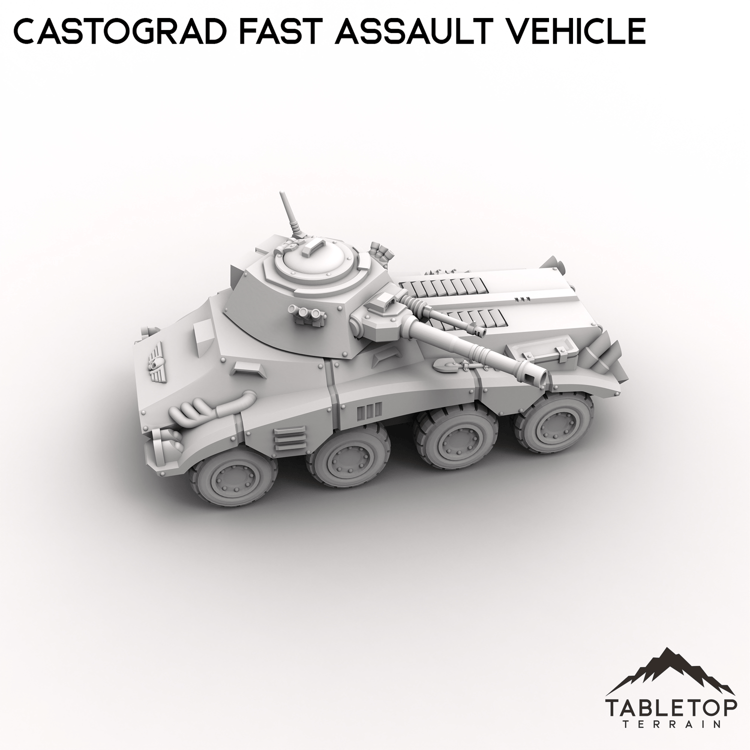 The Castograd Fast Assault Vehicle features moving wheels, and a fully rotating main cannon. The model is made to be easy to paint and store, but features detailed textures all through the vehicle's body.