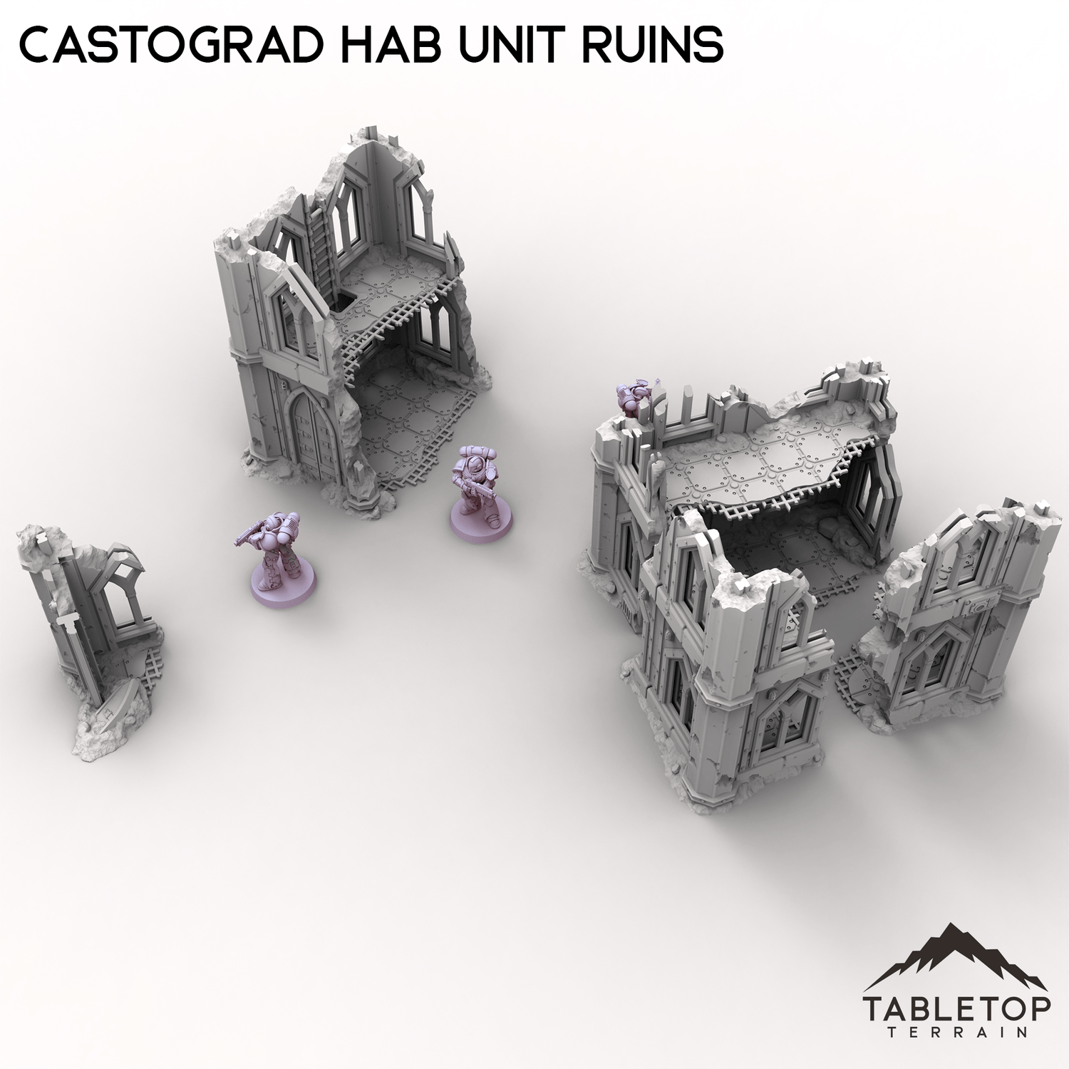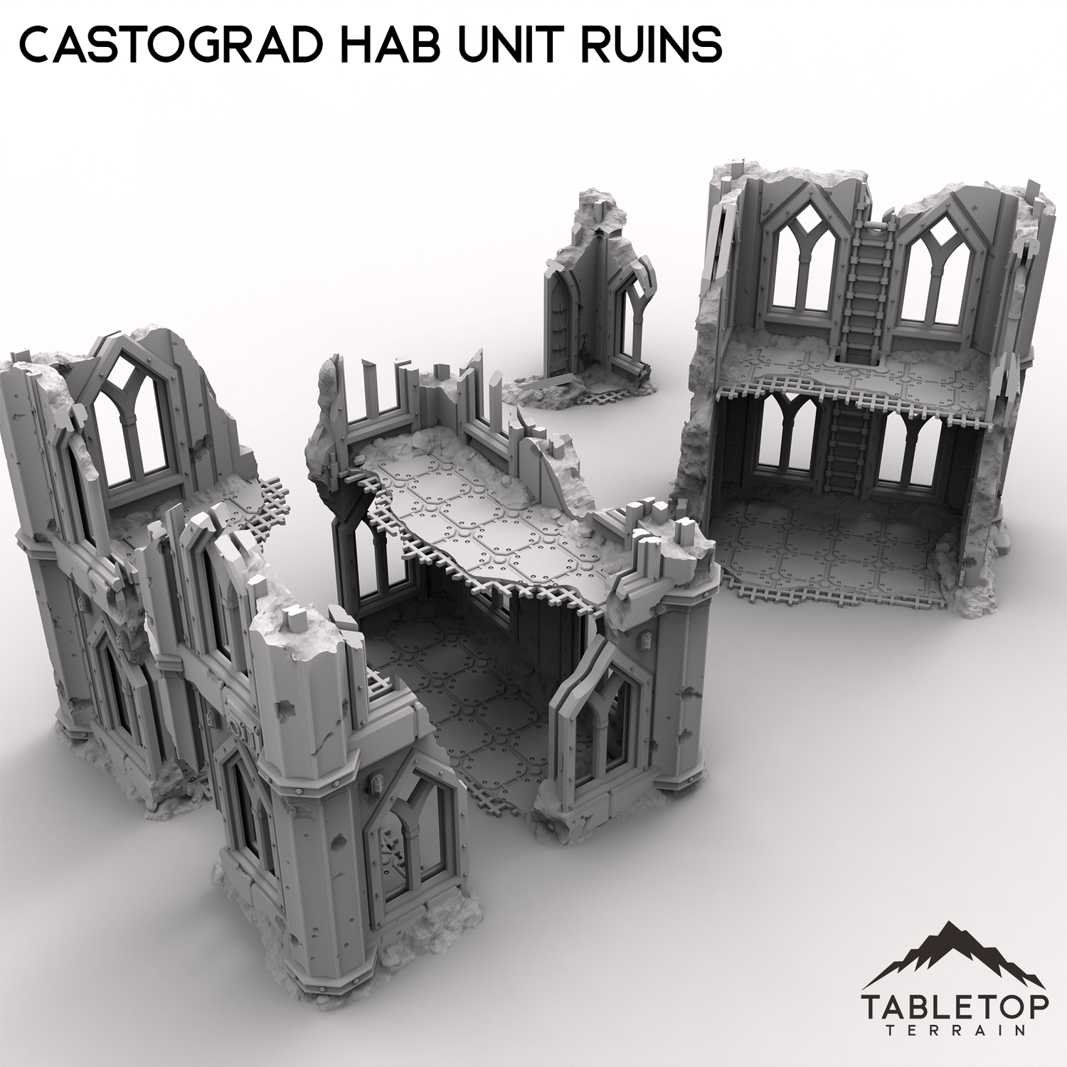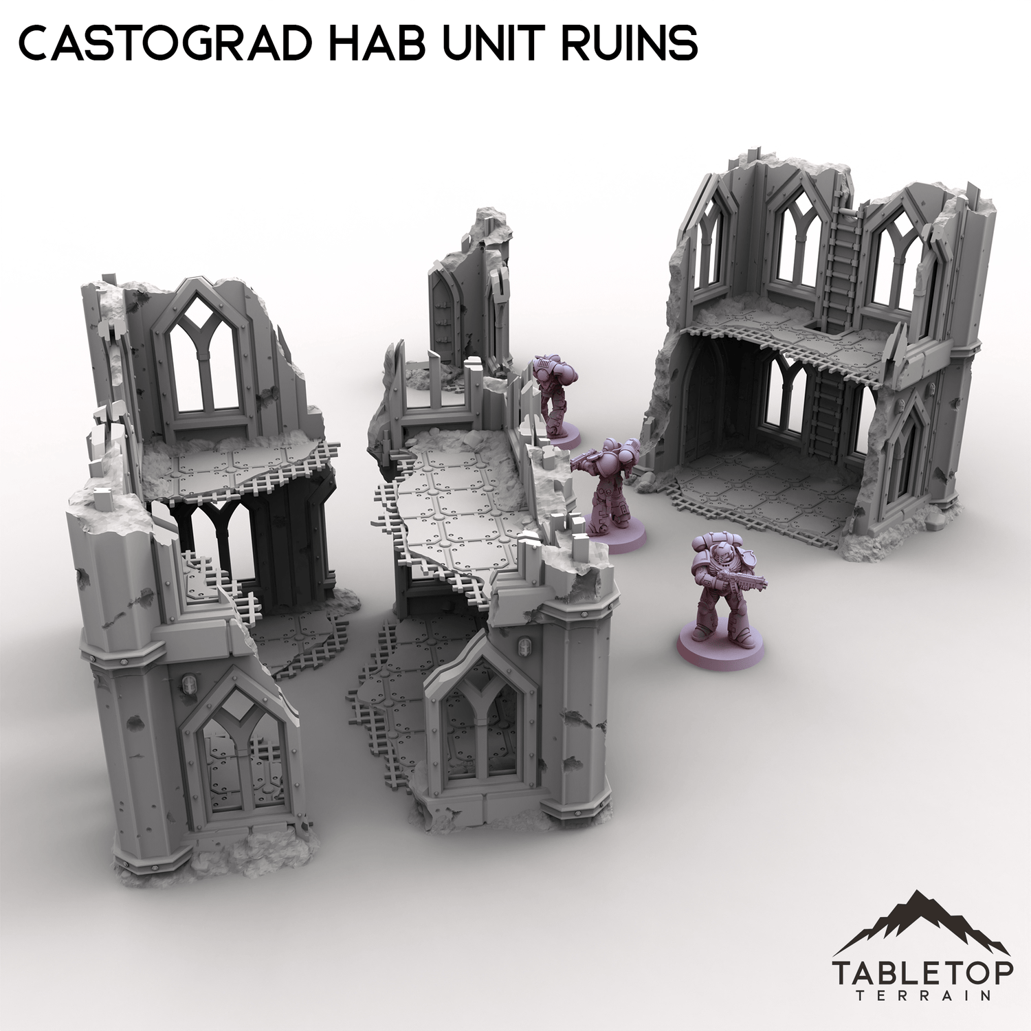 The Castograd Hab Unit Ruins set is a collection of ruined walls and floors, all destroyed by war and fire. The ruins can be placed together to make the shell of one singular larger building, or can be used as ruins scatter and spread out throughout a battlefield.