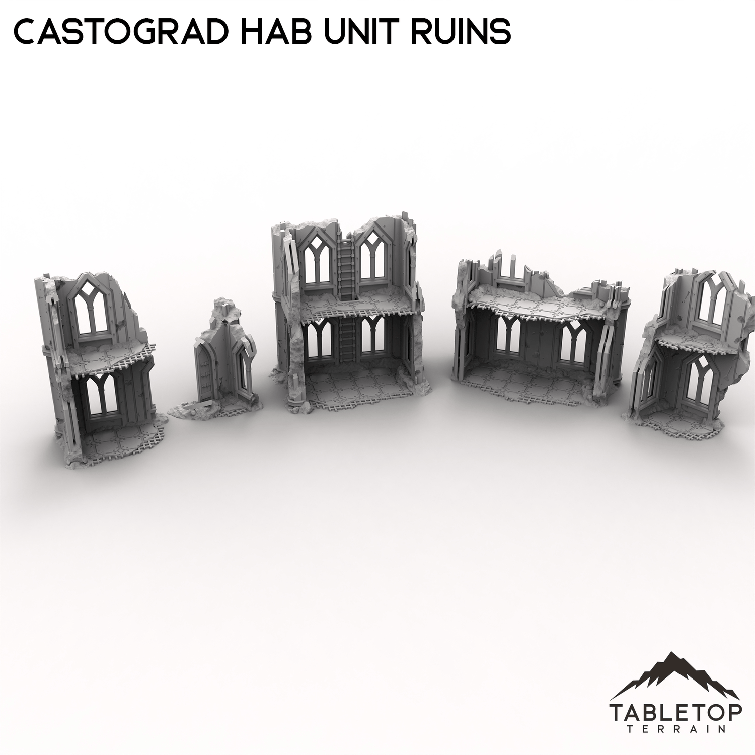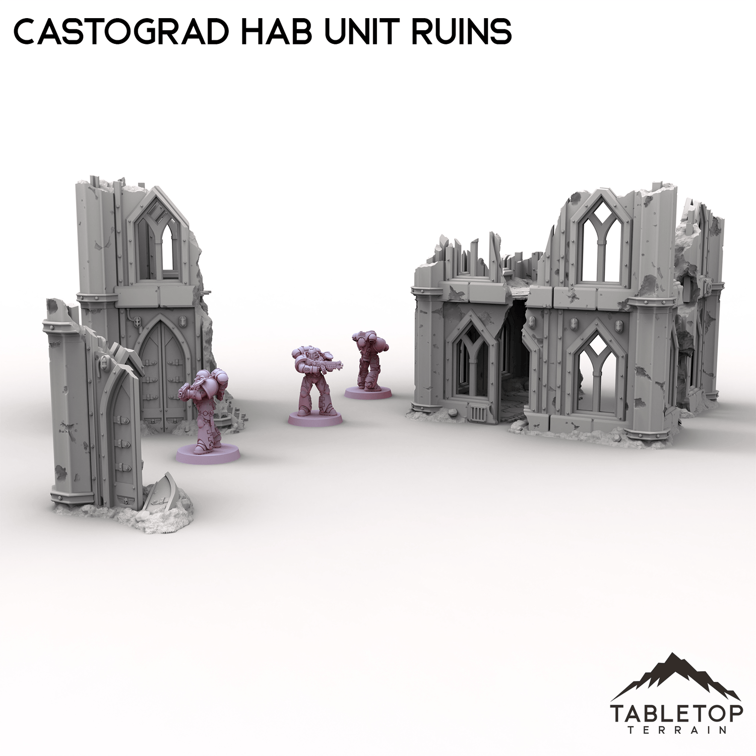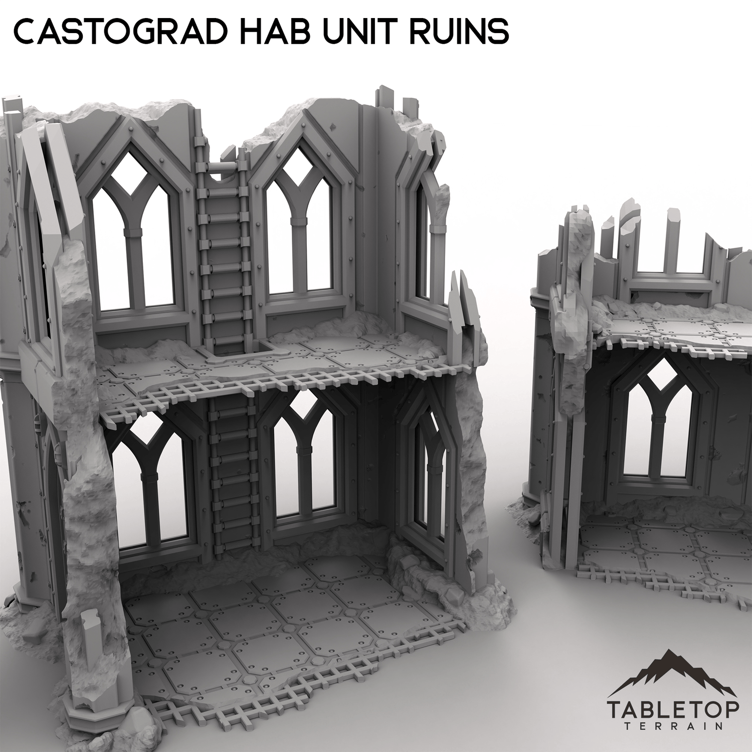 The Castograd Hab Unit Ruins set is a collection of ruined walls and floors, all destroyed by war and fire. The ruins can be placed together to make the shell of one singular larger building, or can be used as ruins scatter and spread out throughout a battlefield.
