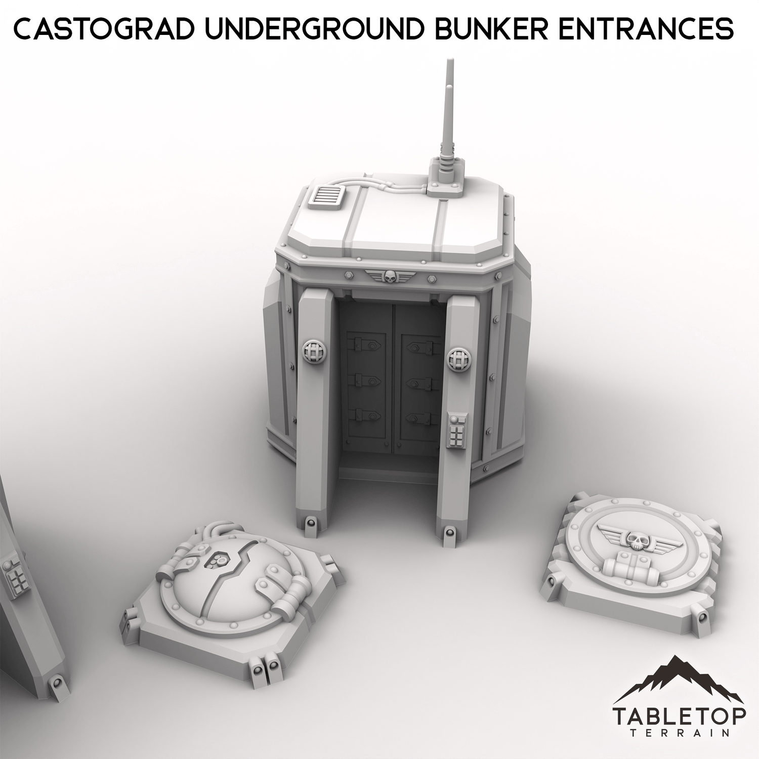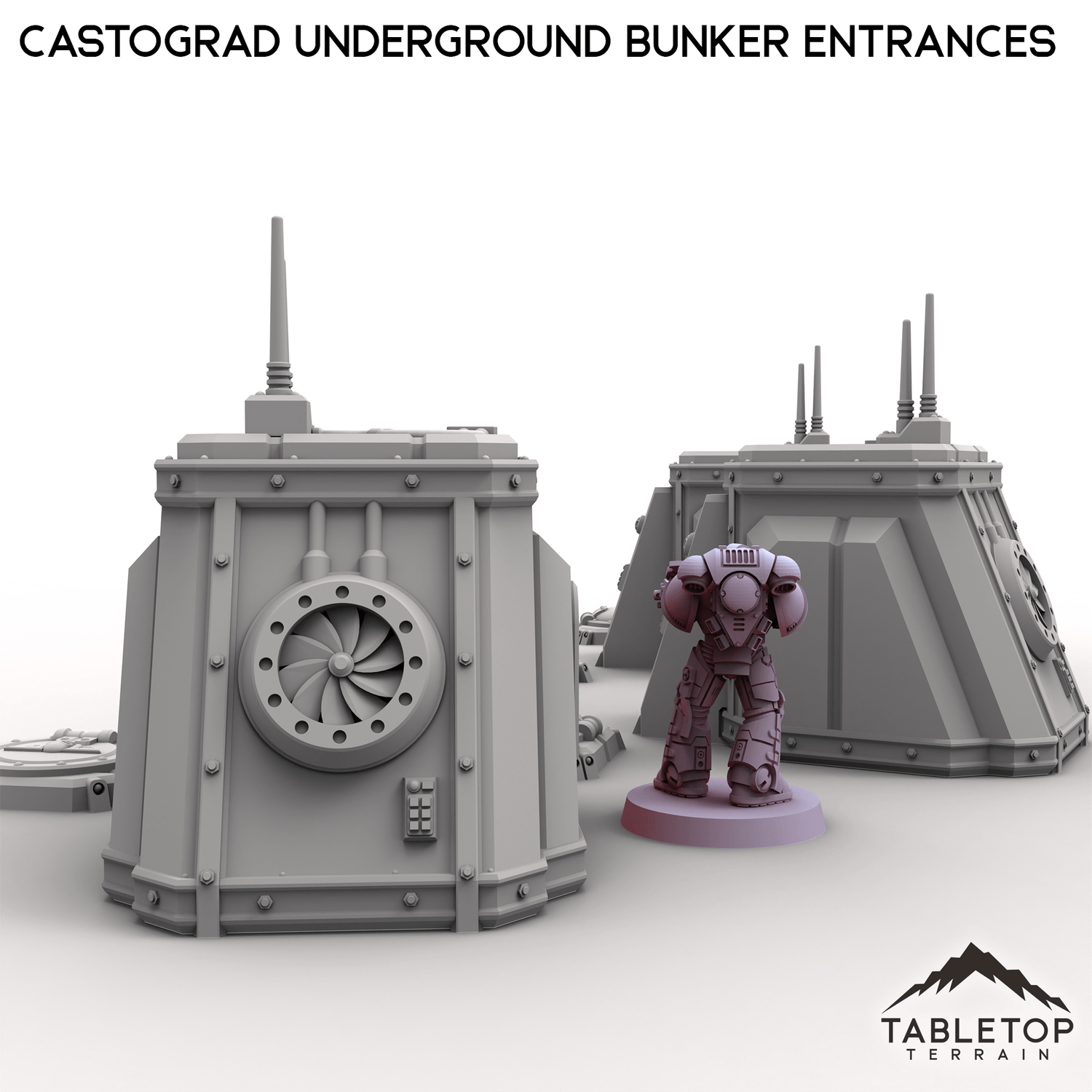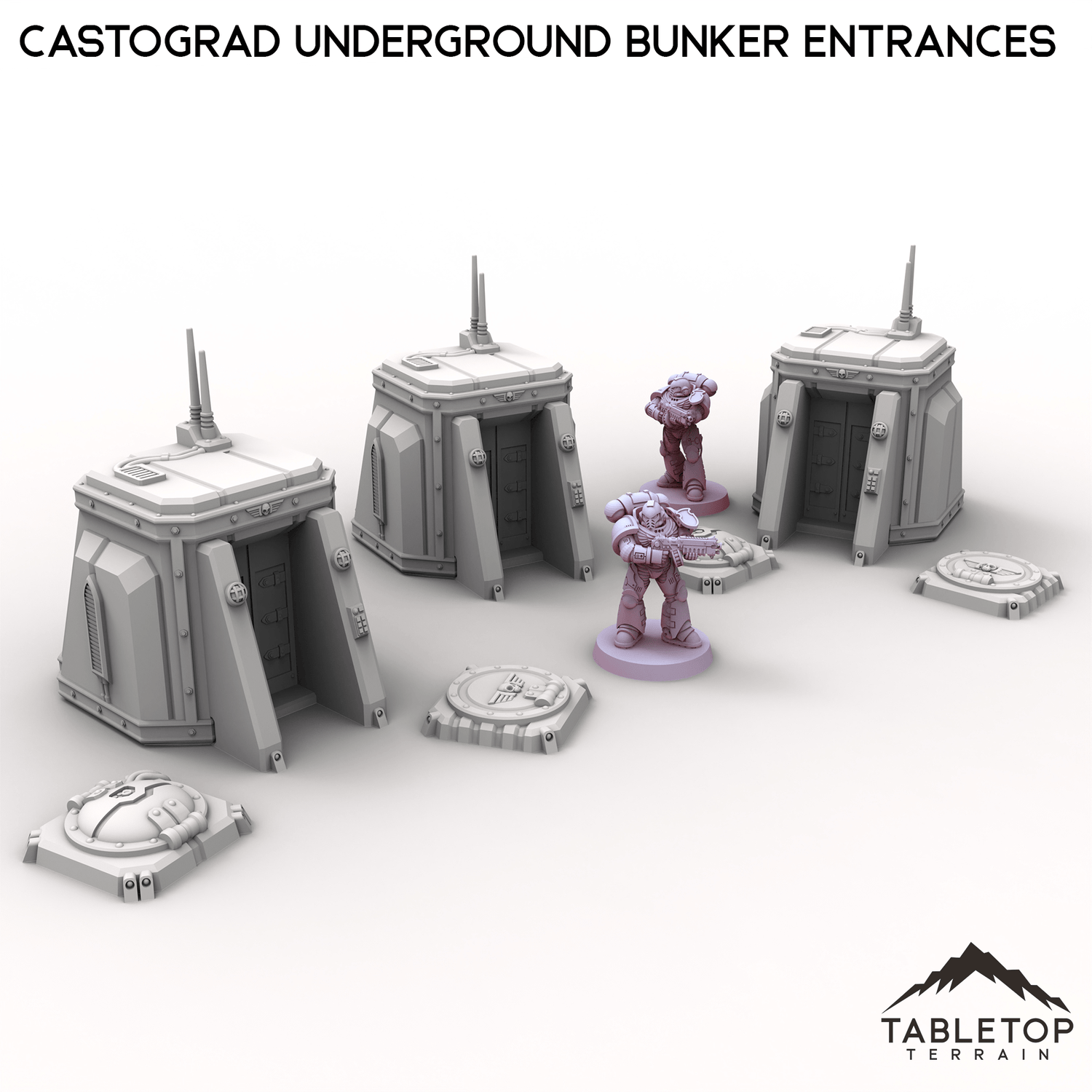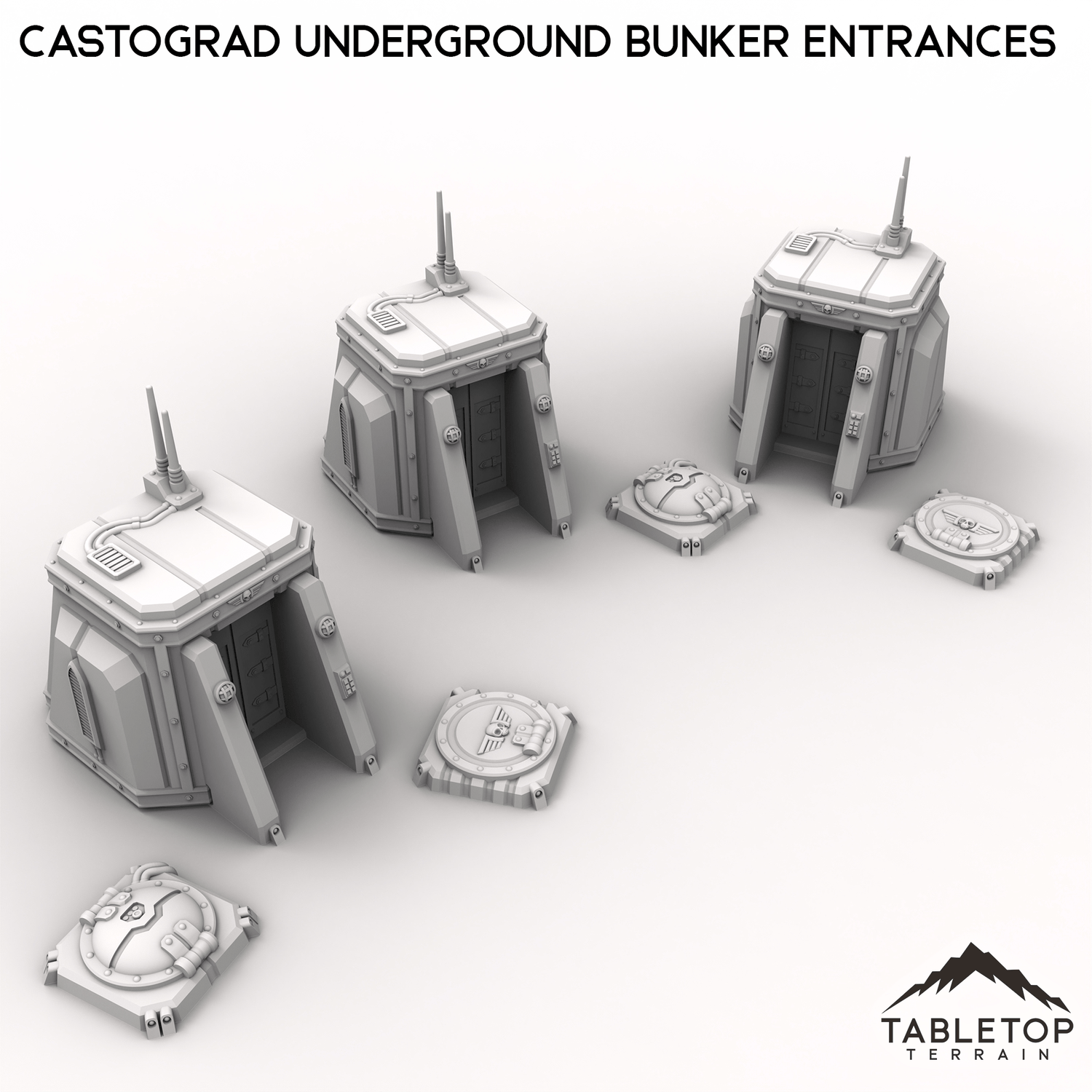 The Castograd Underground Bunker Entrances is a set of 3 bunker entrances, and 4 bunker hatches. They are textured and detailed to match the look of other sets from the Castograd collection. These entrances can work on their own, or are best suited when adding to a larger setup. As an example, adding the entrances throughout a cityscape or near a large base would be a useful way to expanding the usable elements of the tabletop.
