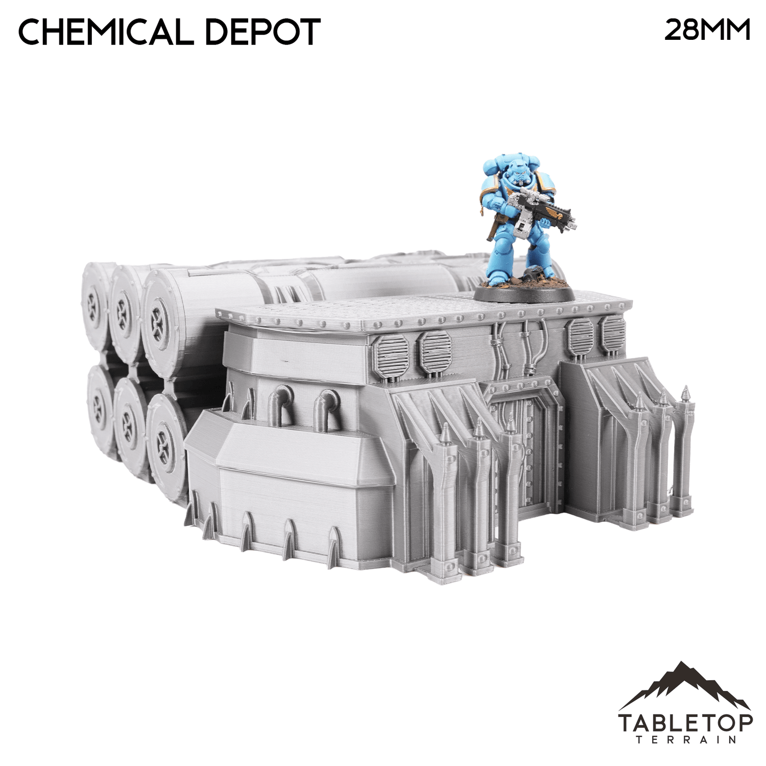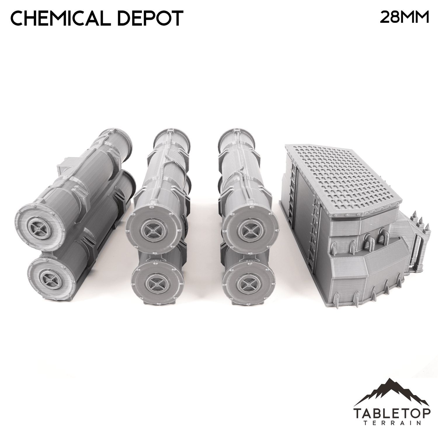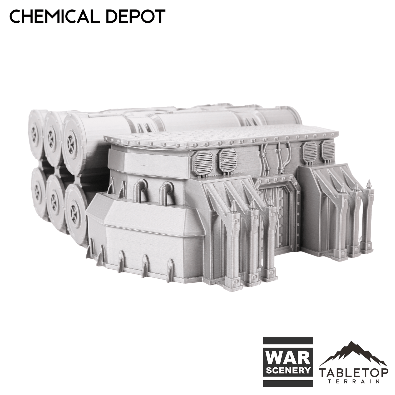 The Chemical Depot is an industrial building with chemical holding tanks. The set is made up of a single building, and 3 racks of chemical barrels. The Chemical Depot set is designed for sci-fi wargames, but can be used with any system.