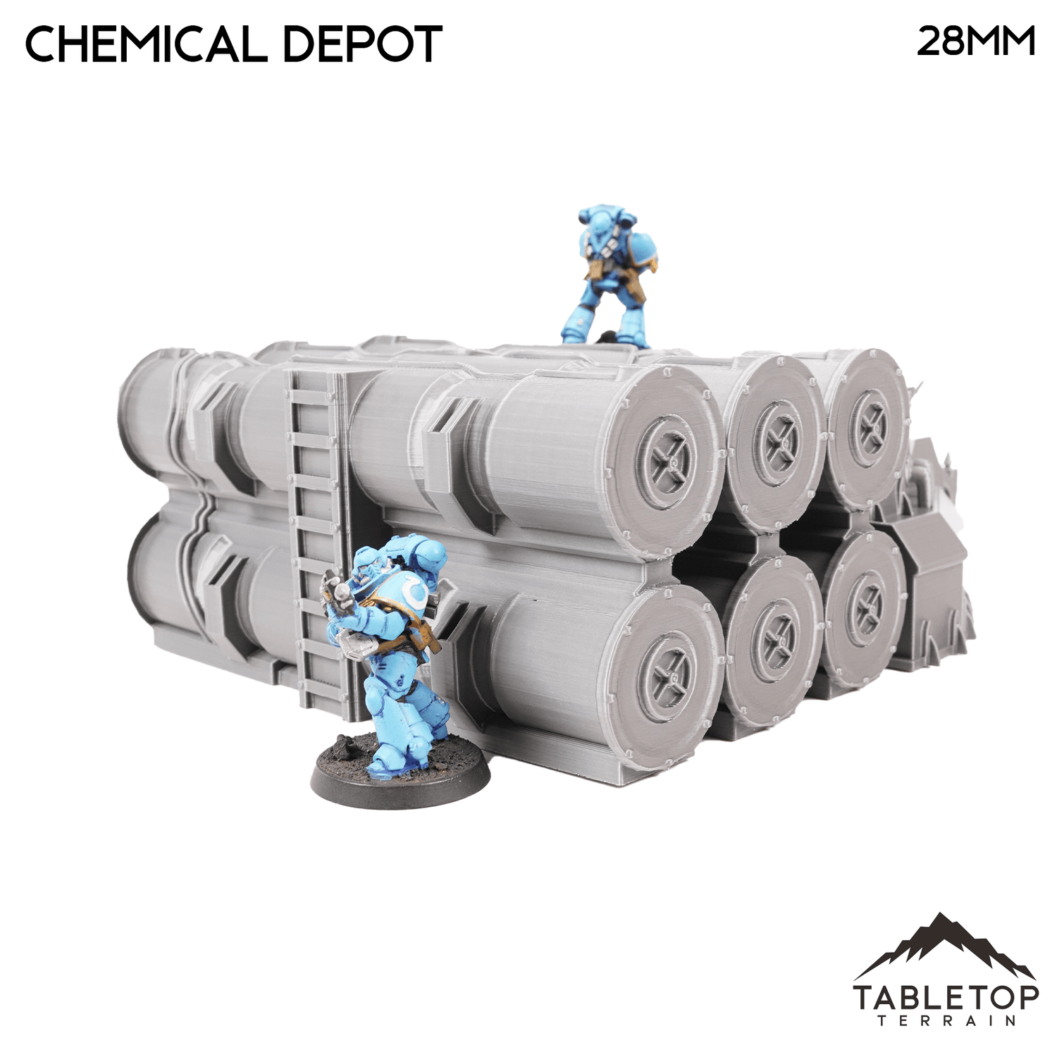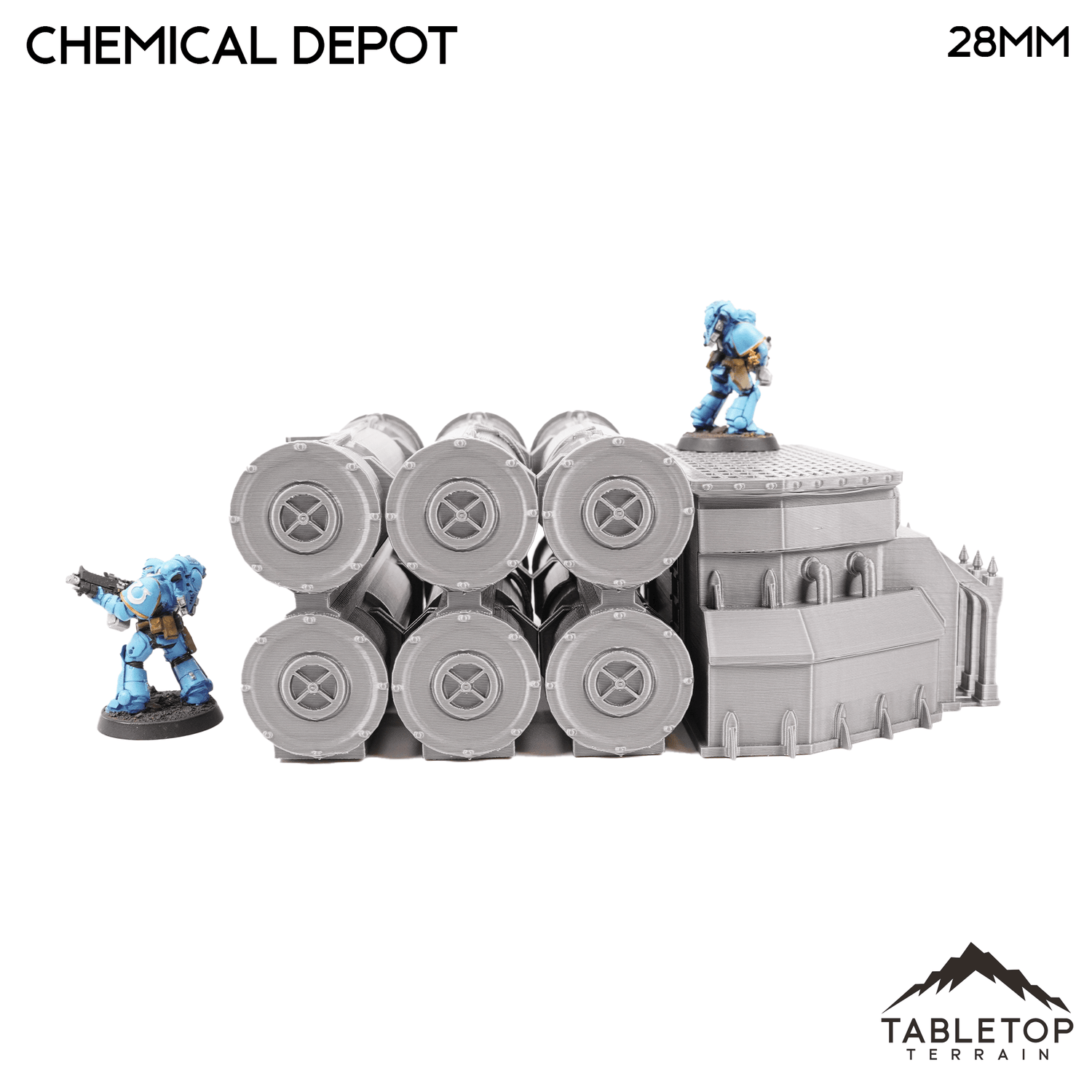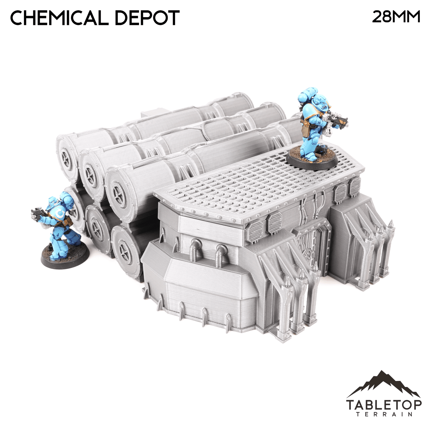 The Chemical Depot is an industrial building with chemical holding tanks. The set is made up of a single building, and 3 racks of chemical barrels. The Chemical Depot set is designed for sci-fi wargames, but can be used with any system.