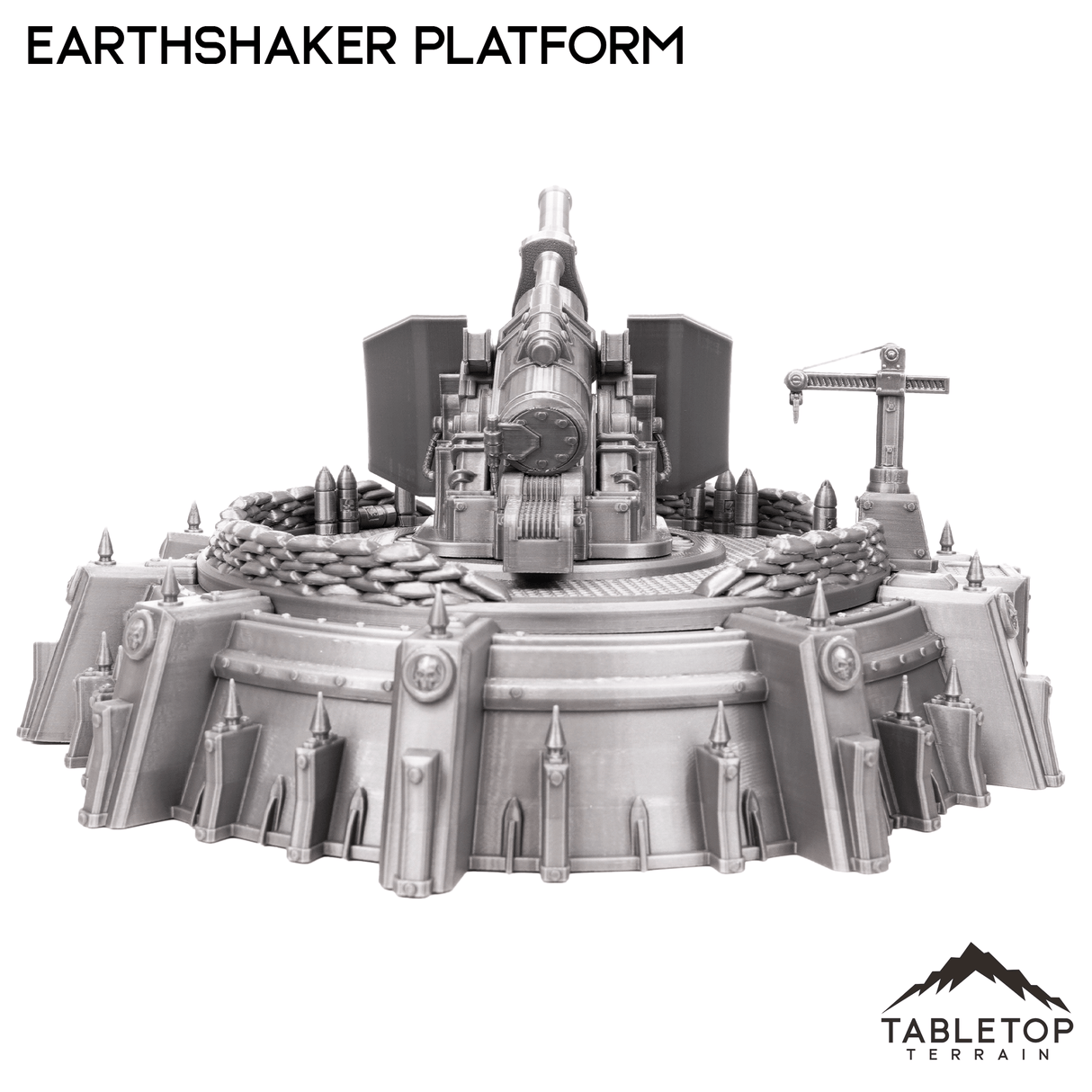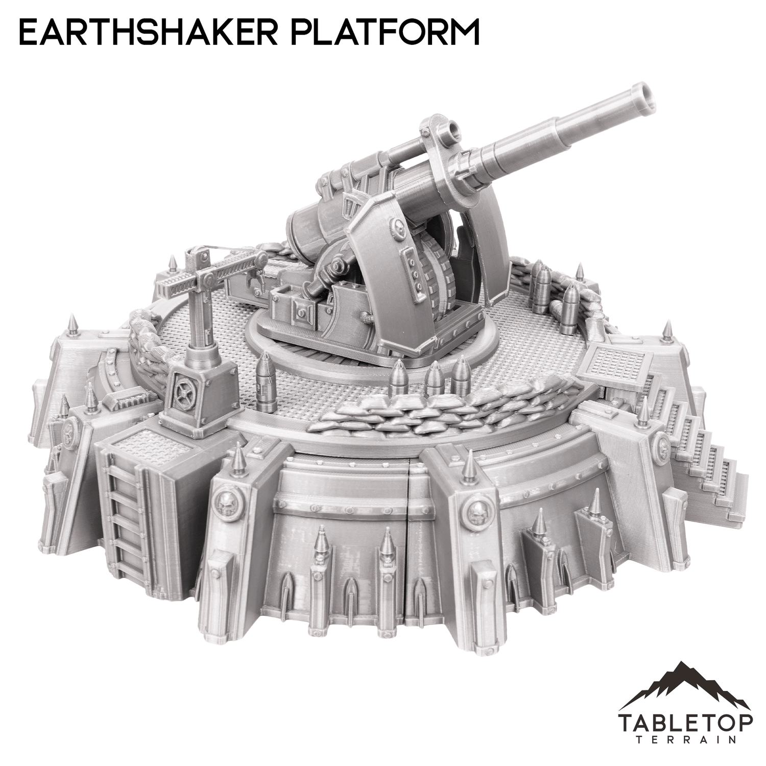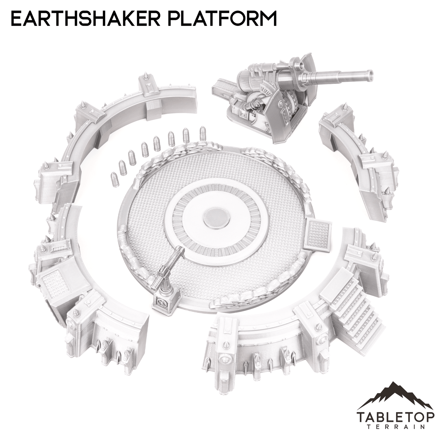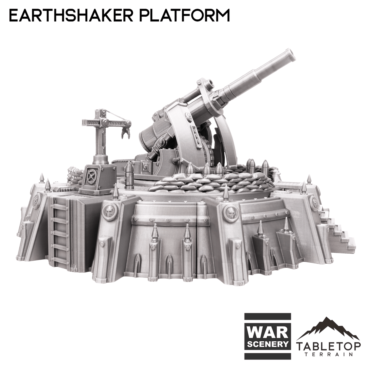 The Earthshaker Platform is a large articulating cannon on an artillery platform. It comes with the large cannon, crane to load the shells, and stairs up to the platform.