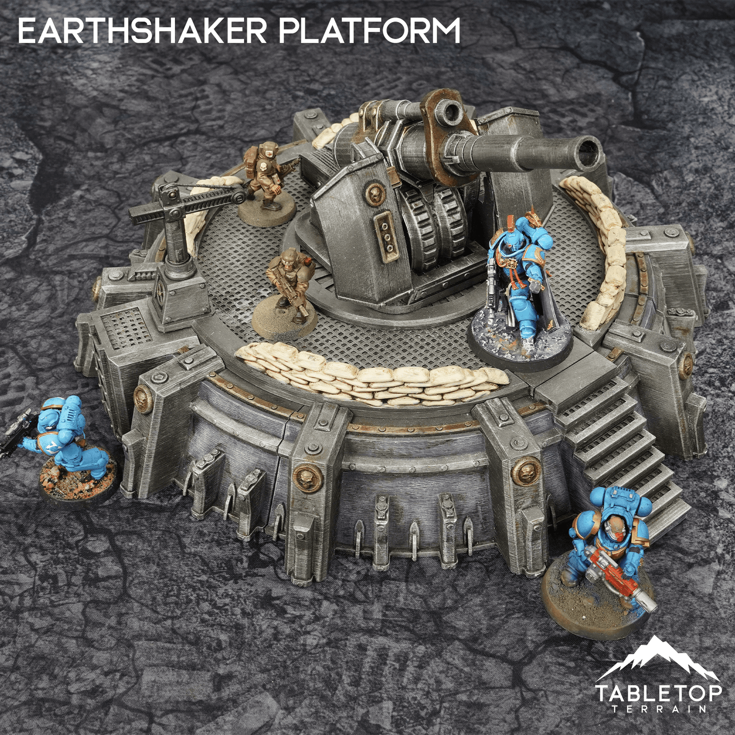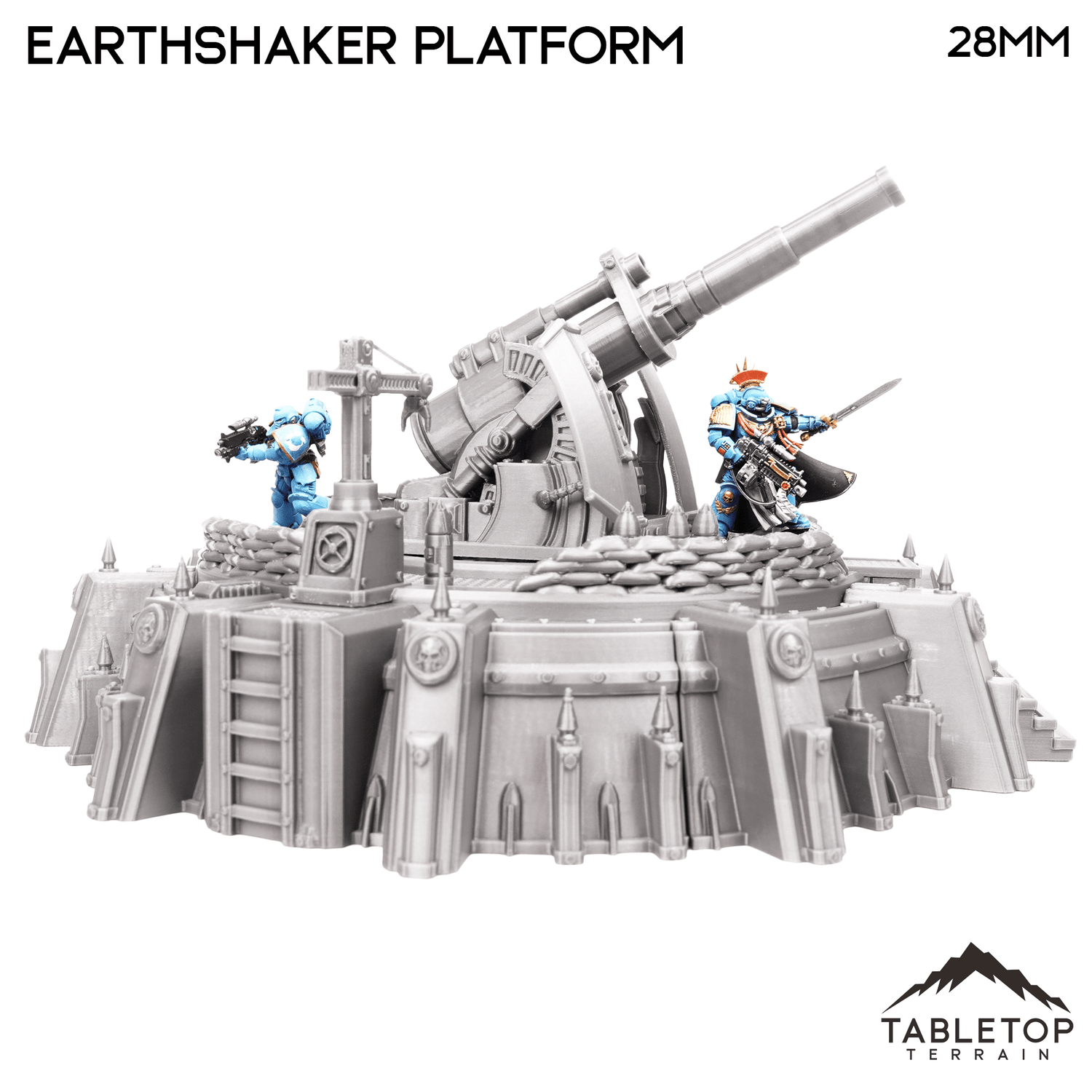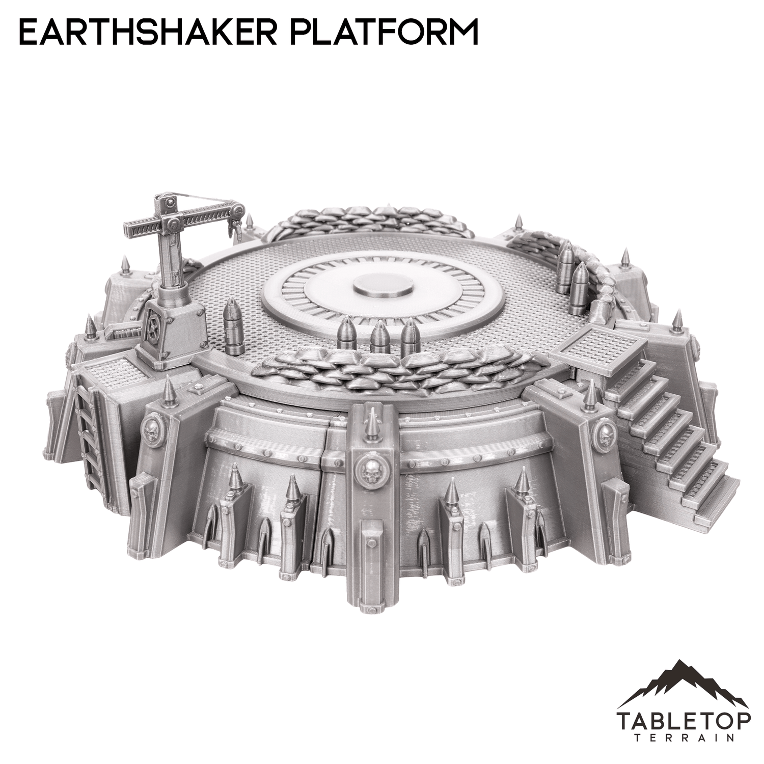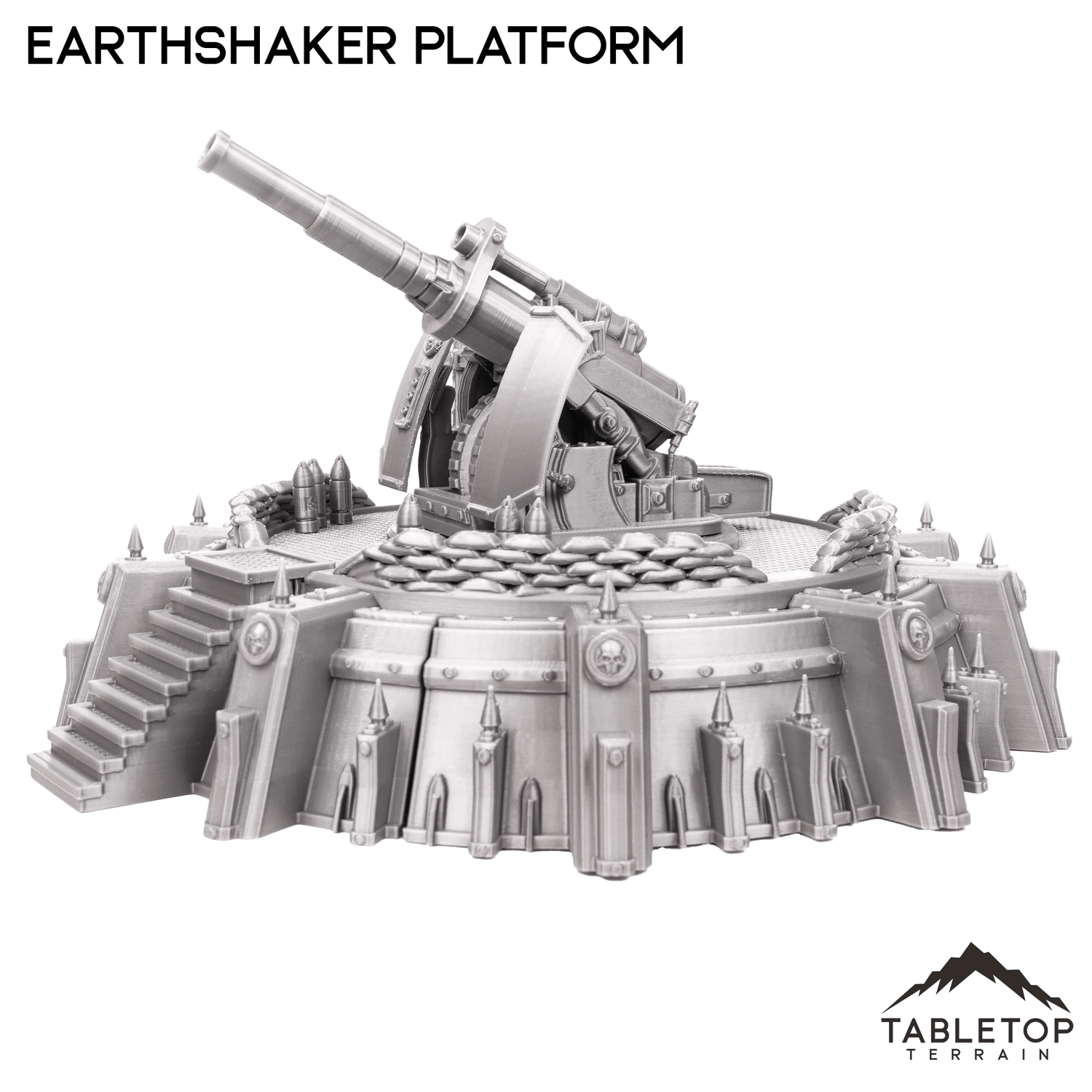 The Earthshaker Platform is a large articulating cannon on an artillery platform. It comes with the large cannon, crane to load the shells, and stairs up to the platform.