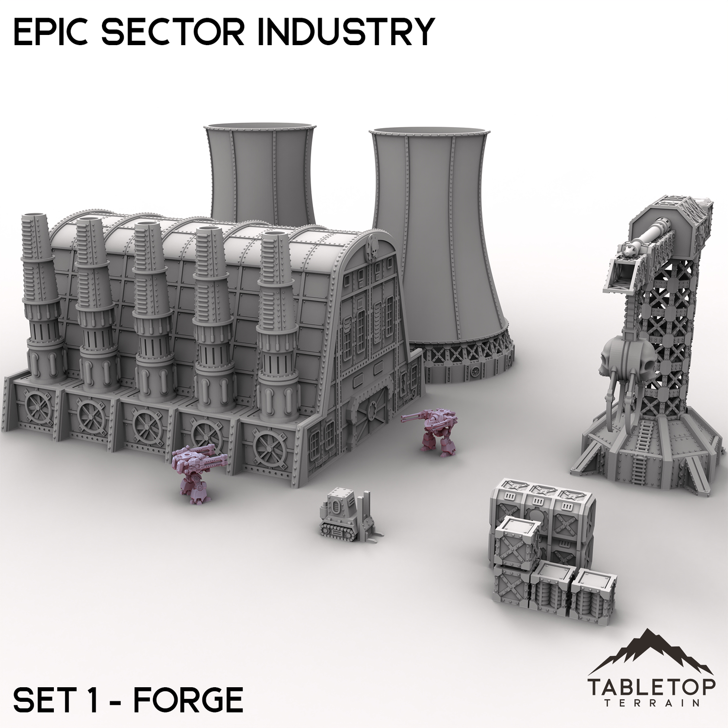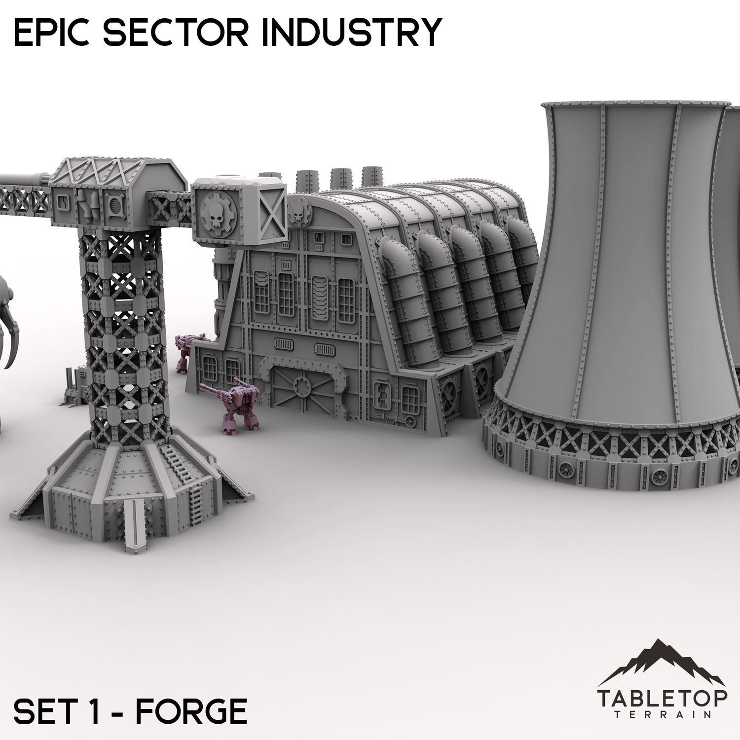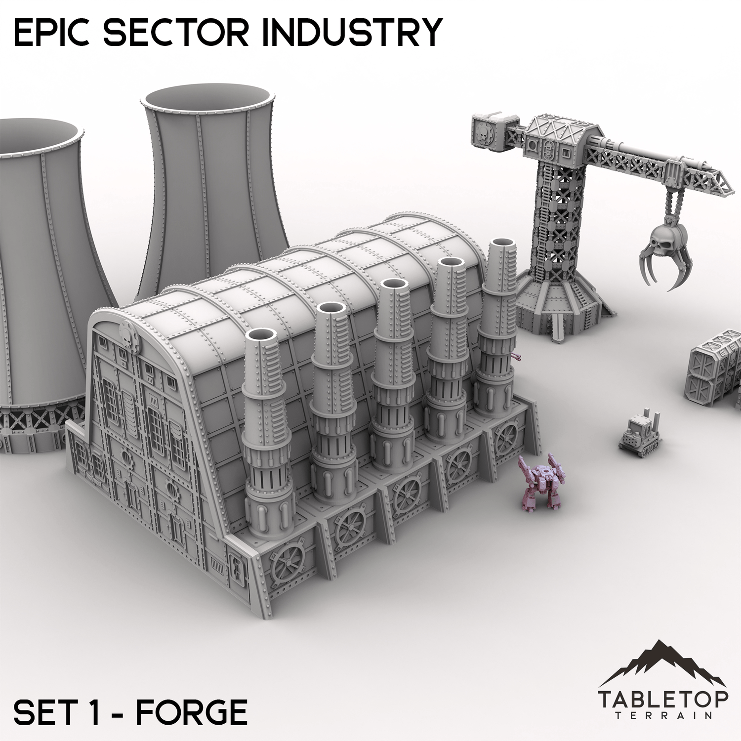 The Industrial Forge is a sprawling manufacturing hub built for heavy industry and wartime production. Featuring massive furnaces crowned with chimneys, looming cooling towers, power conduits, and an articulated crane for heavy lifting, this set defines the heart of an industrial district.