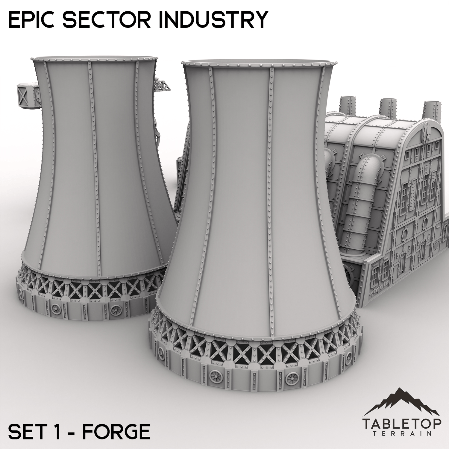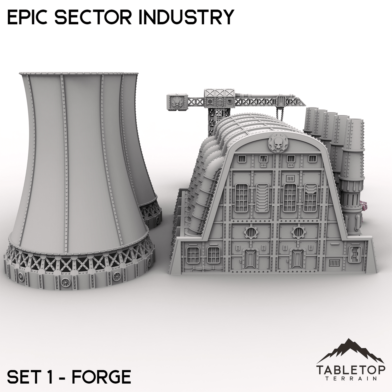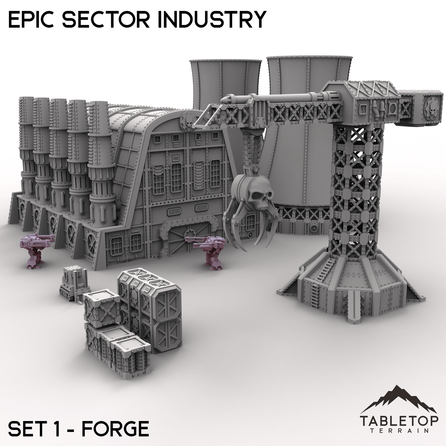 The Industrial Forge is a sprawling manufacturing hub built for heavy industry and wartime production. Featuring massive furnaces crowned with chimneys, looming cooling towers, power conduits, and an articulated crane for heavy lifting, this set defines the heart of an industrial district.