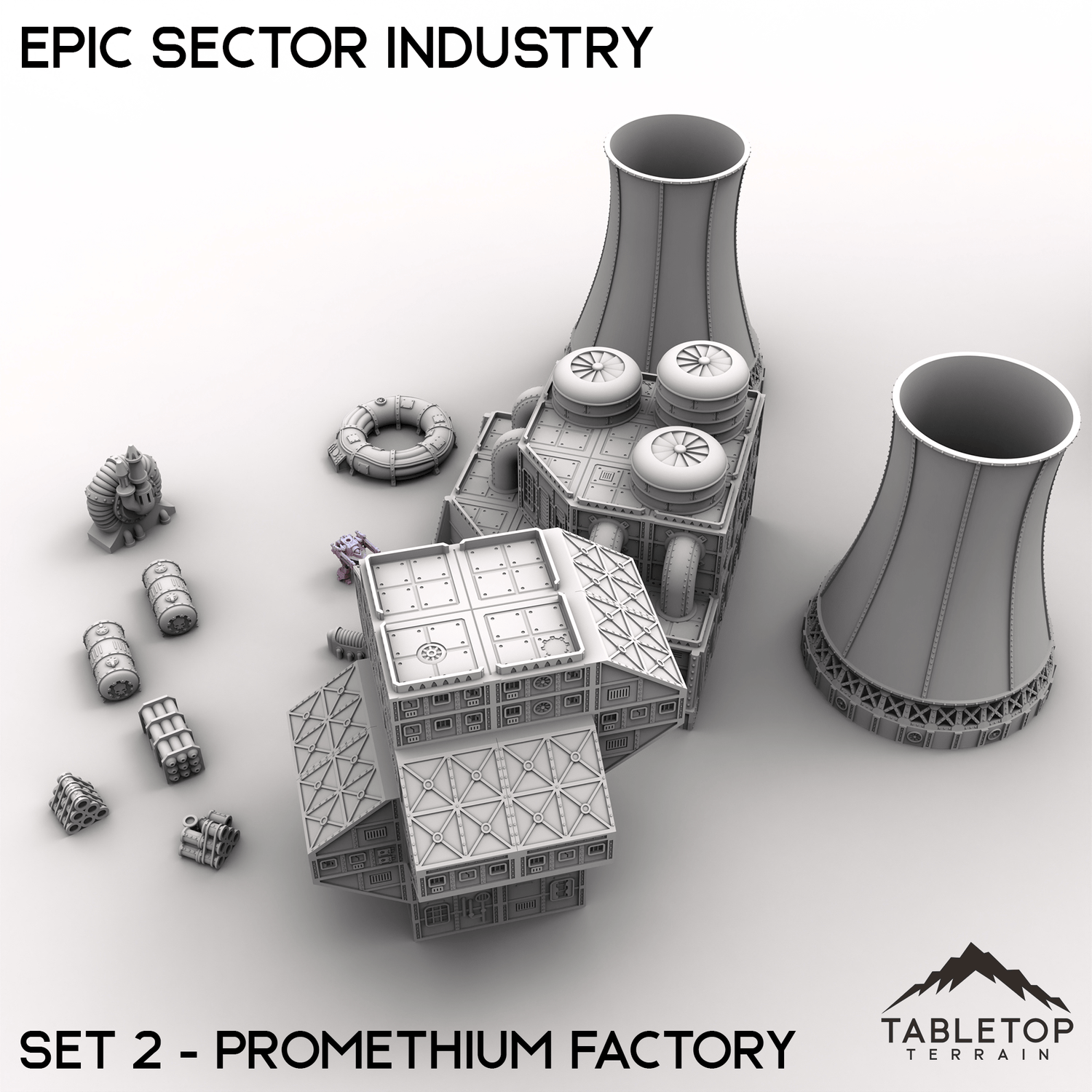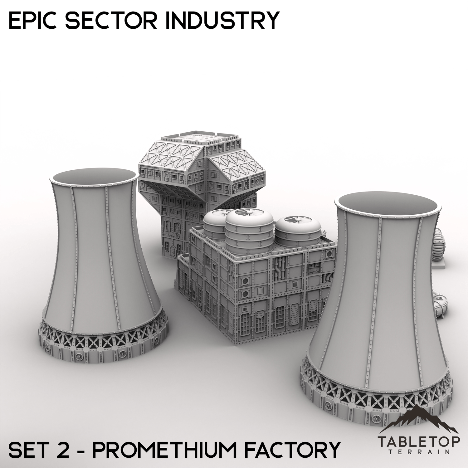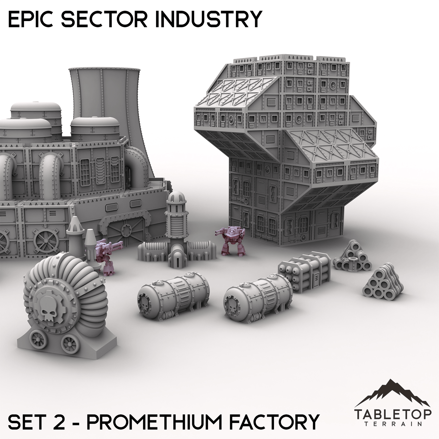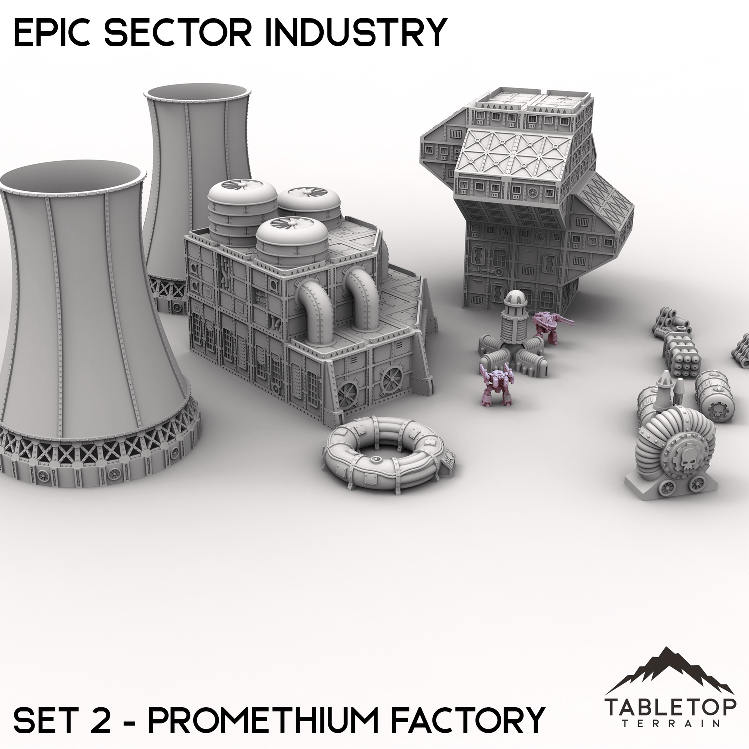 The Promethium Factory is a sprawling industrial facility dedicated to the extraction, refining, and storage of volatile promethium fuel. It features massive reactor towers, cooling stacks, multi-level processing plants, and scatter components like pipes and storage tanks.