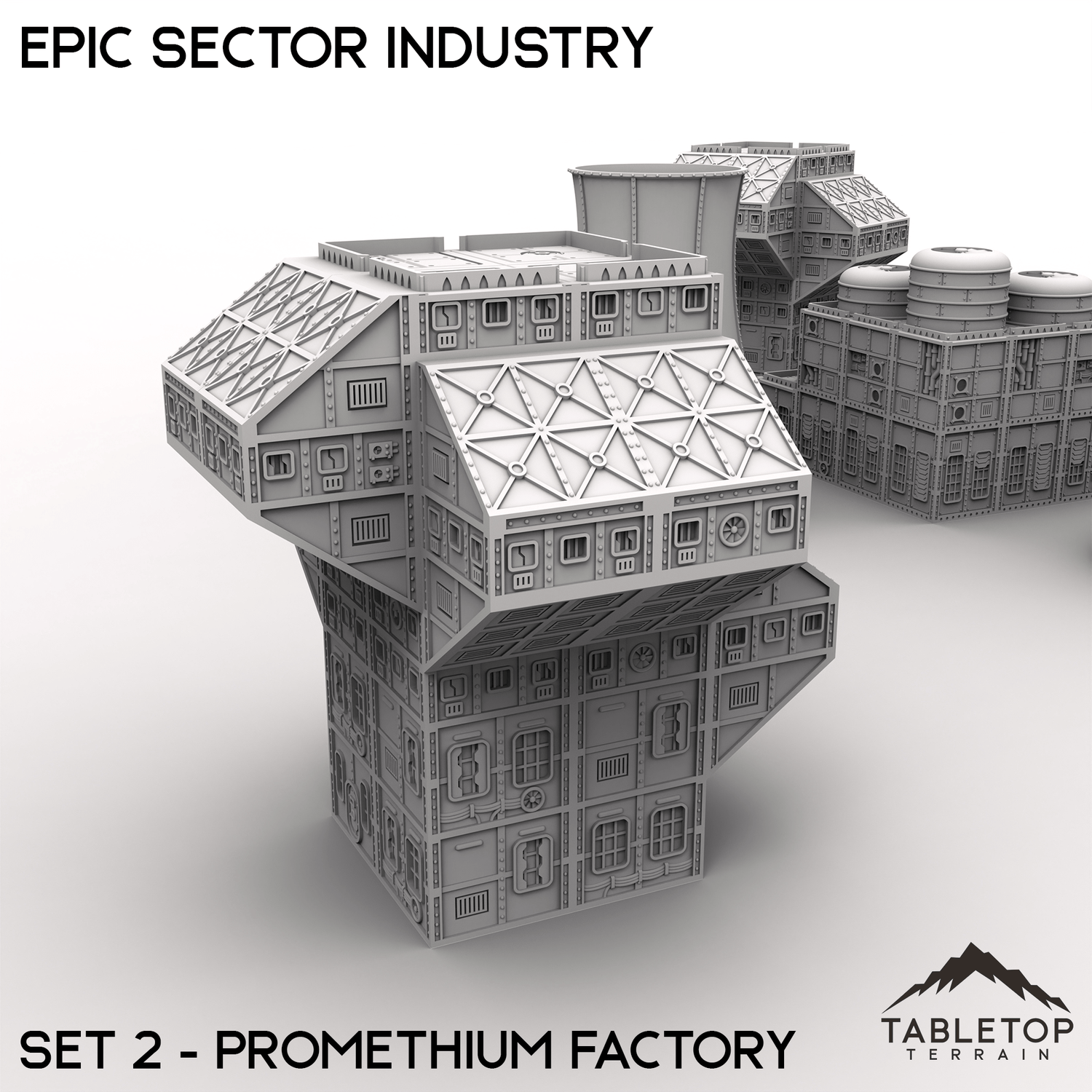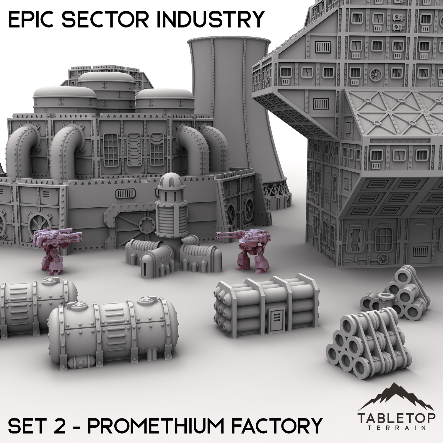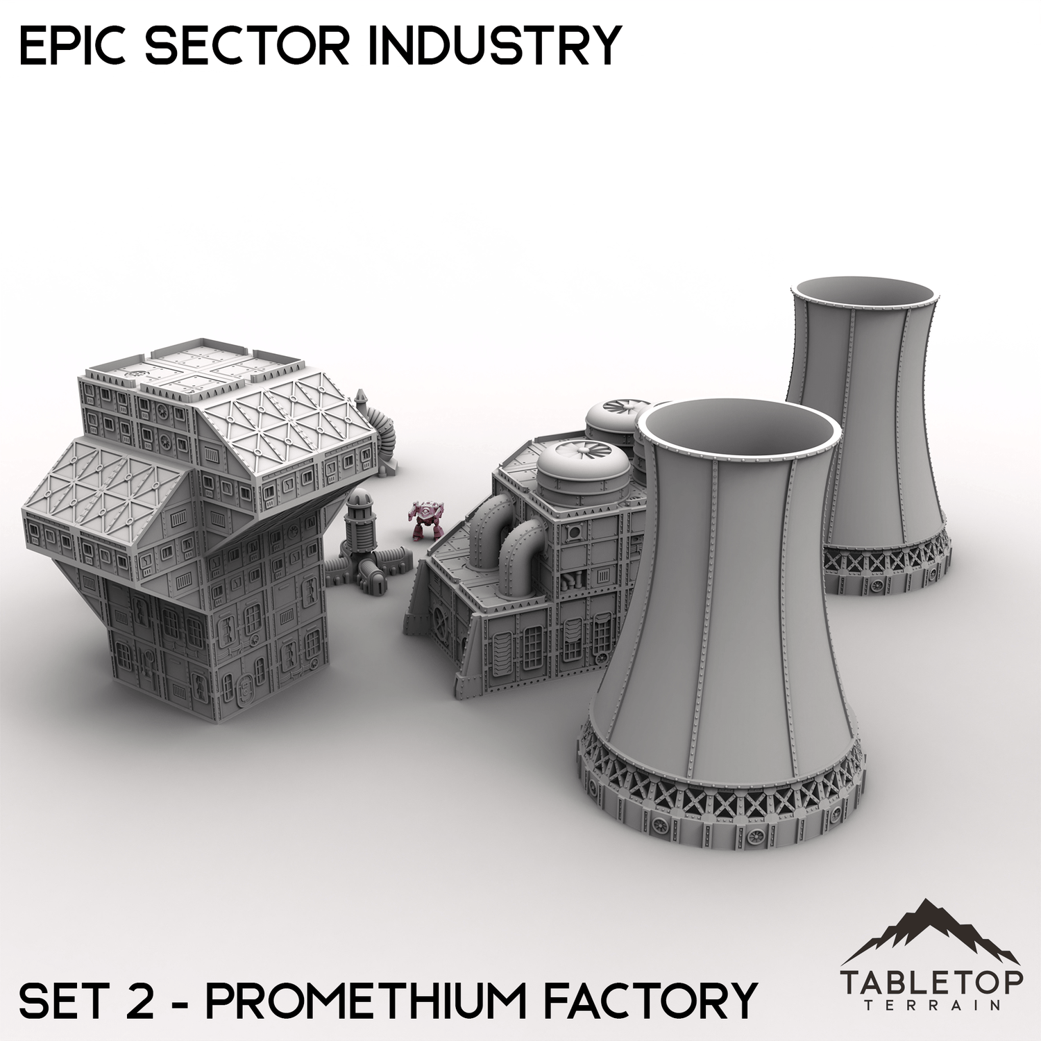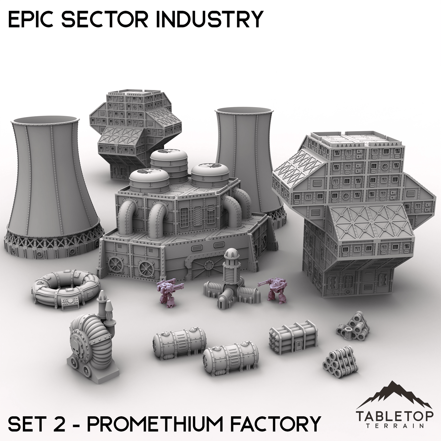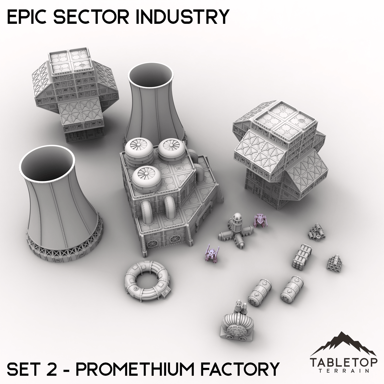 The Promethium Factory is a sprawling industrial facility dedicated to the extraction, refining, and storage of volatile promethium fuel. It features massive reactor towers, cooling stacks, multi-level processing plants, and scatter components like pipes and storage tanks.