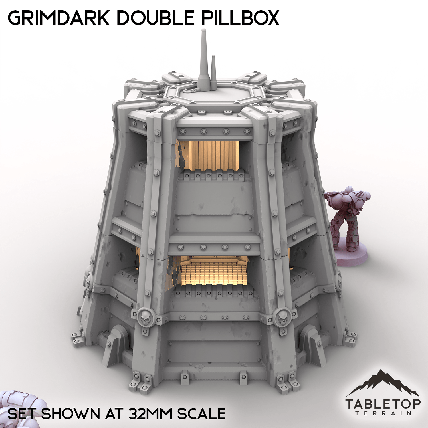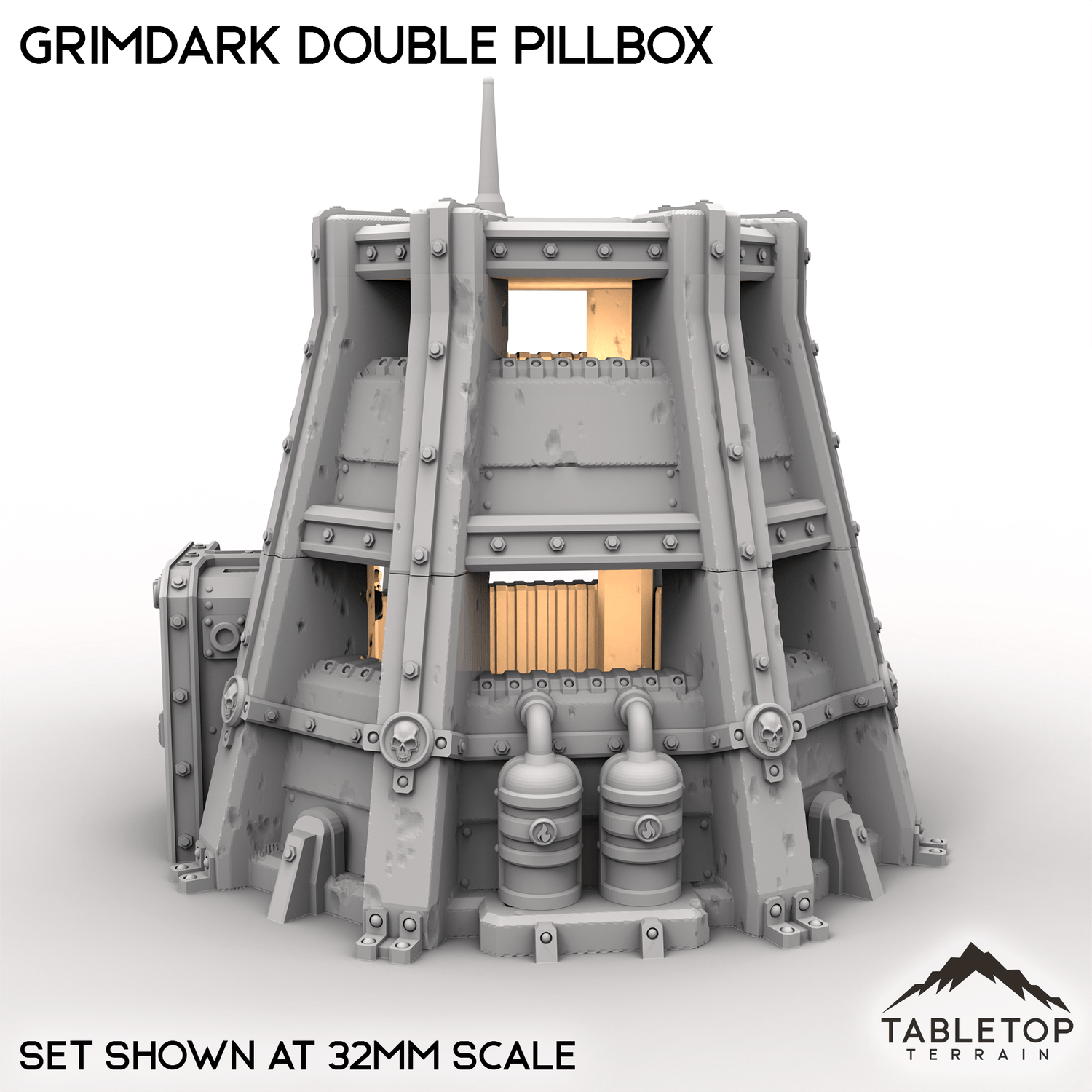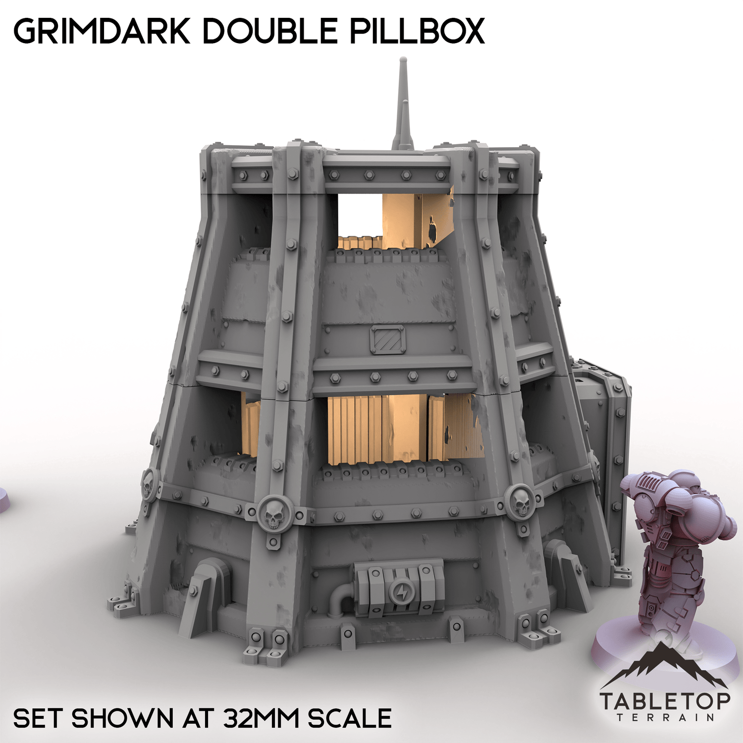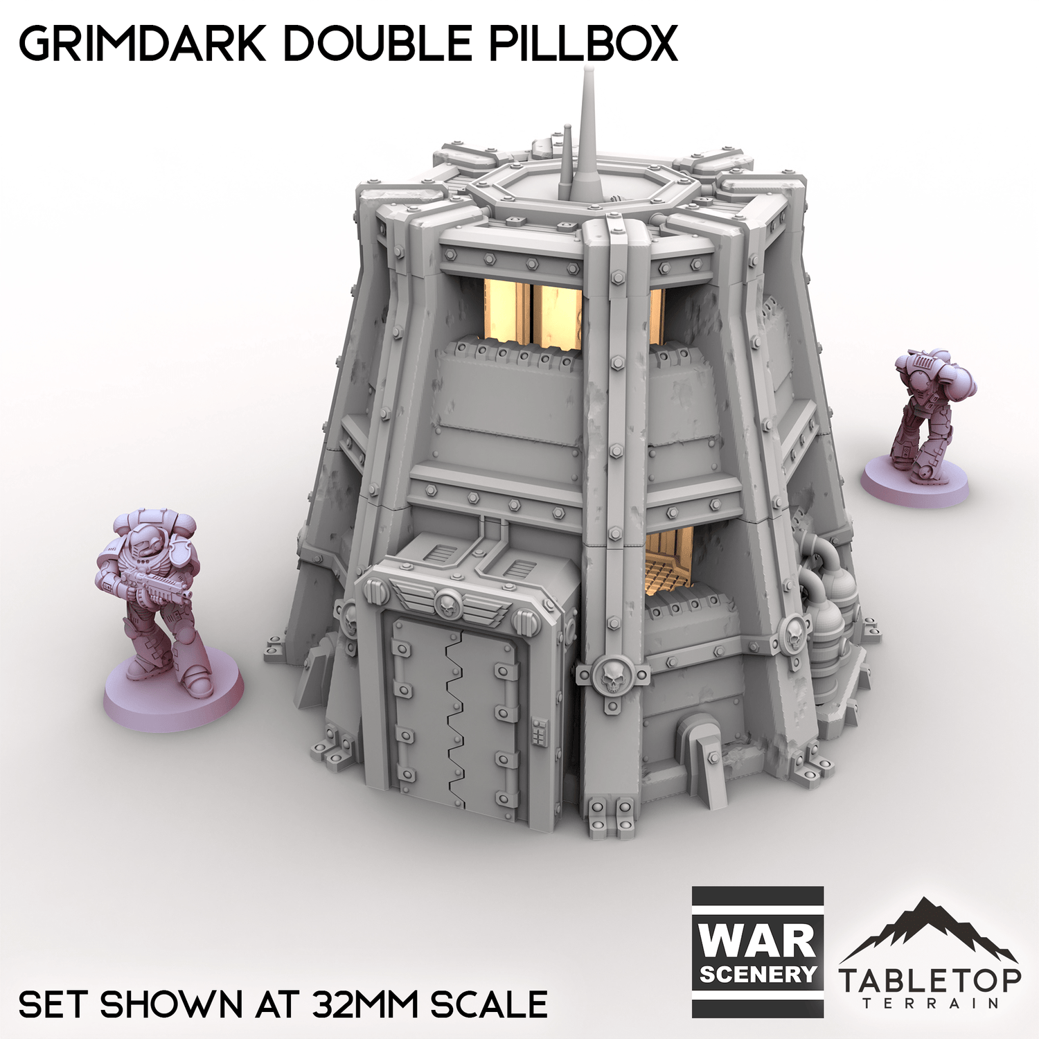 The Grimdark Double Pillbox is a double story infantry bunker with three removable parts. The middle bunker is removable from the bottom floor, as is the top roof. It is designed to give troops inside cover and open shooting lanes to the enemy.