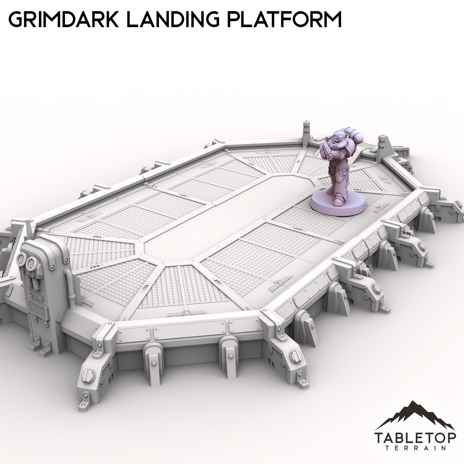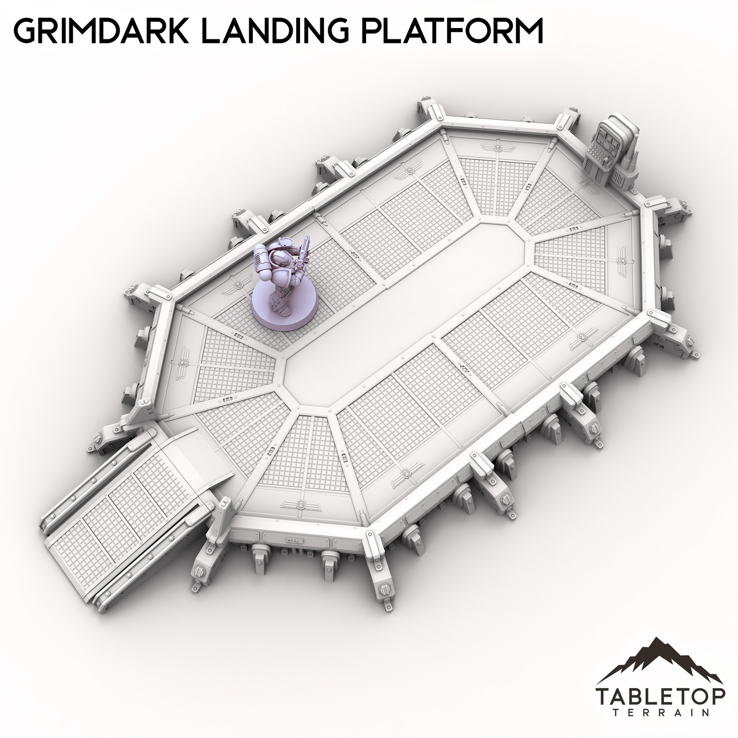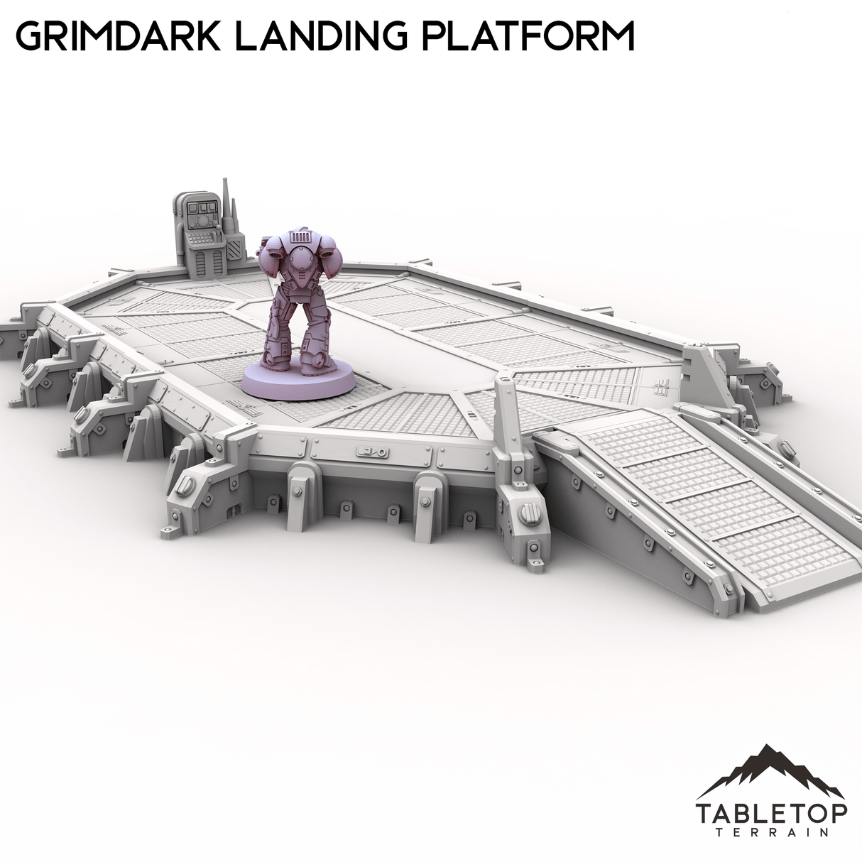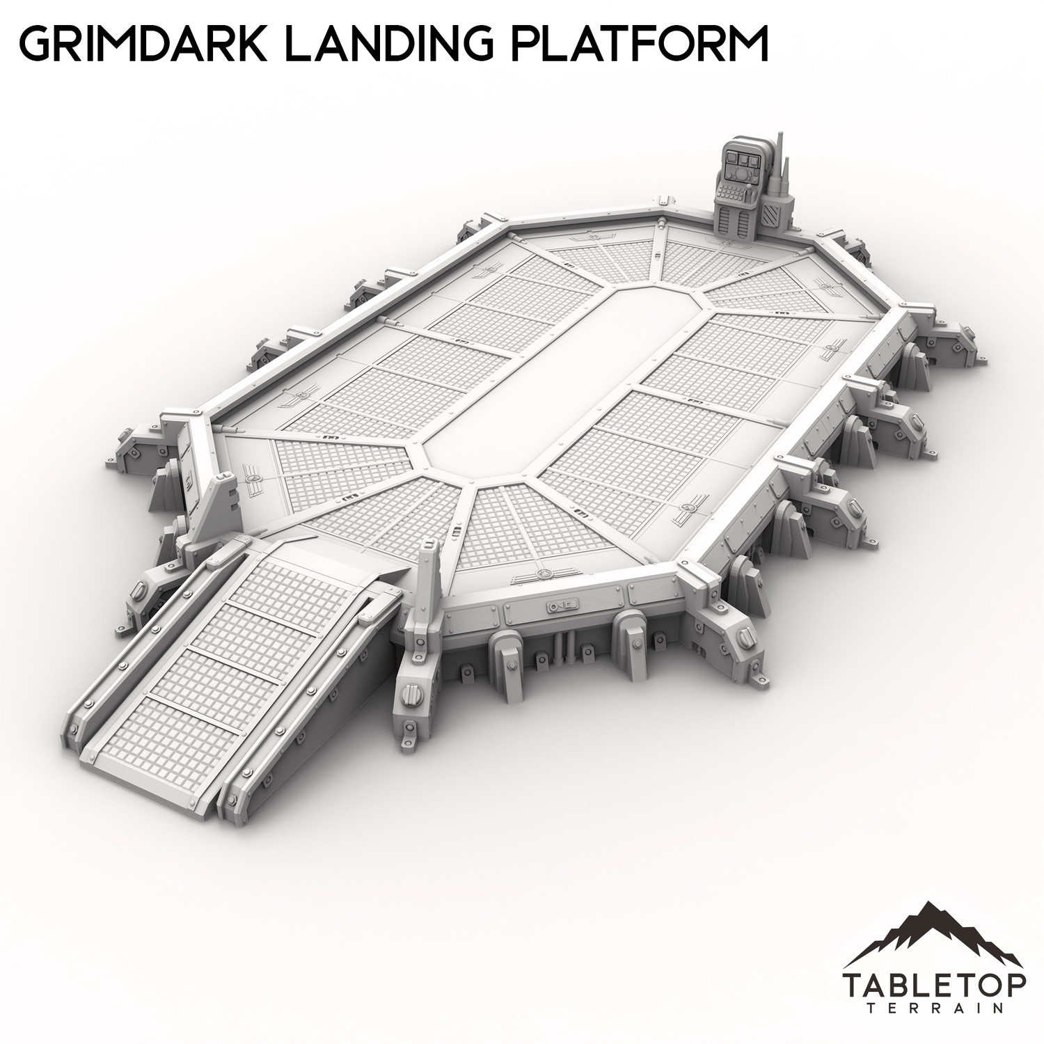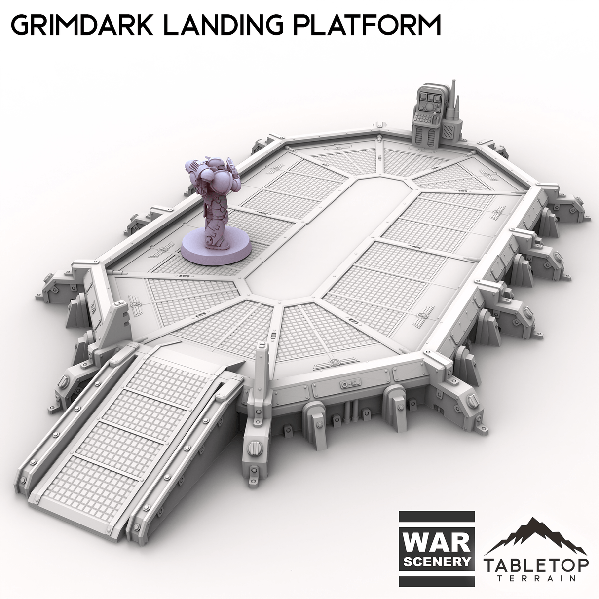 The Grimdark Landing Platform is a large landing pad with control station and ramp for infantry to climb up. If you are looking for a smaller version, check out the Grimdark Landing Pad.