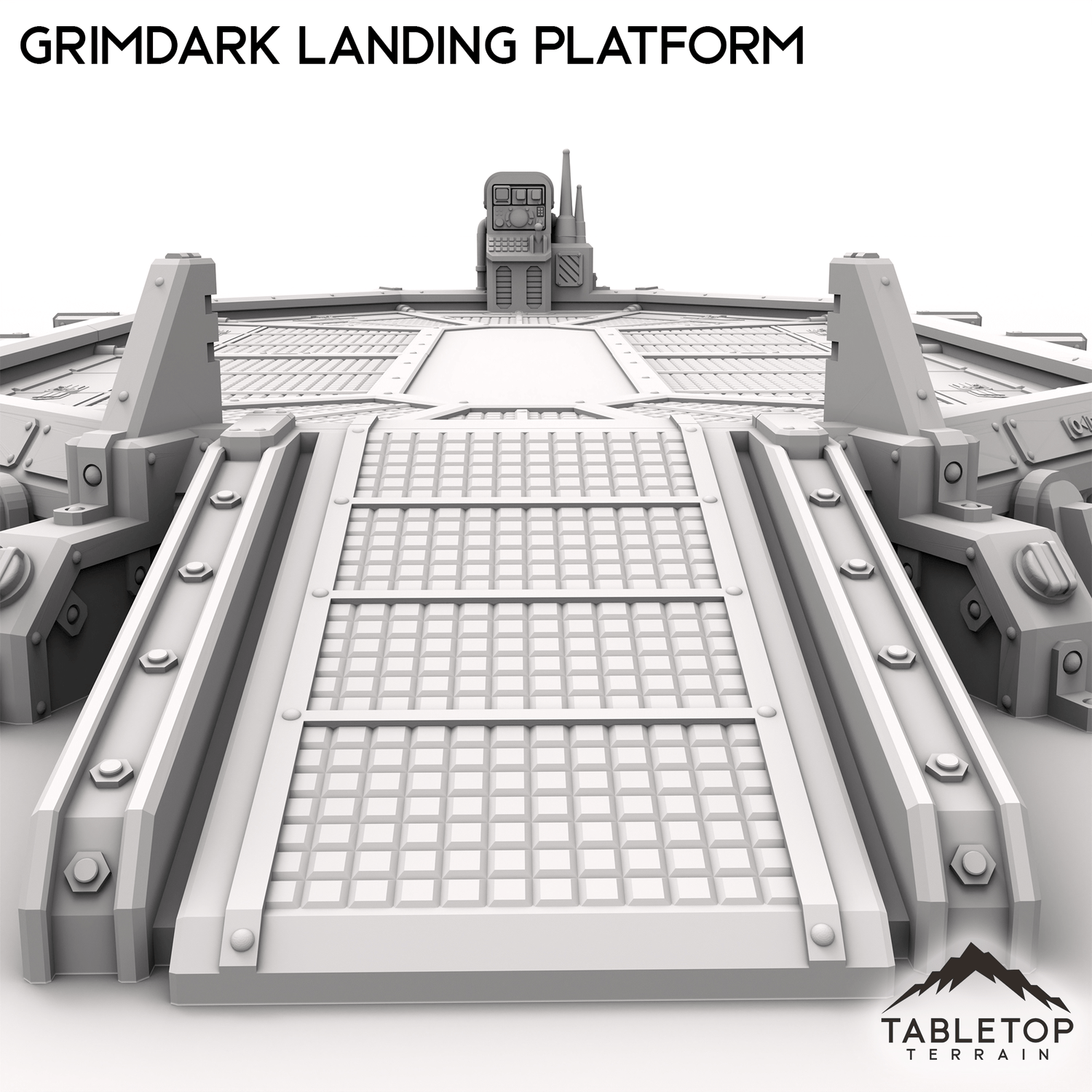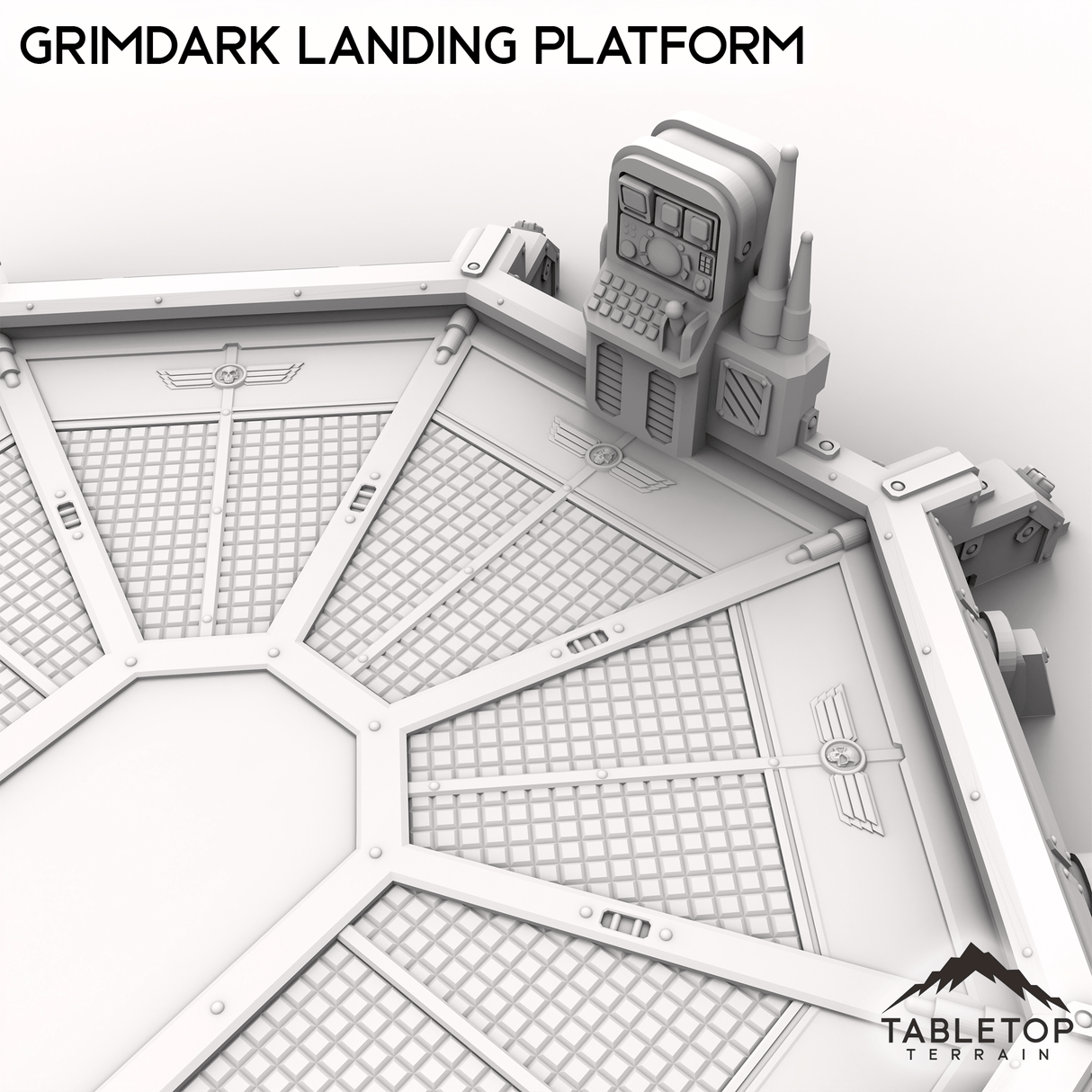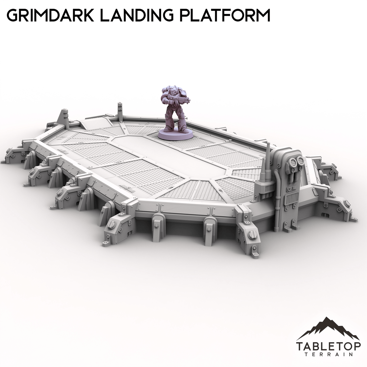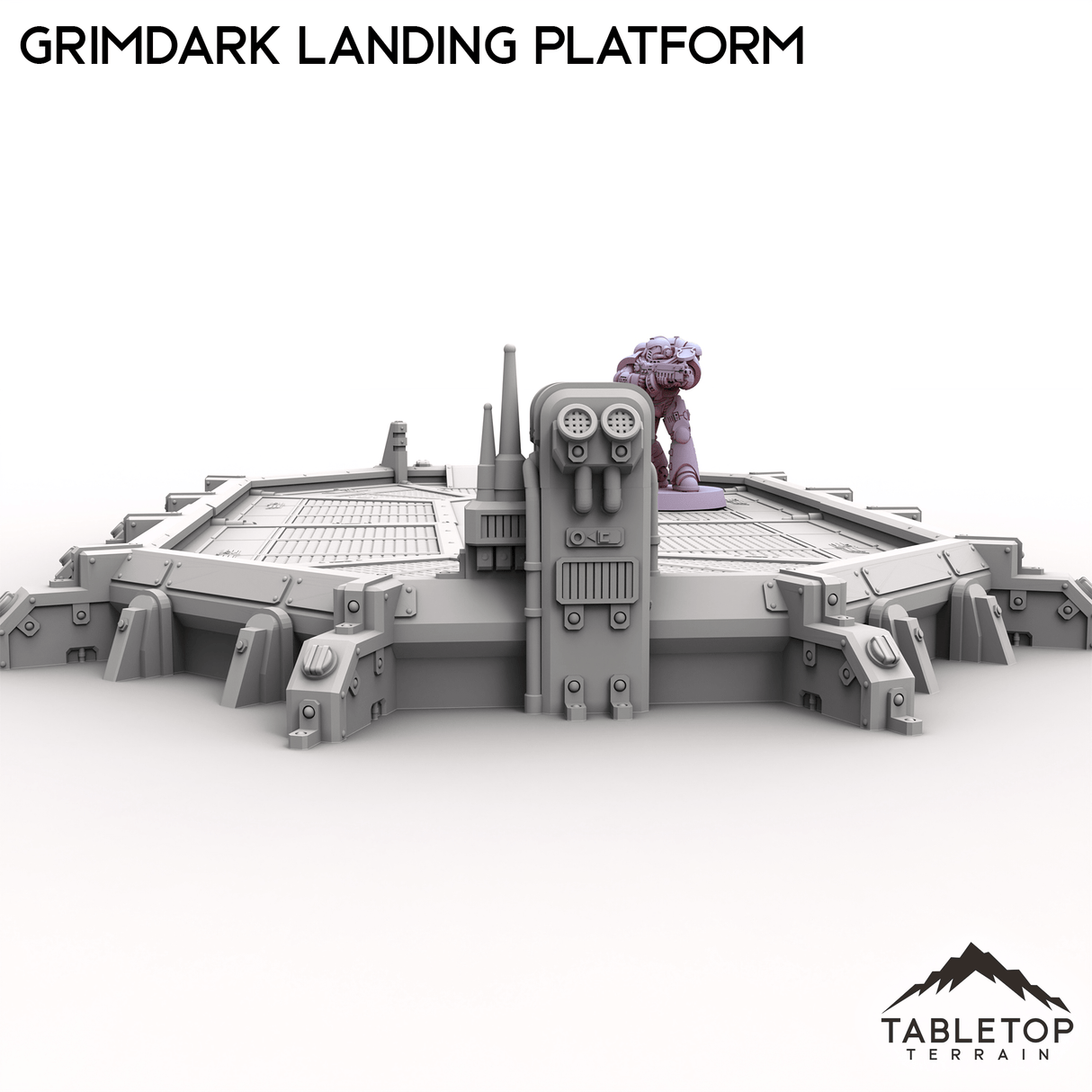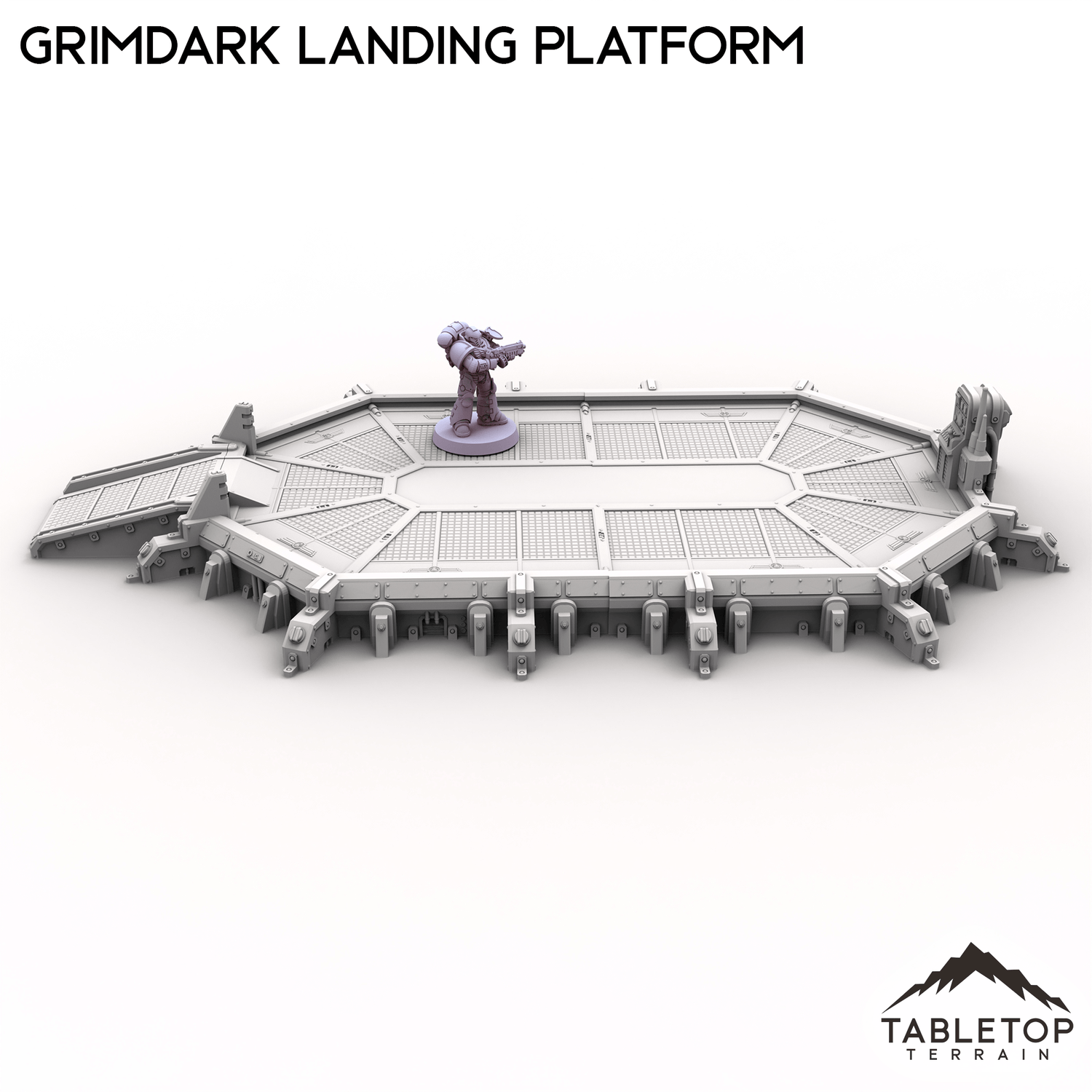 The Grimdark Landing Platform is a large landing pad with control station and ramp for infantry to climb up. If you are looking for a smaller version, check out the Grimdark Landing Pad.