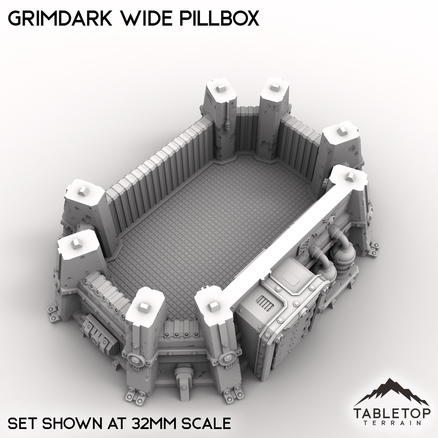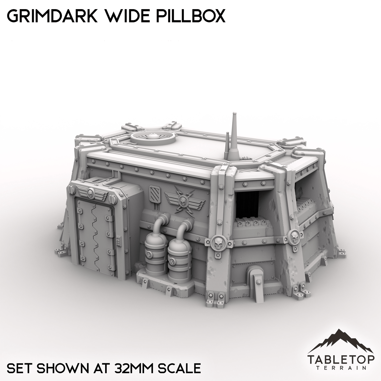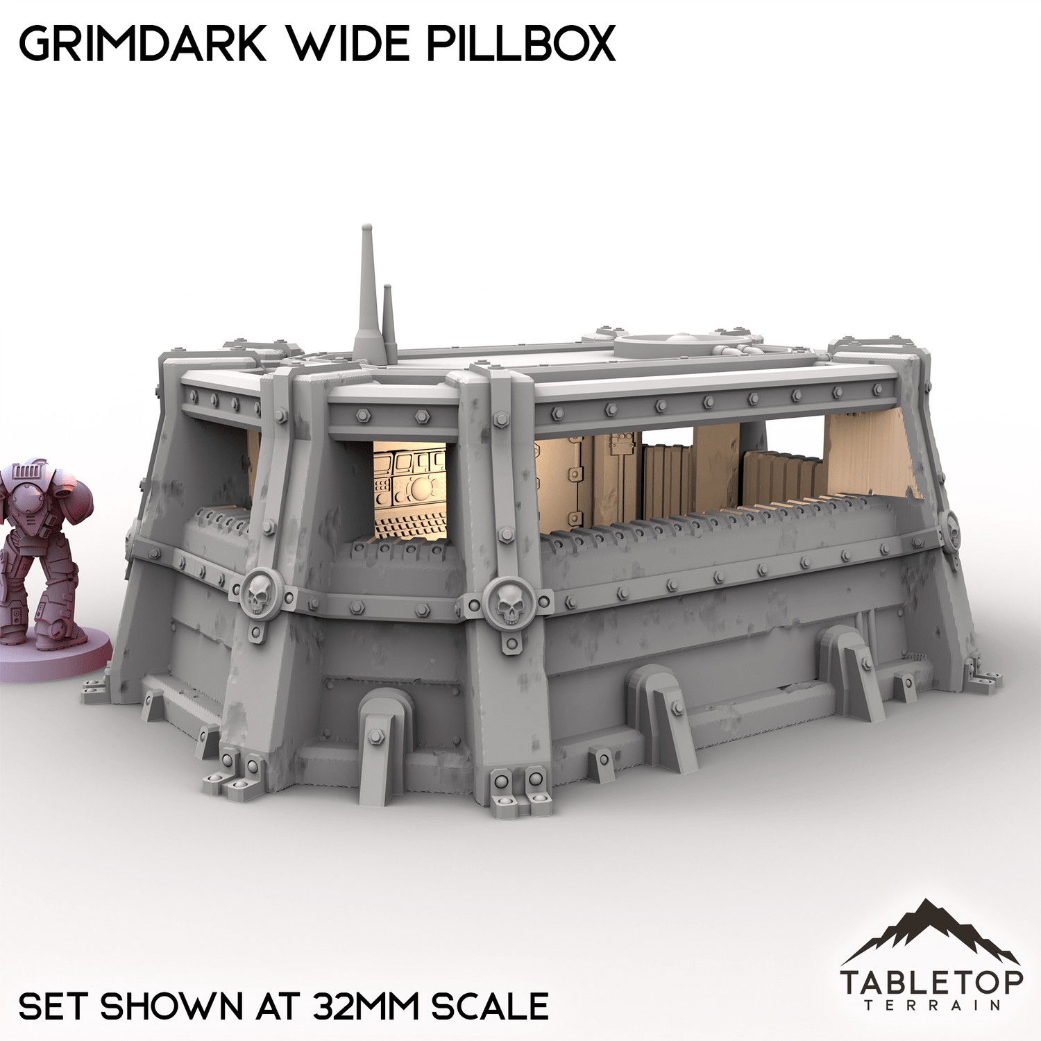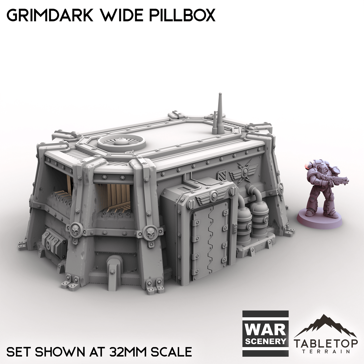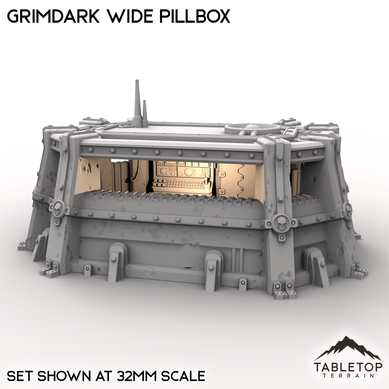 The Grimdark Wide Pillbox is a single story infantry bunker with a removable roof and optional top decoration. It is designed to give troops inside cover and open shooting lanes to the enemy.