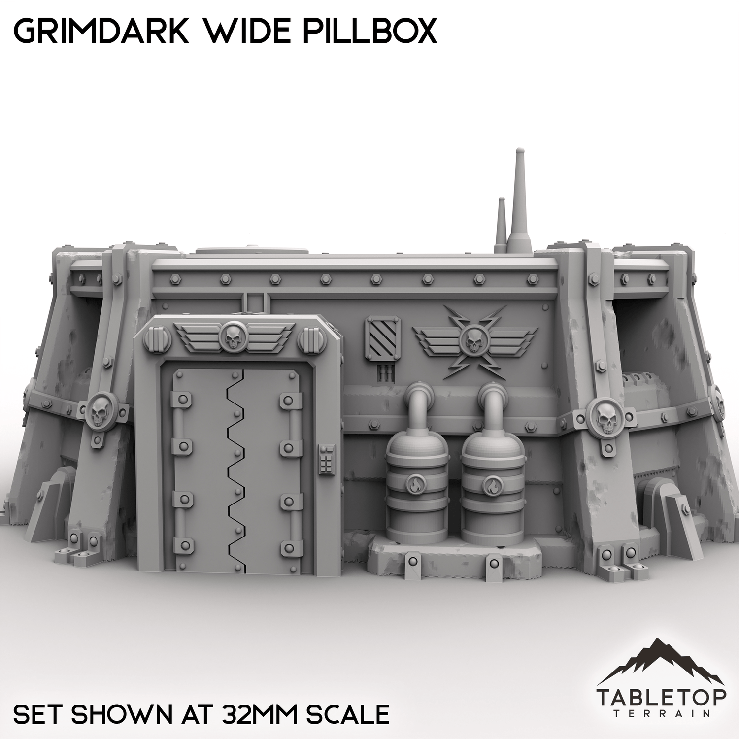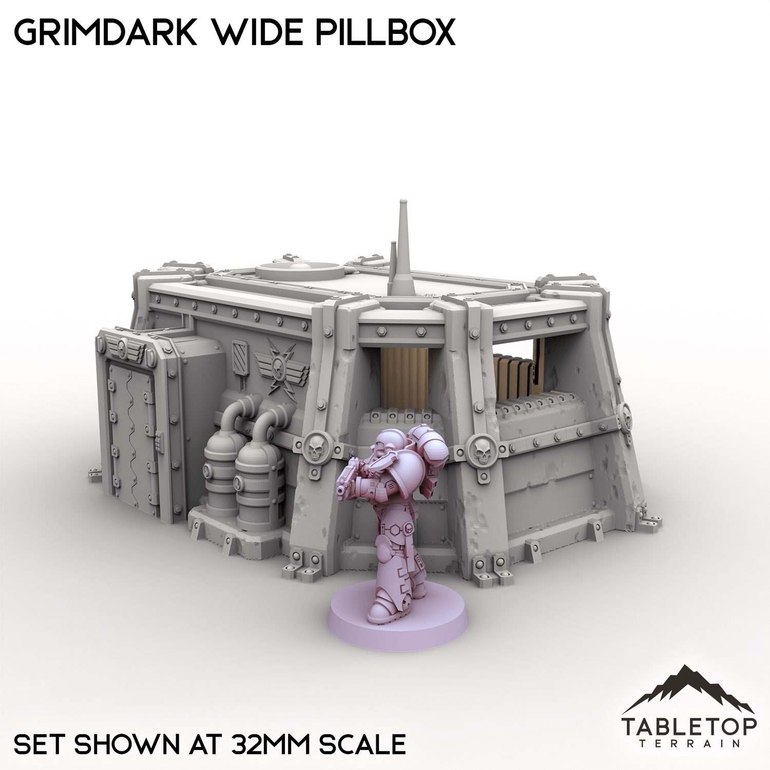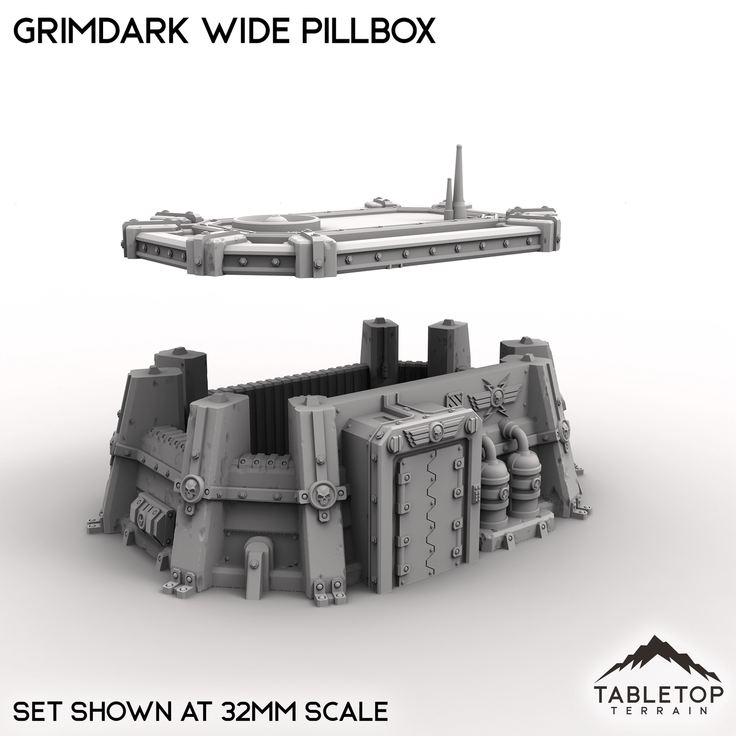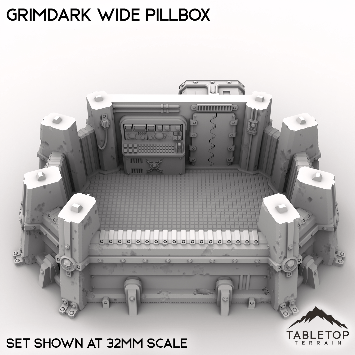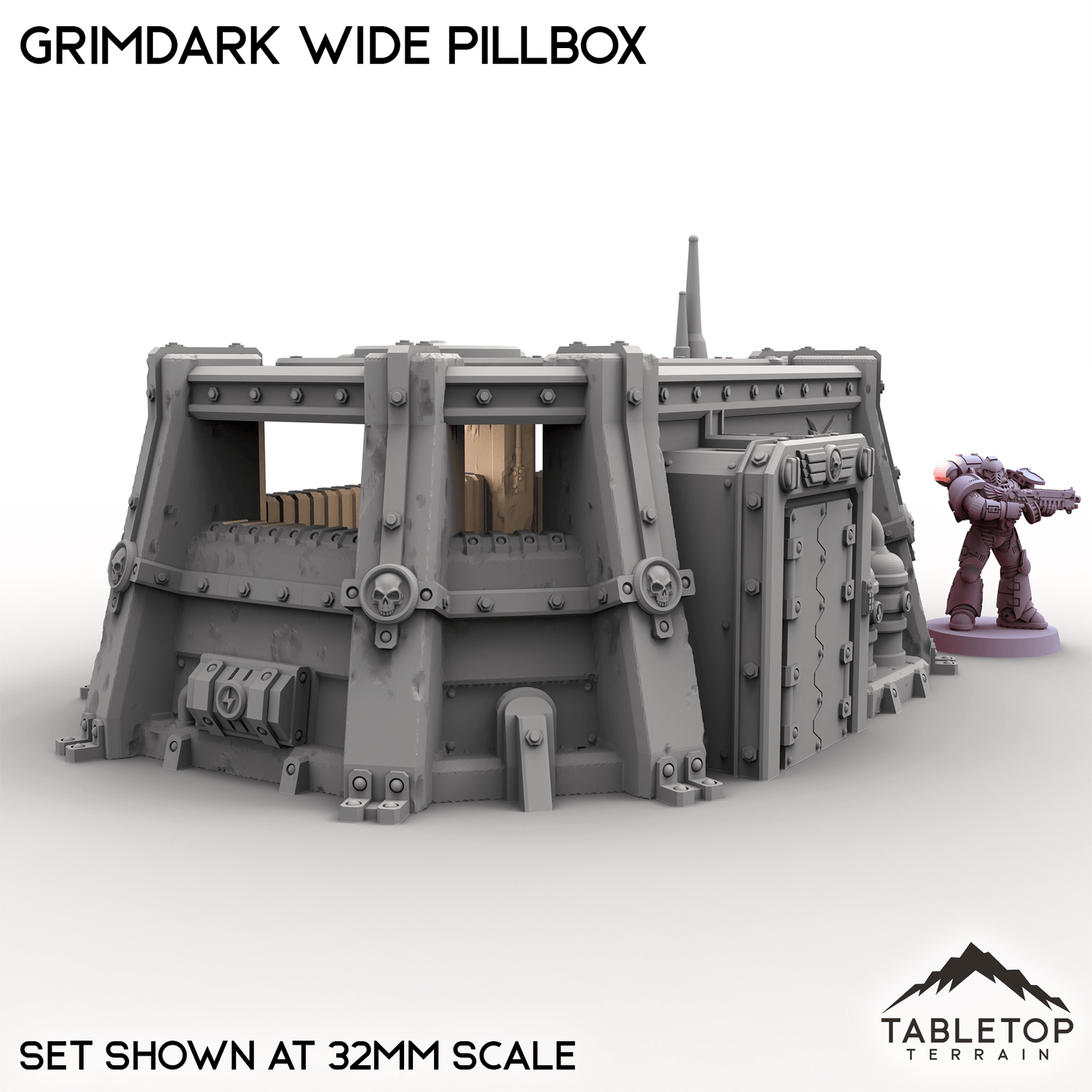 The Grimdark Wide Pillbox is a single story infantry bunker with a removable roof and optional top decoration. It is designed to give troops inside cover and open shooting lanes to the enemy.