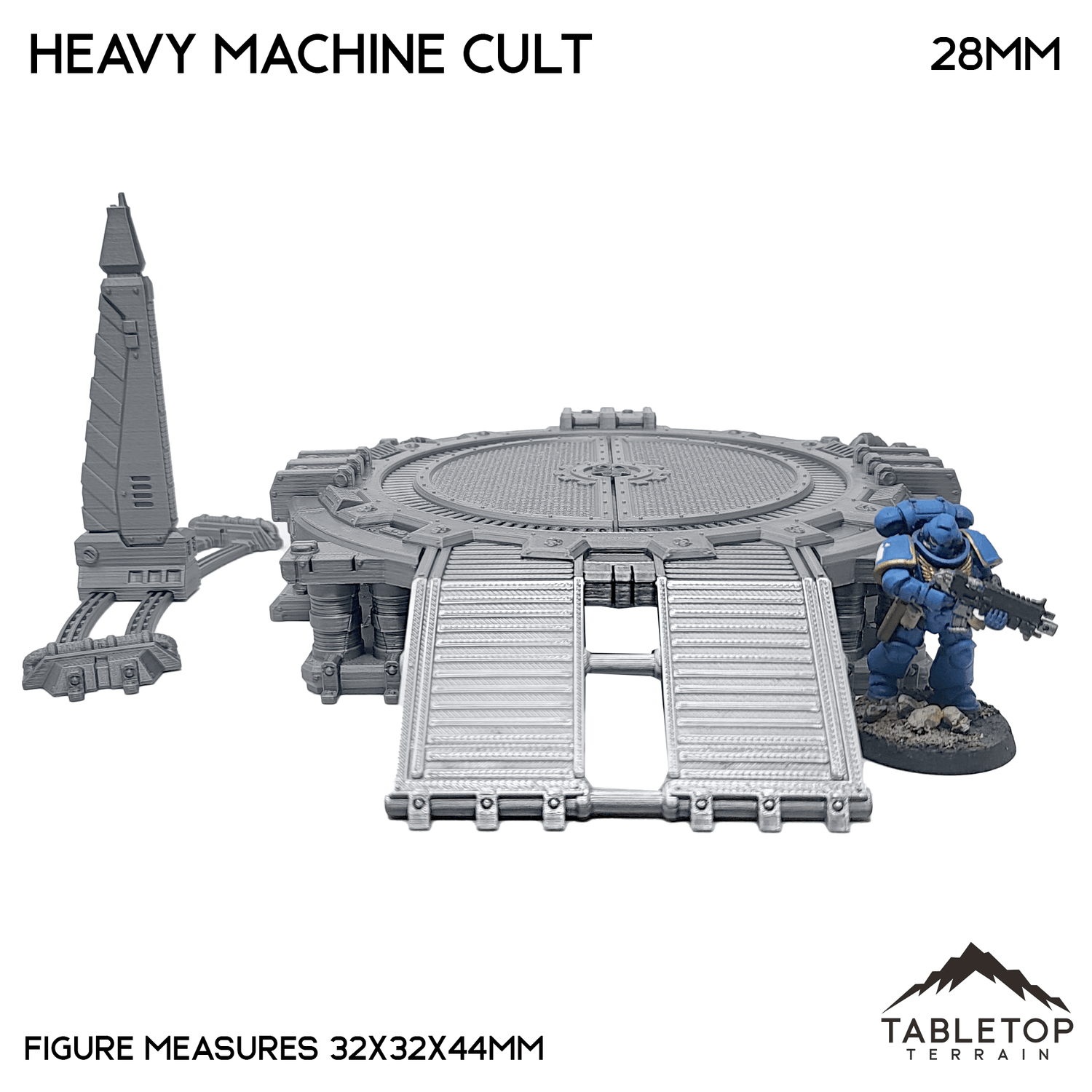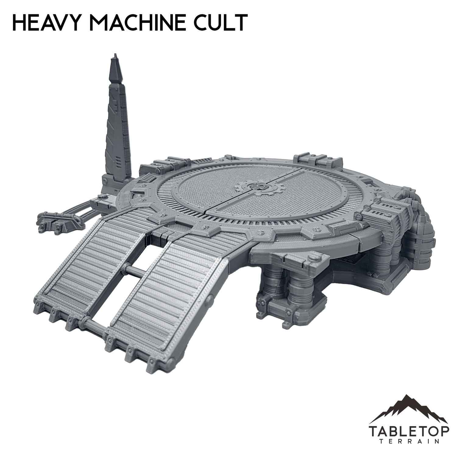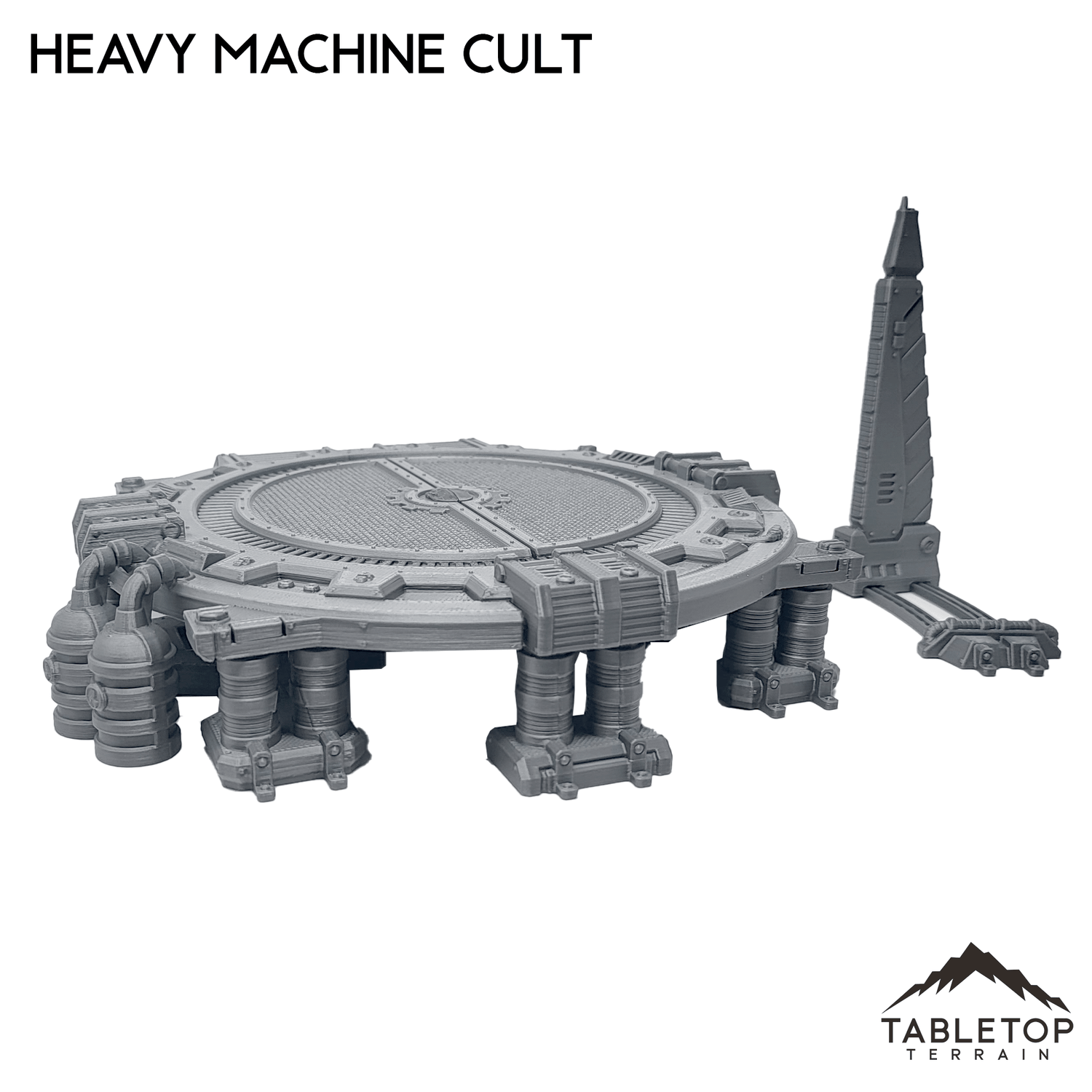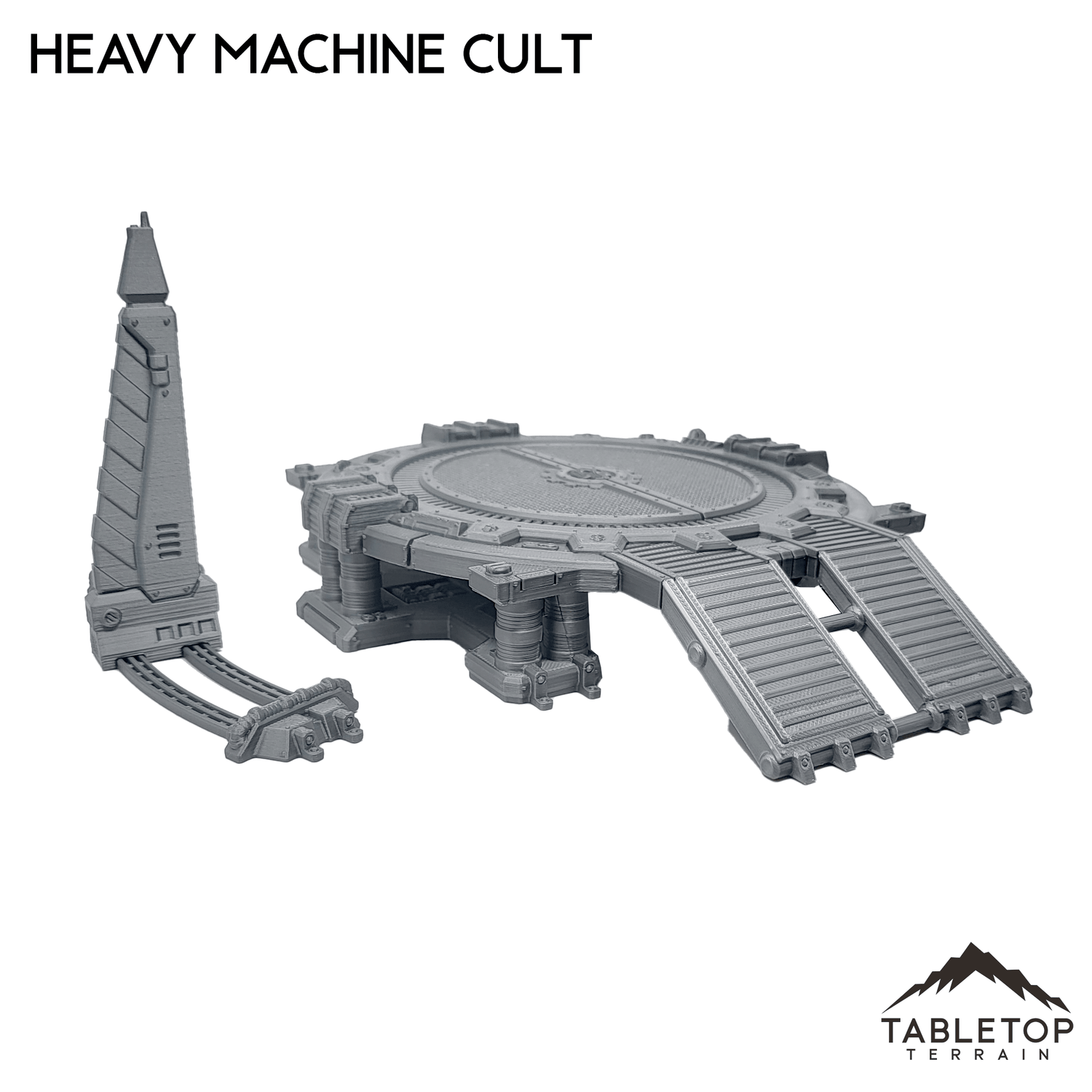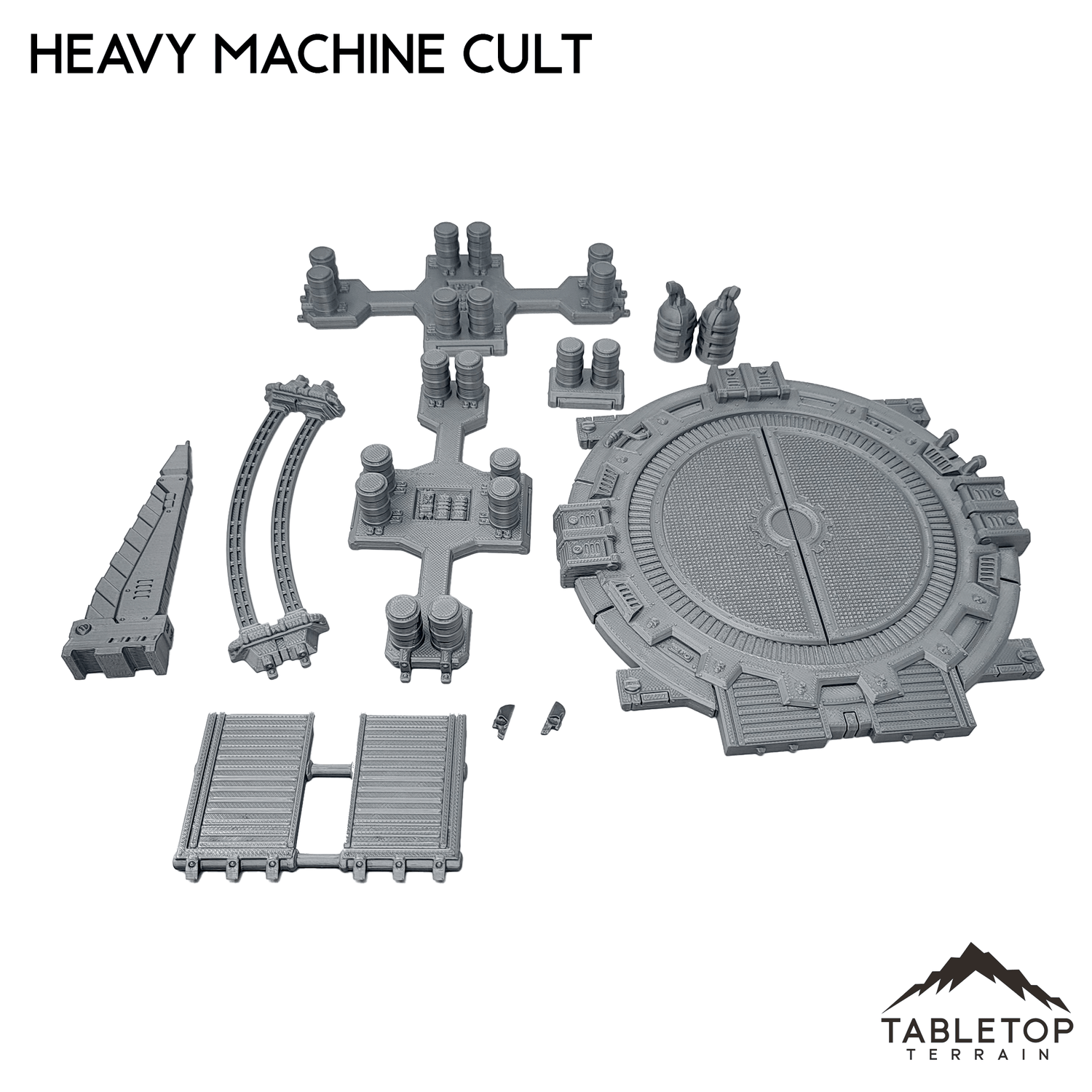 The Heavy Machine Cult serves as an upgraded Machine Cult that can requisition larger tank vehicles. It includes an elevated large landing platform, ramp, sliding track, comms antenna, and various attachments. The comms antenna snaps in and can slide along the track.