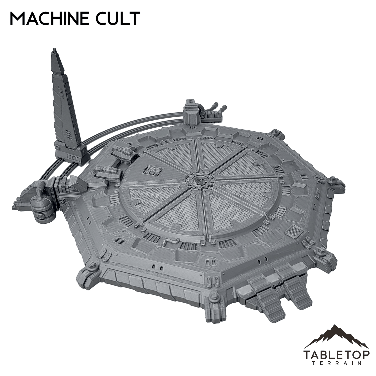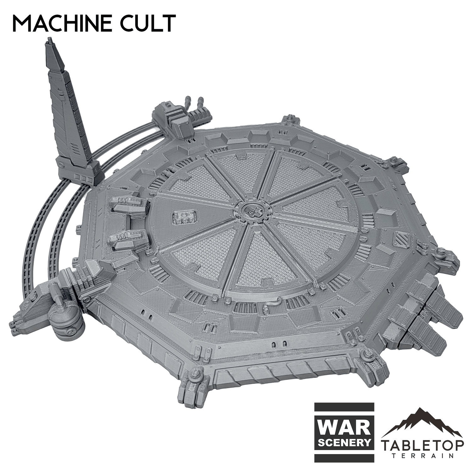 The Machine Cult serves as the vehicle command center for the headquarters. It includes a large landing platform, ramp, sliding track, comms antenna, and cabling pieces. The comms antenna snaps in and can slide along the track.