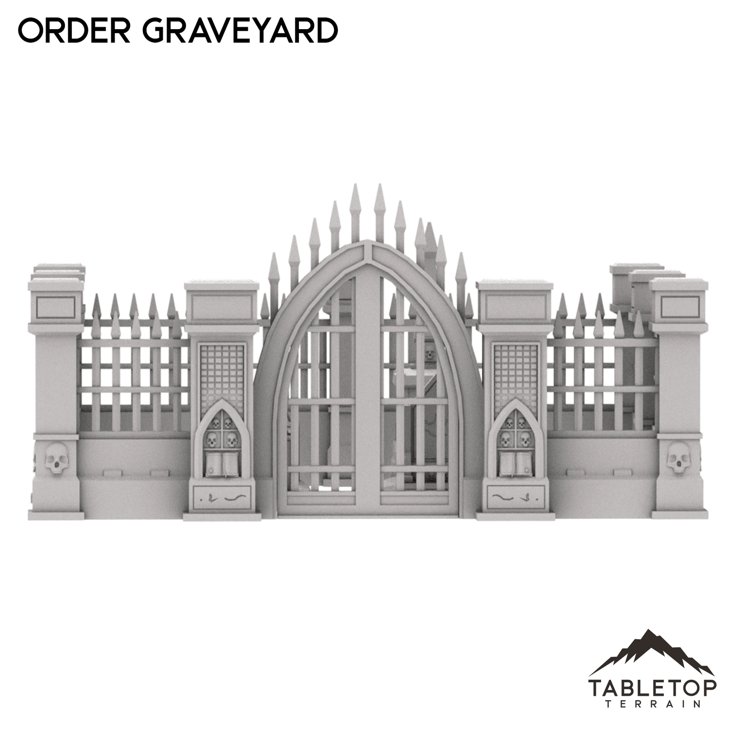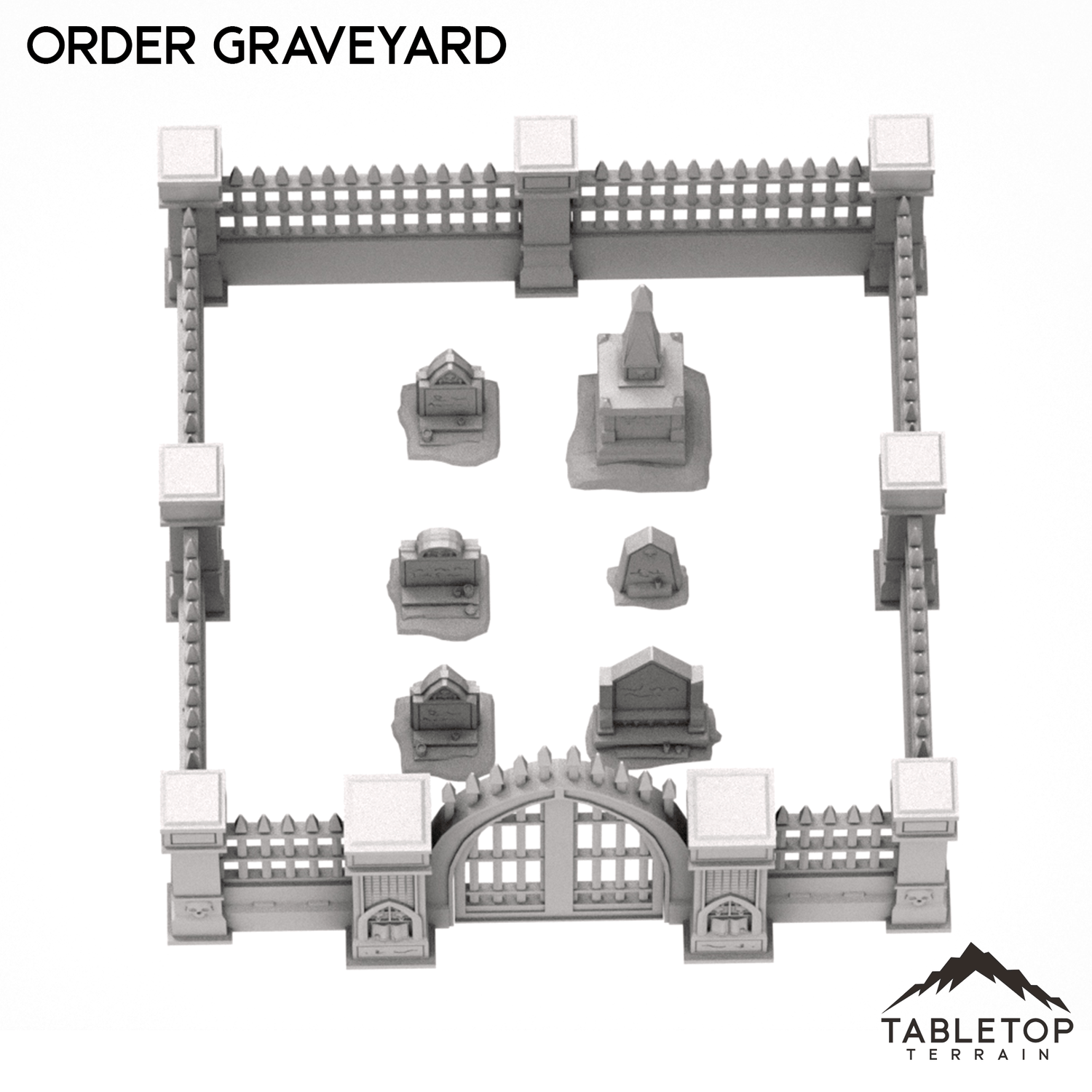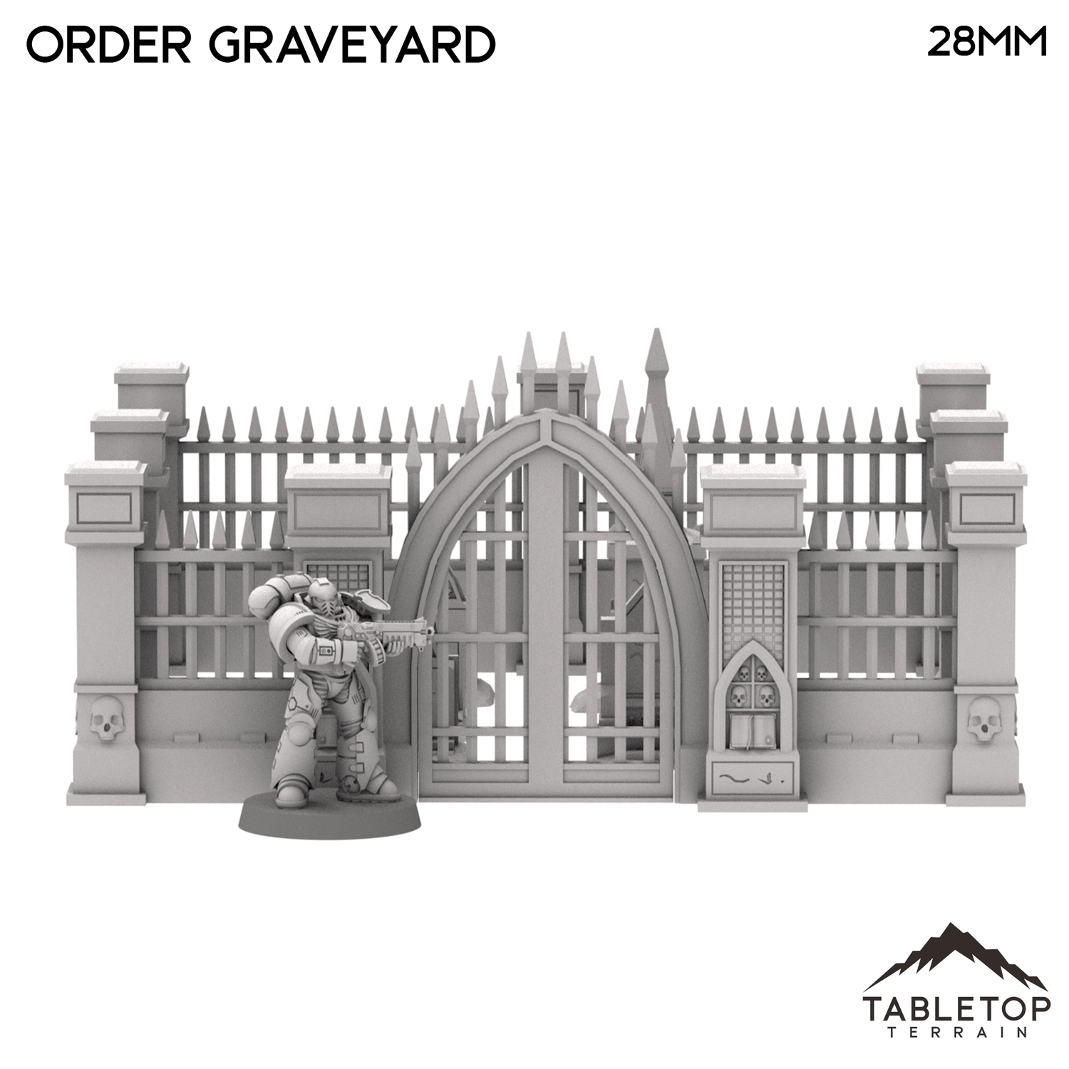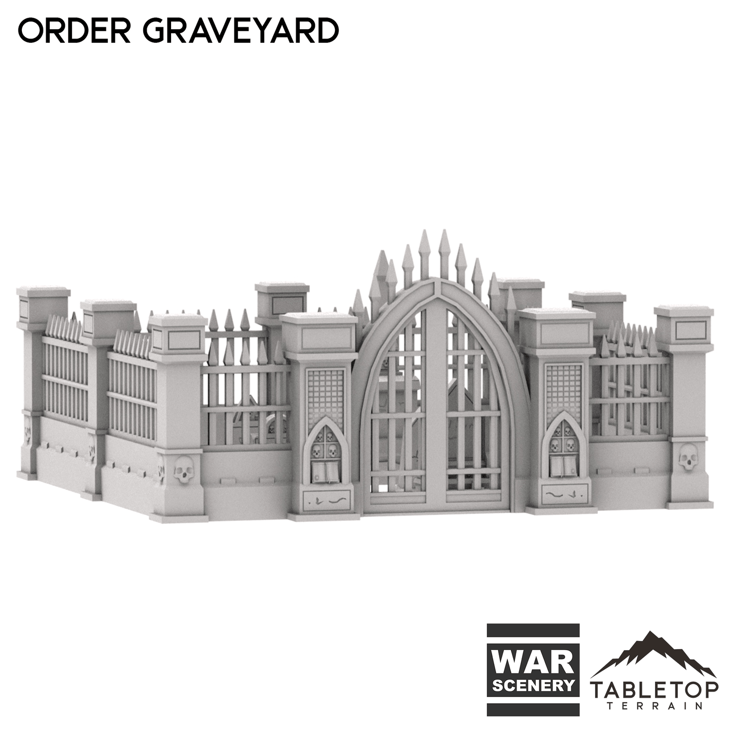 The Order Graveyard is a walled-in set including headstones, and a small ossuary set into either side of the main gate. This set is part of the Gothic Sanctuary collection, and is matching in style and theme to other sets from said collection. The Order Graveyard is designed for sci-fi wargames, but can be used with any system.