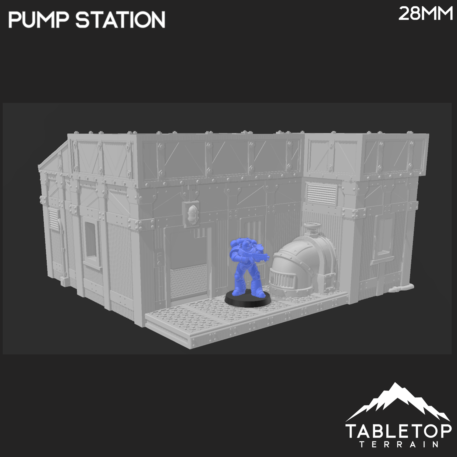 In 28mm scale, the Pump Station measures 198x194x108mm / 7.8x7.6x4.2 inches.