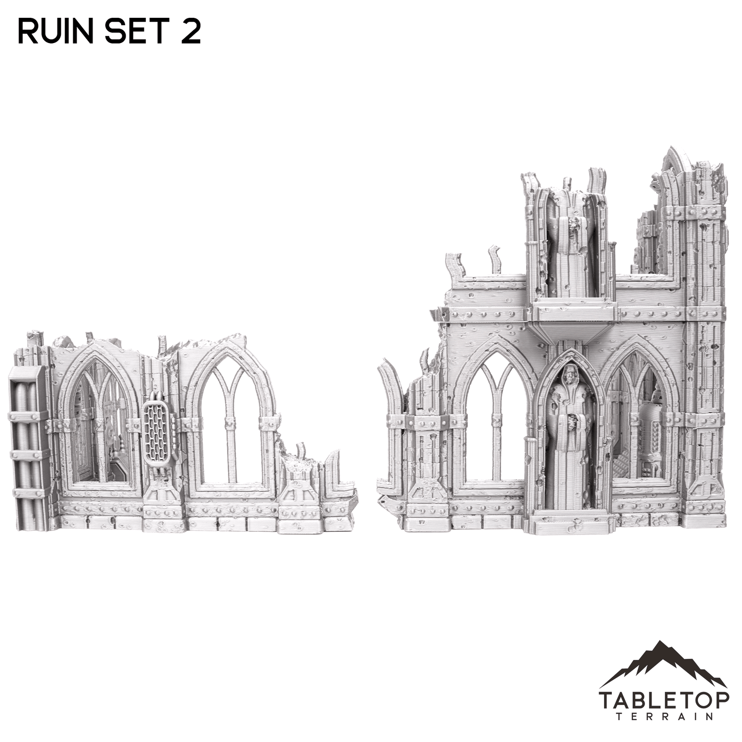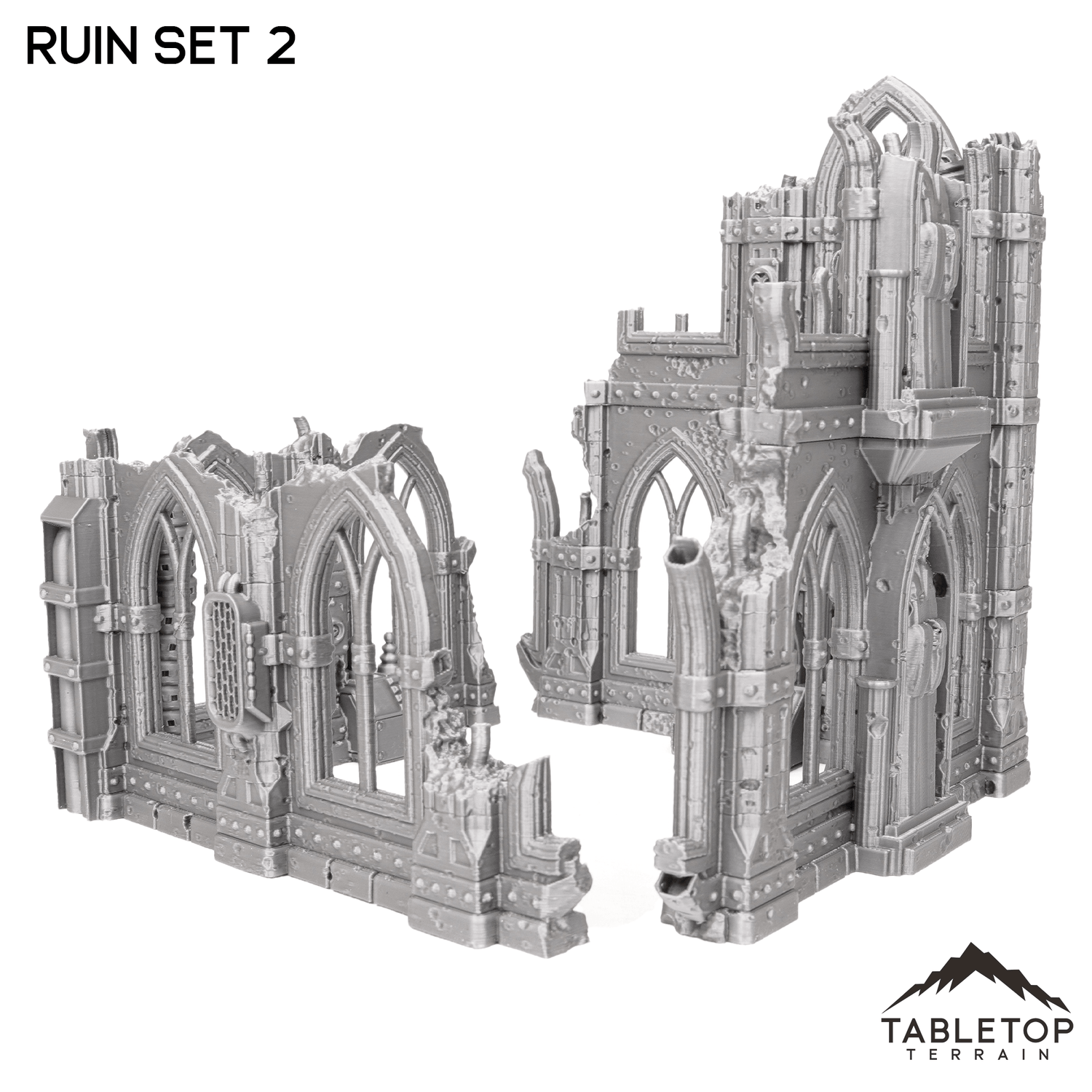 The Ruin Set 2 is an essential piece to a Sci-Fi terrain set. It has gothic detailing with some sci-fi flair such as terminals and vents, although it could potentially double as a high-tech fantasy ruin. The base set comes with one two-story stackable ruin and one standalone ruin. The bundle comes with two of each set for a more comprehensive battlefield.
