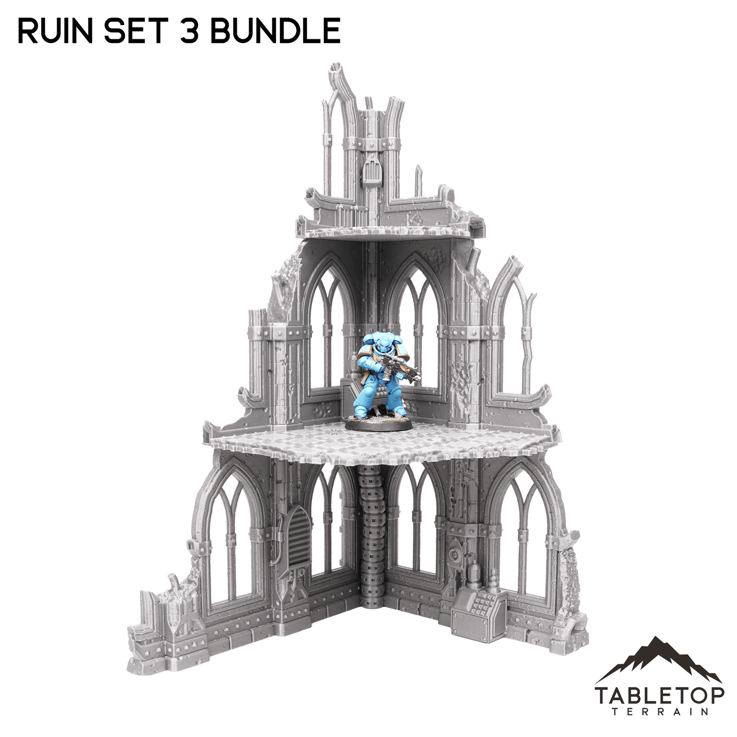 The Ruin Set 3 is an essential piece to a Sci-Fi terrain set. It has gothic detailing with some sci-fi flair such as terminals and vents, although it could potentially double as a high-tech fantasy ruin. The base set comes with one three-story stackable ruin. The bundle comes with two three-story stackable ruins.