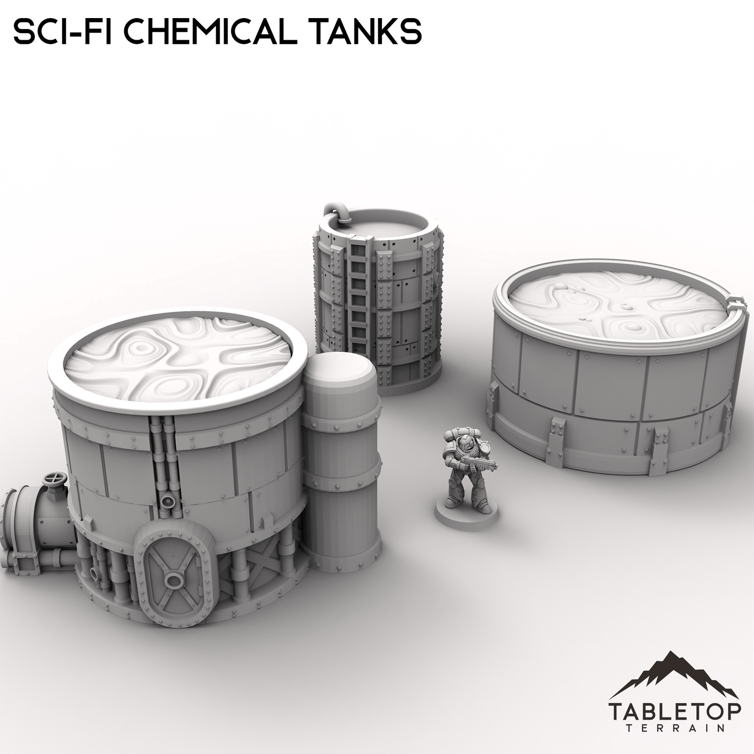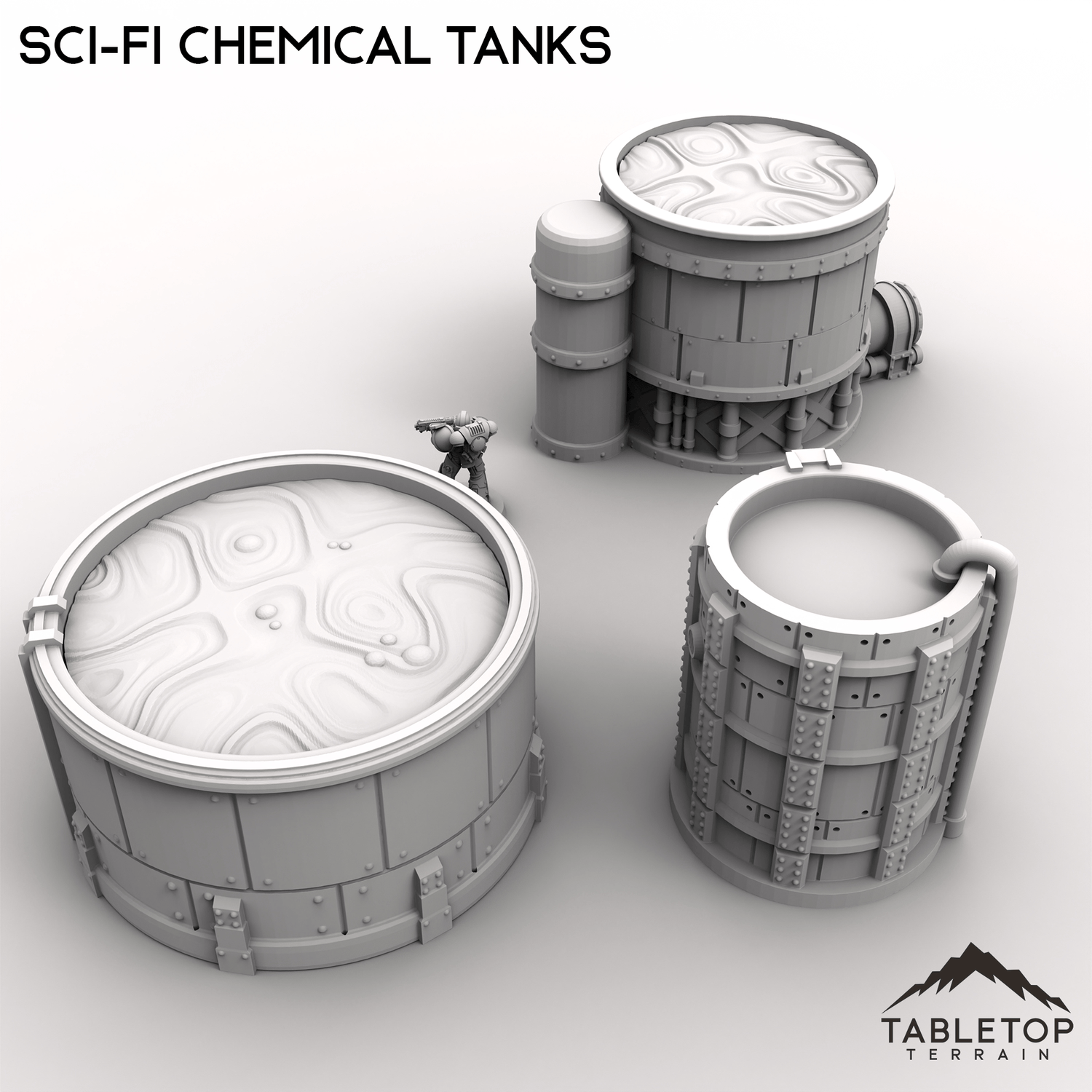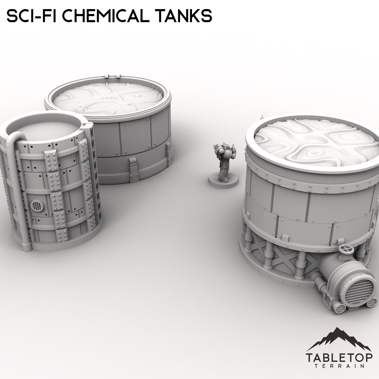 Sci-Fi Chemical Tanks is a set of 3 tanks, 2 of which include removable discs for representing the liquids inside. Each tank is hollow, and makes for easy transport and storage. The tanks are a good fit for any sci-fi setting, or a modern industrial game. All 3 tanks are included in this set.