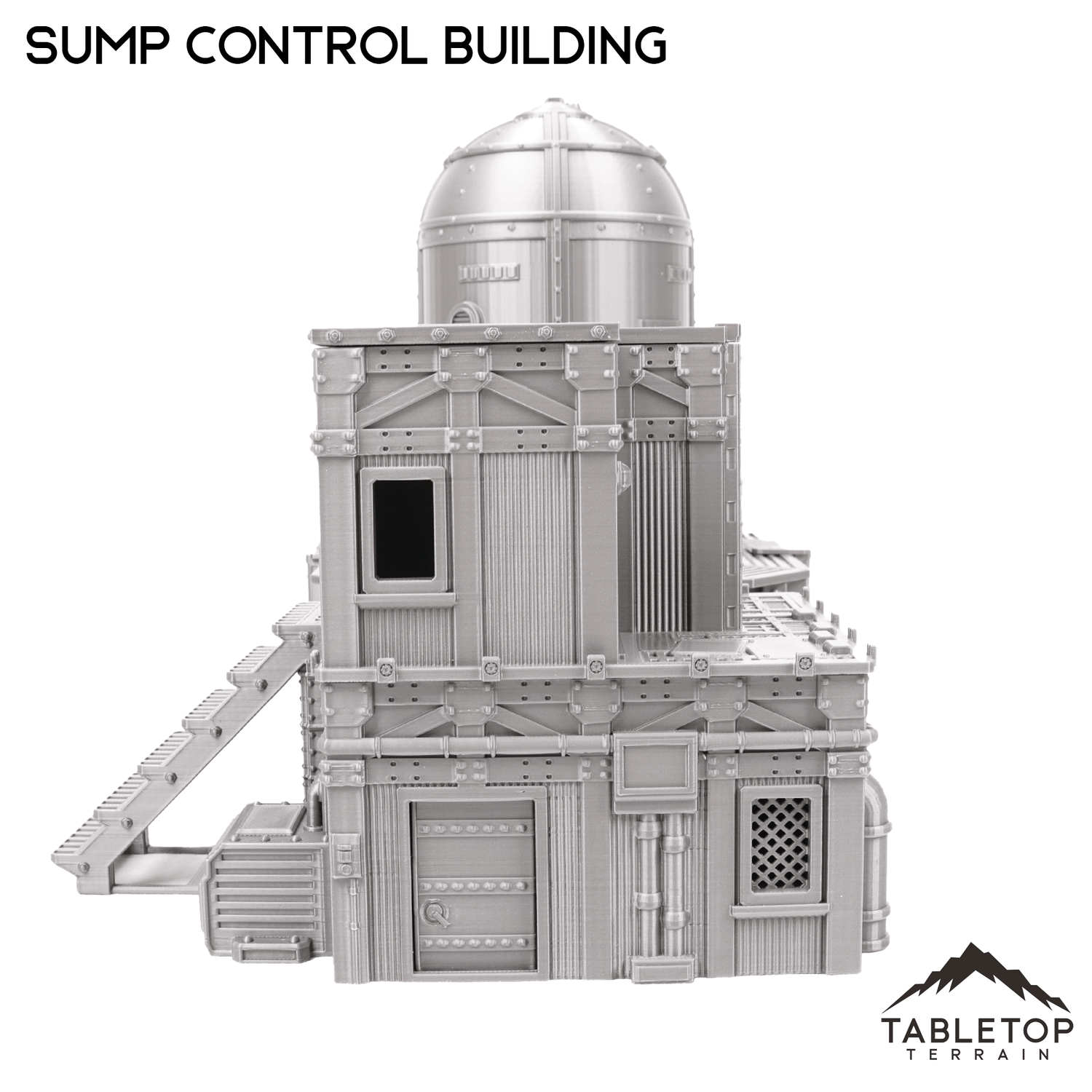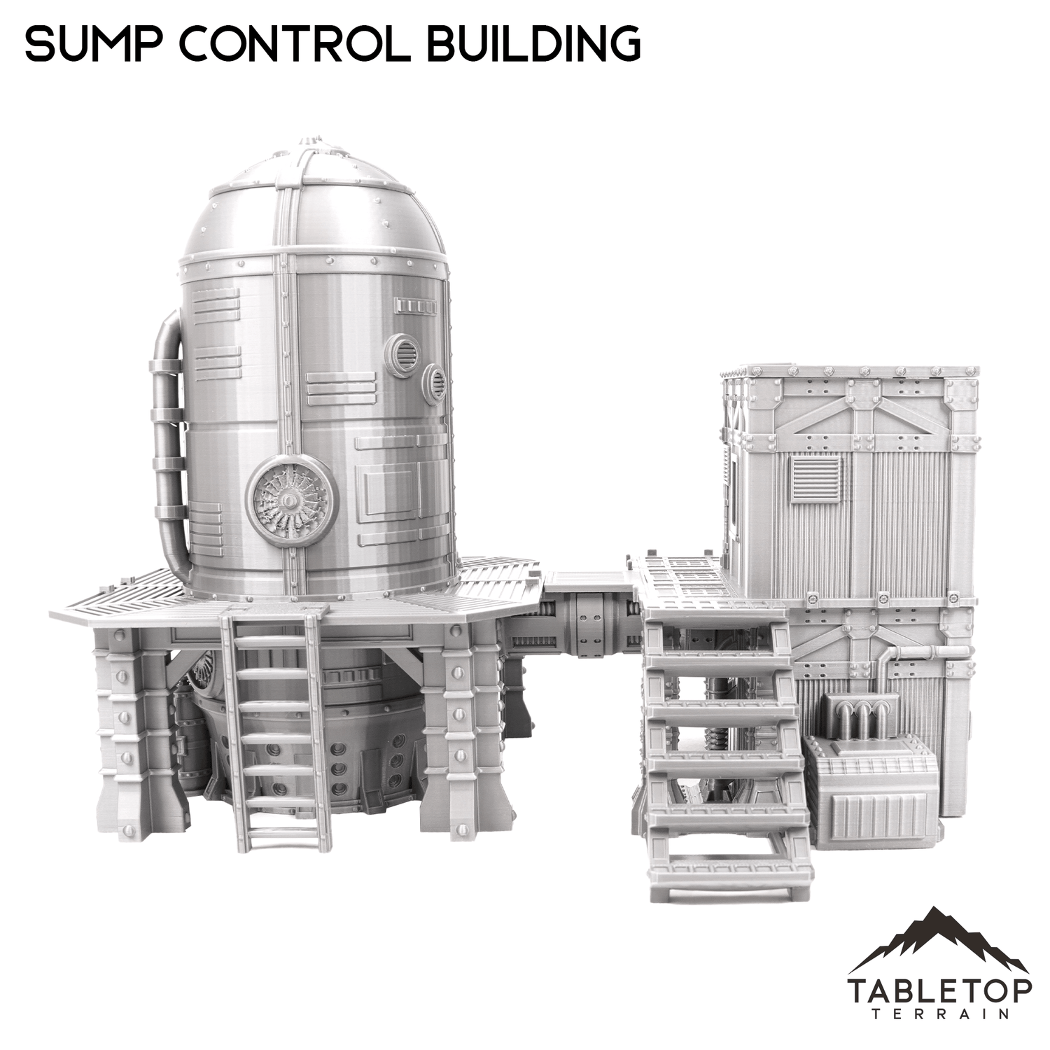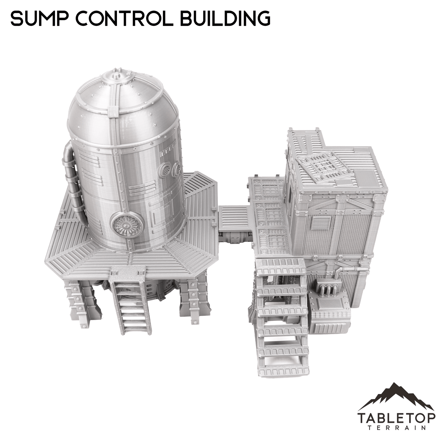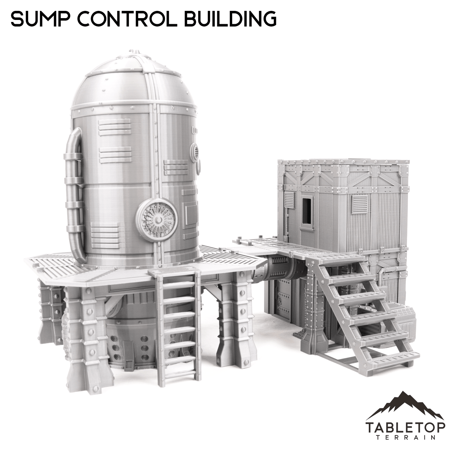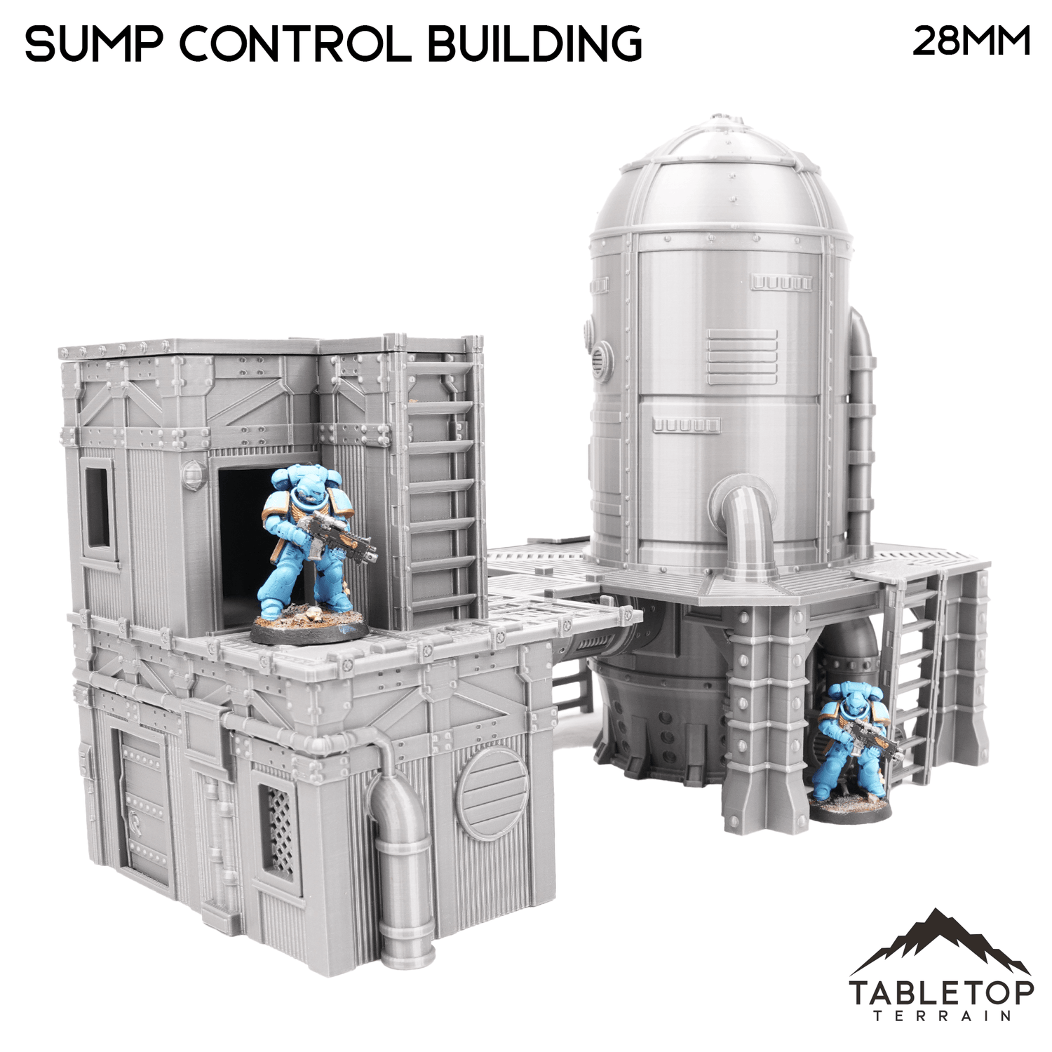 The UnderNidus Sump Control Building is inspired by the grimdark industrial megalopolis of the far future. A staircase is included to access the upper structure/walkway, and a separate ladder can be added to the main upper platform.