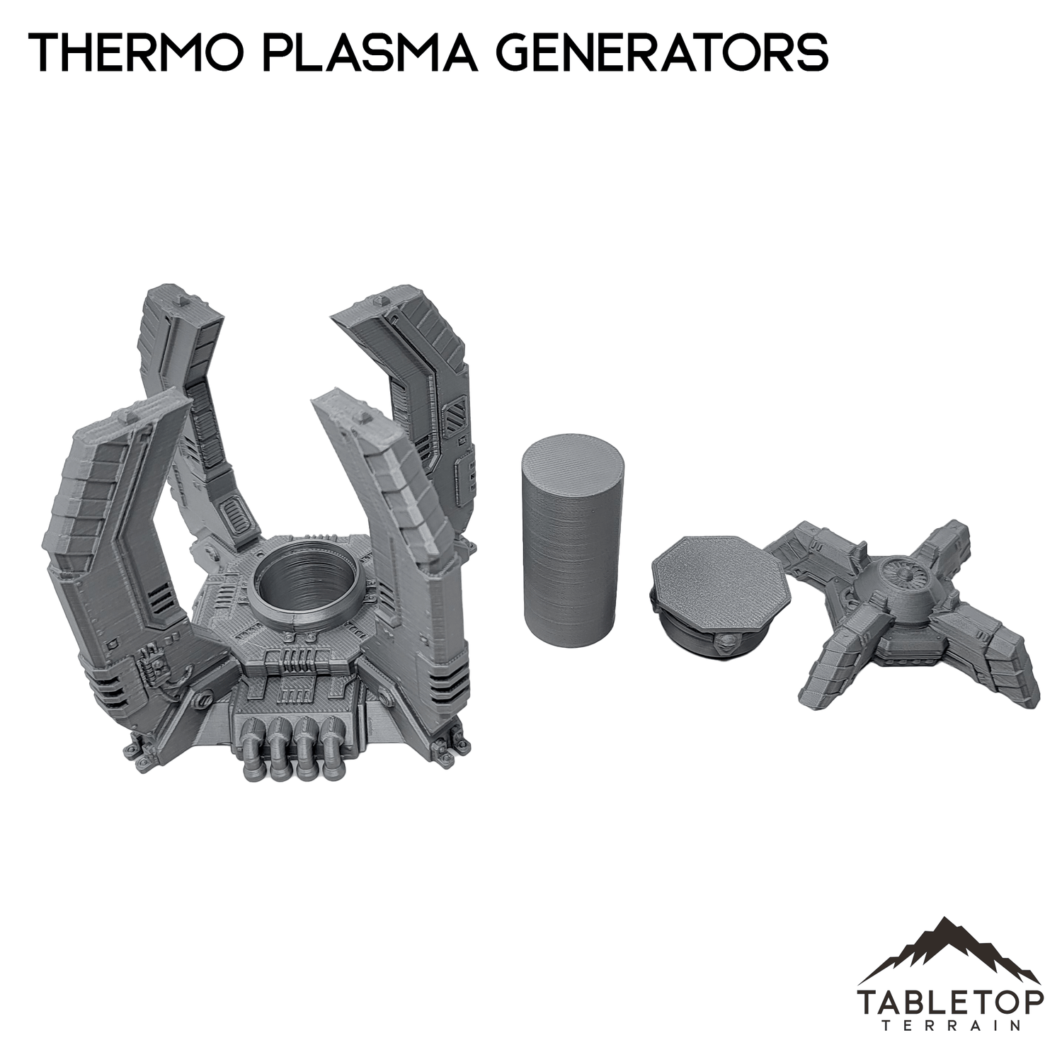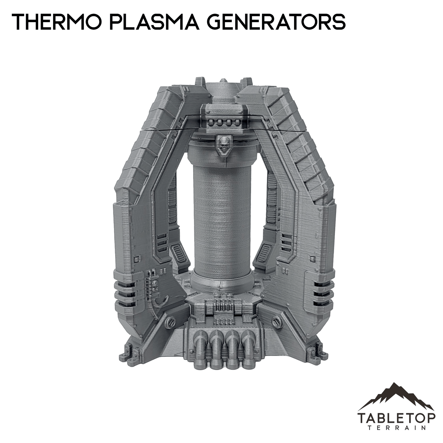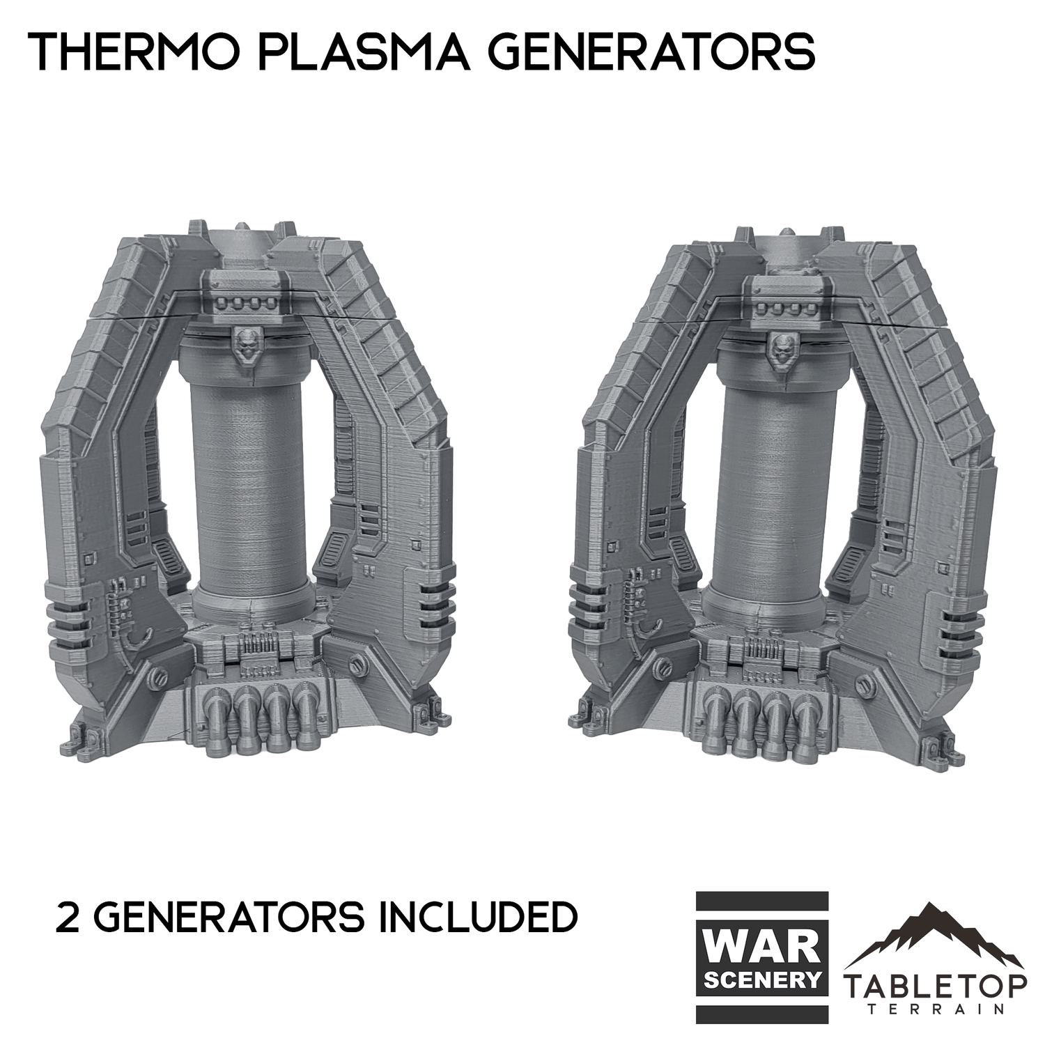 The Thermo Plasma Generators are a set of two towers that provide power to the headquarter buildings. The Generators come in multiple pieces and require assembly, but glue is not required.