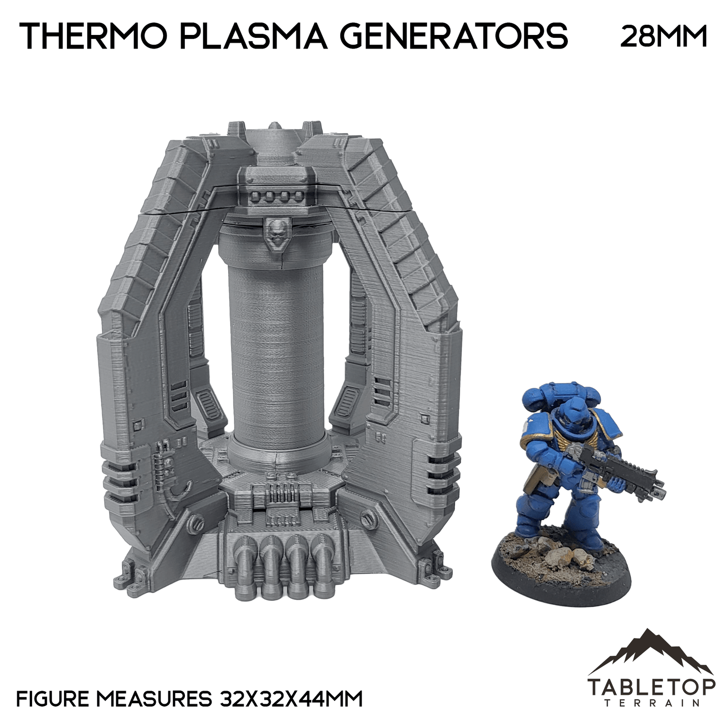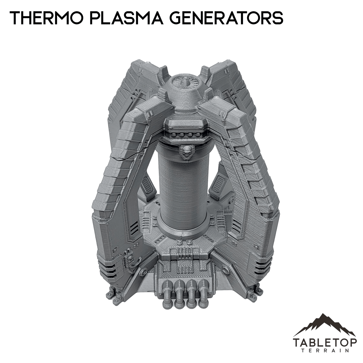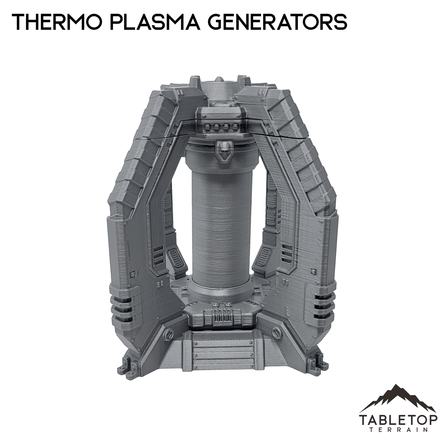 The Thermo Plasma Generators are a set of two towers that provide power to the headquarter buildings. The Generators come in multiple pieces and require assembly, but glue is not required.