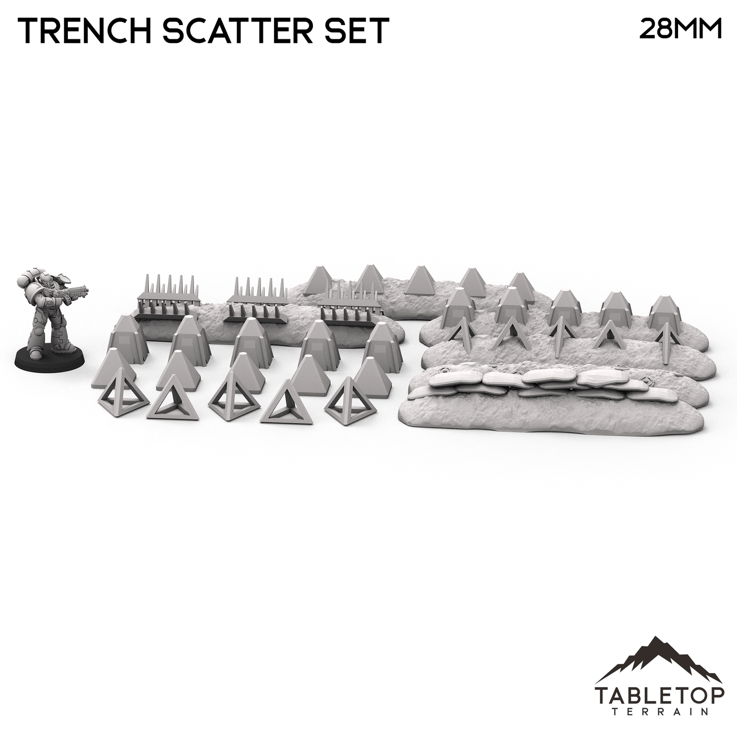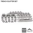 The Trench Scatter Set is a collection of fortifications for defending an entrenched point. The set includes 6 different trench walls, and a collection of smaller structures for laying out around the trenches themselves. The Trench Scatter set is designed for sci-fi wargames, but can be used with any system.