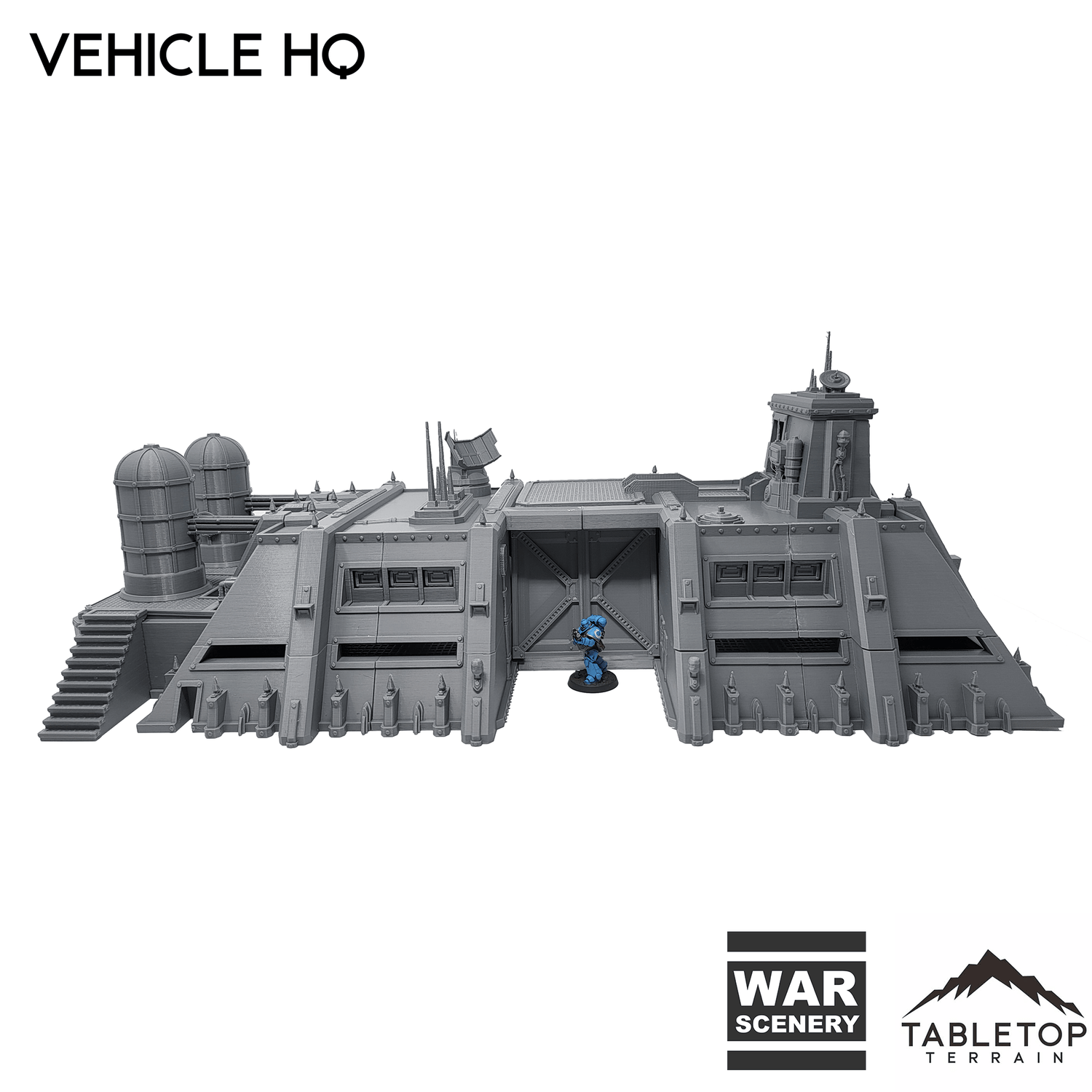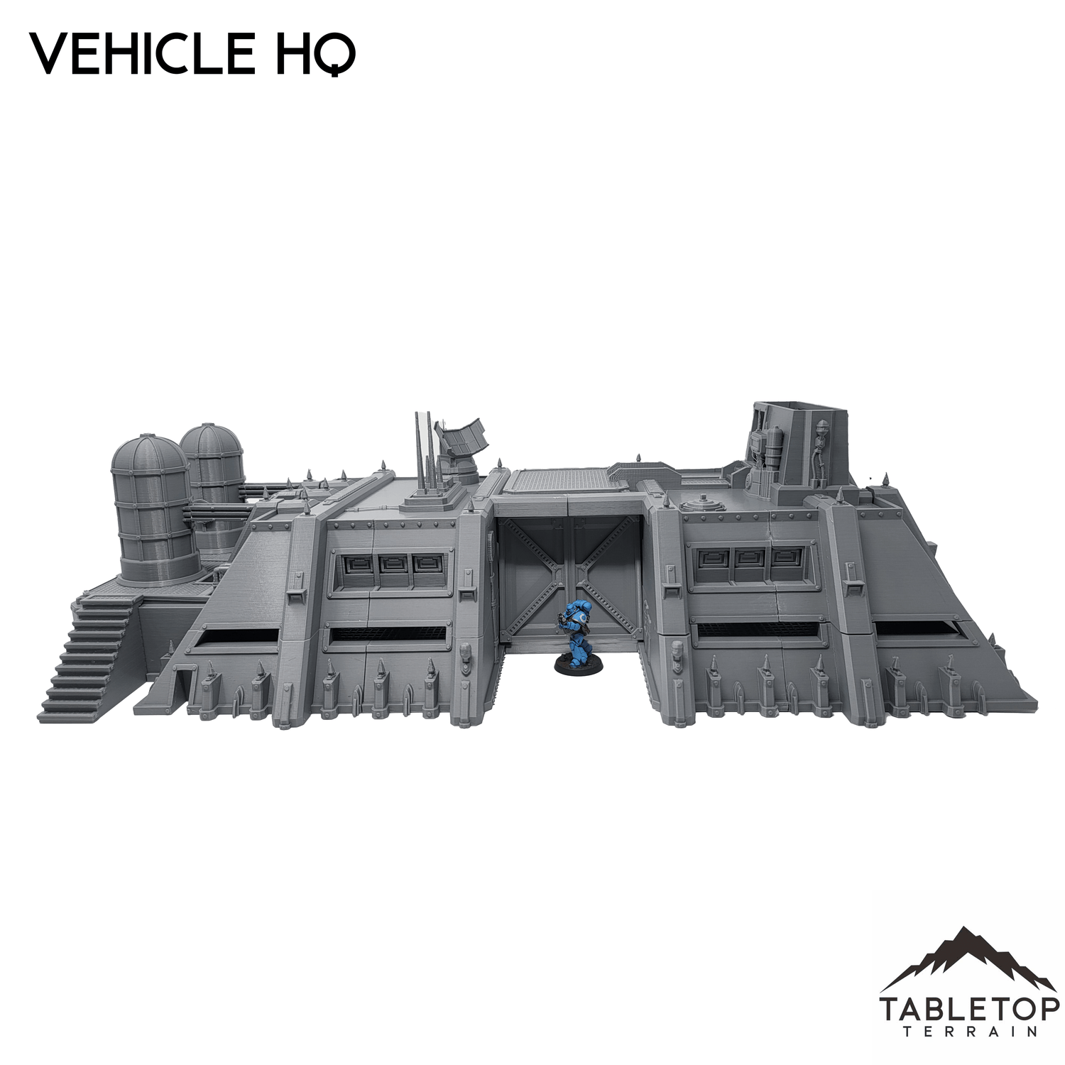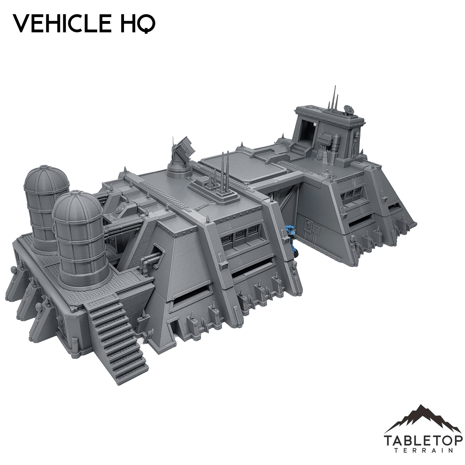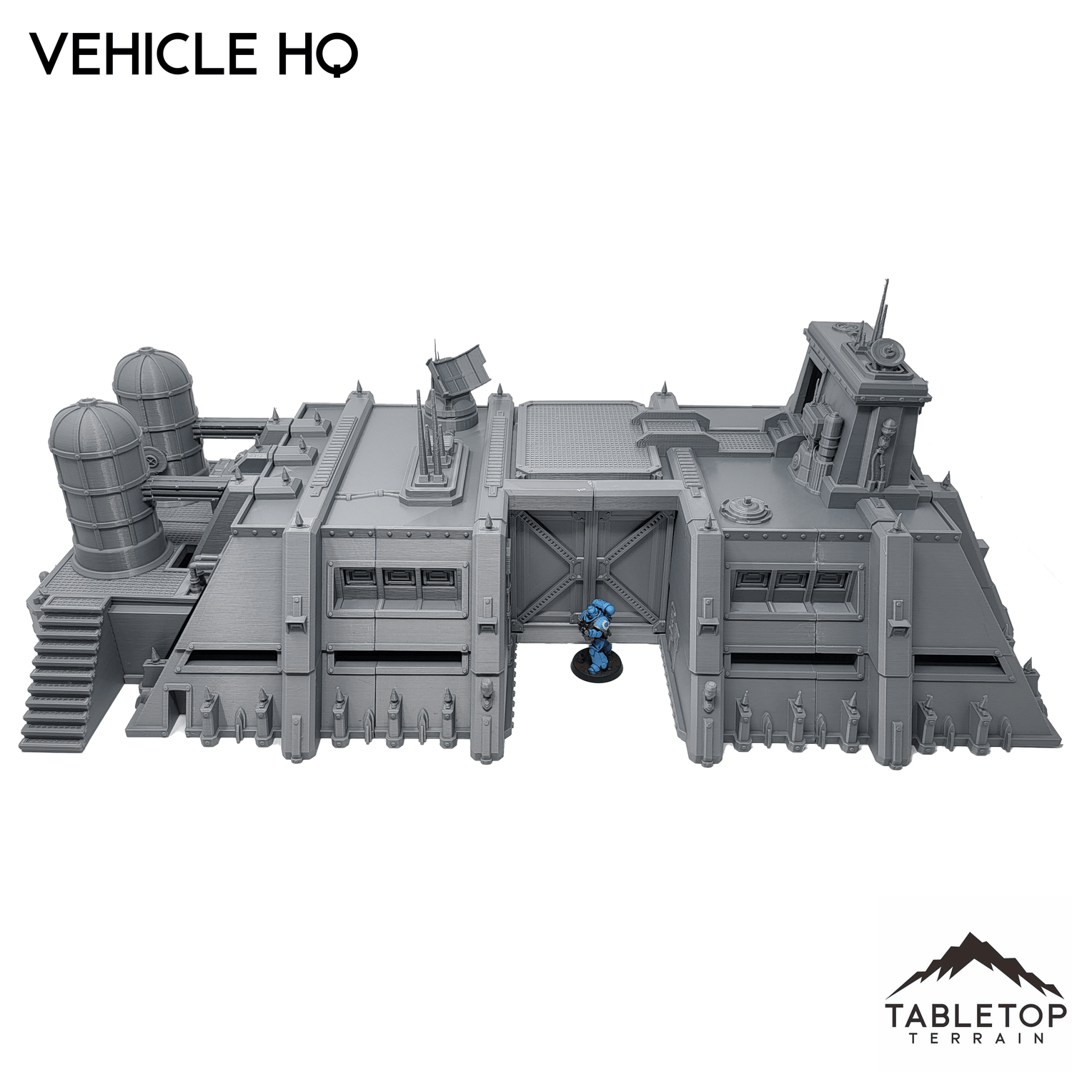 The Vehicle HQ is a massive, heavily armored building. The set has large bay doors with artillery, lookout post and a radar satellite on the rooftop, along with 2 large fuel silos mounted on the side of the building. Both the inside and outside of this structure is detailed and stylized, and made to be able to fit a large amount of minis inside. The Vehicle HQ is designed for sci-fi wargames, but can be used with any system.