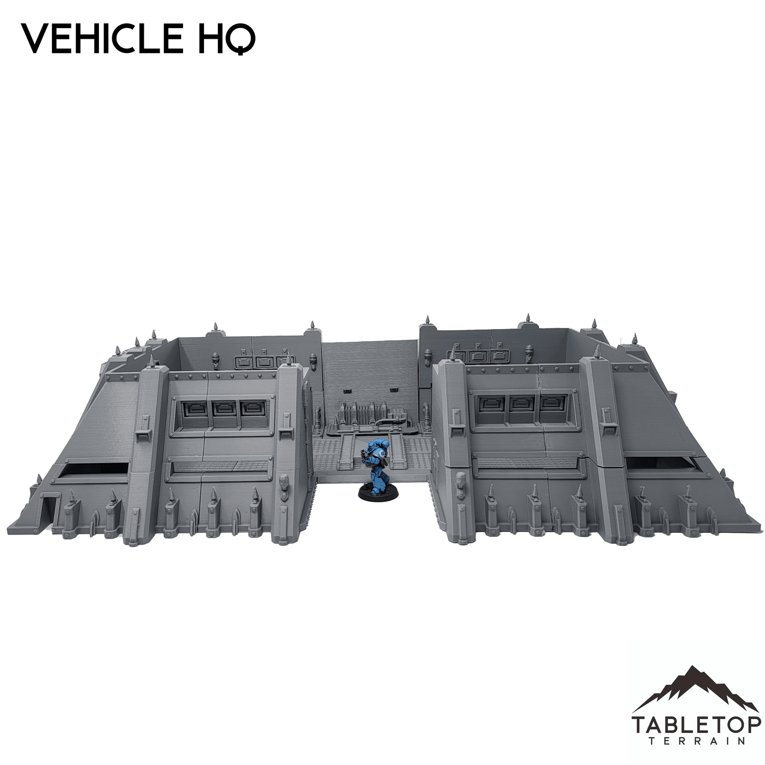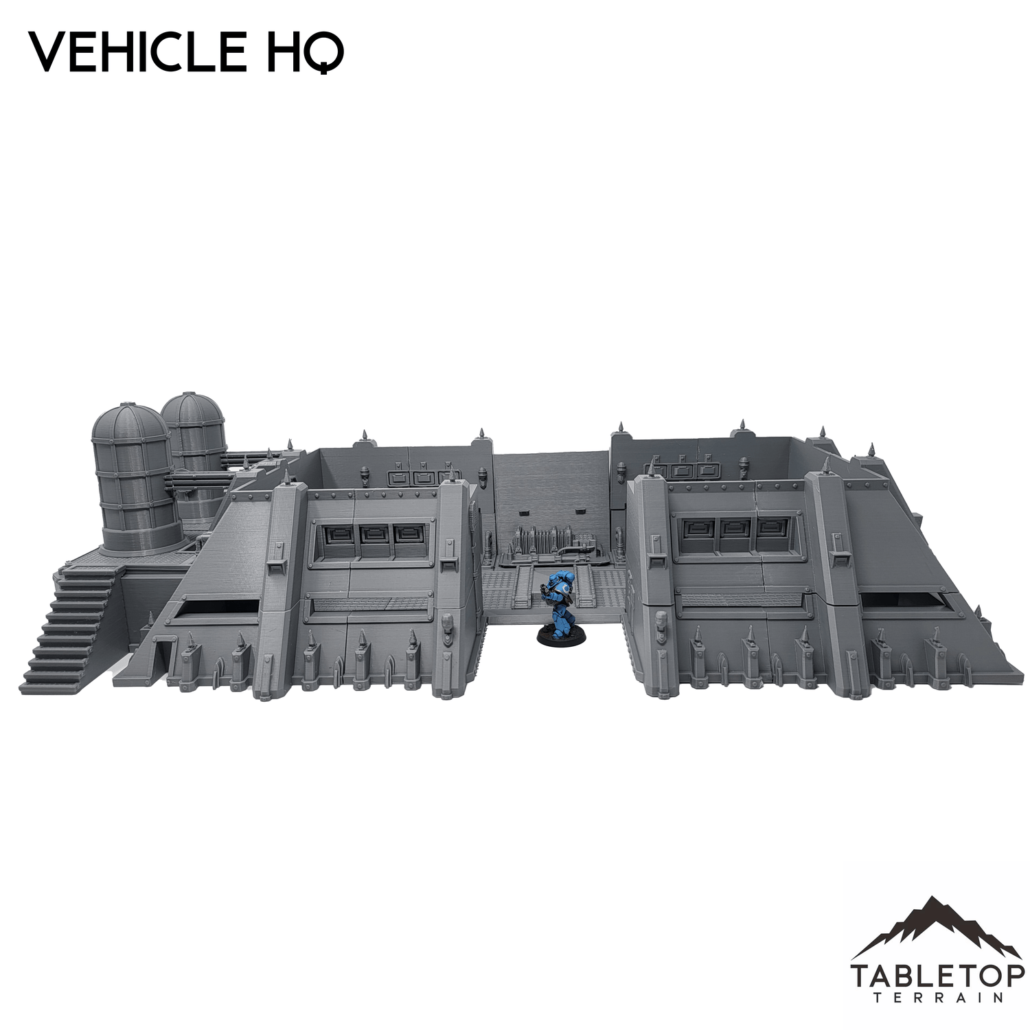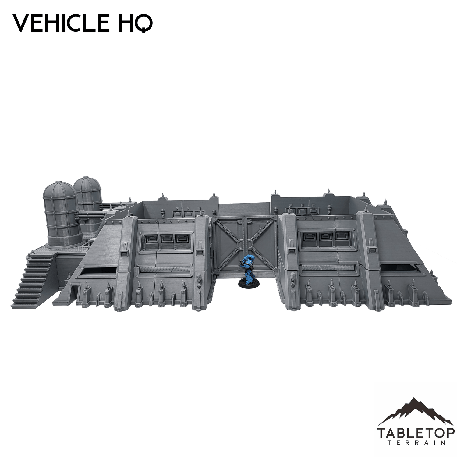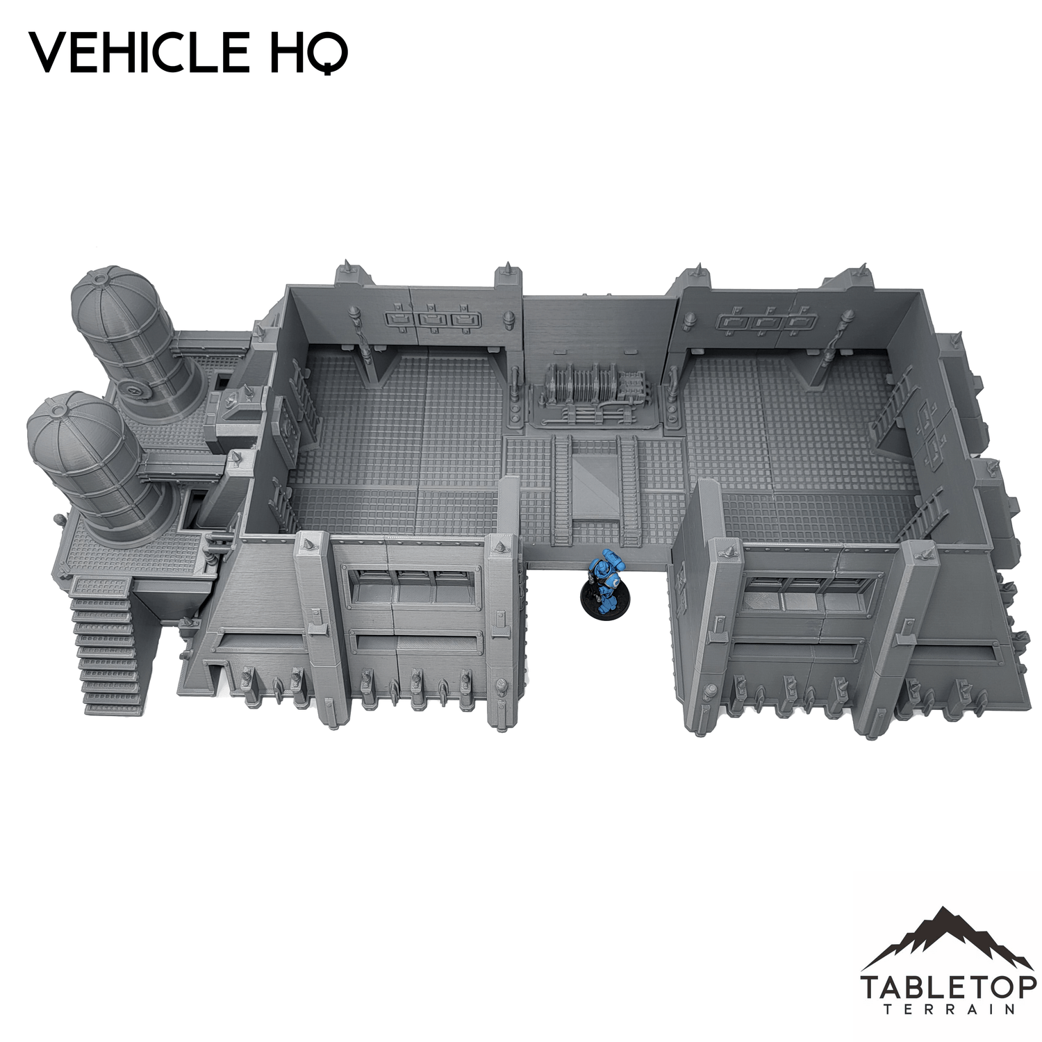 The Vehicle HQ is a massive, heavily armored building. The set has large bay doors with artillery, lookout post and a radar satellite on the rooftop, along with 2 large fuel silos mounted on the side of the building. Both the inside and outside of this structure is detailed and stylized, and made to be able to fit a large amount of minis inside. The Vehicle HQ is designed for sci-fi wargames, but can be used with any system.
