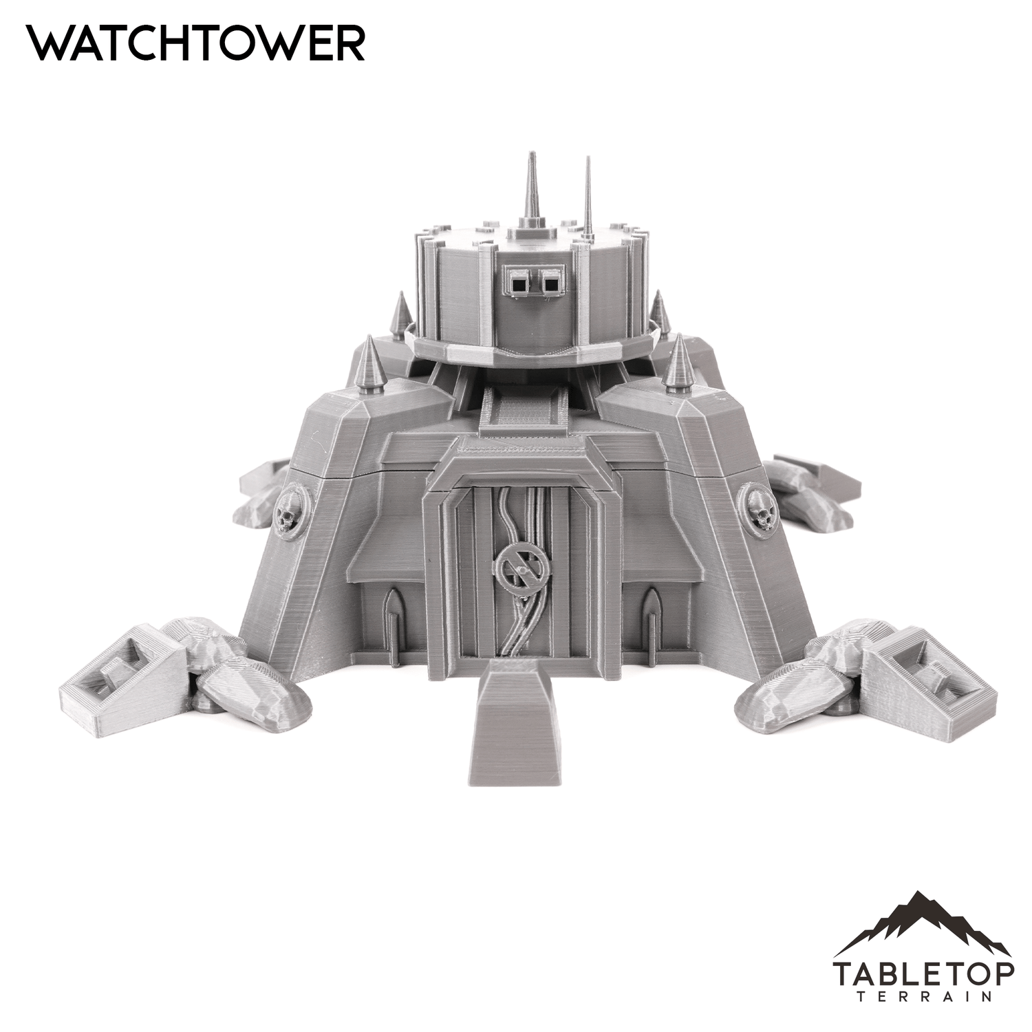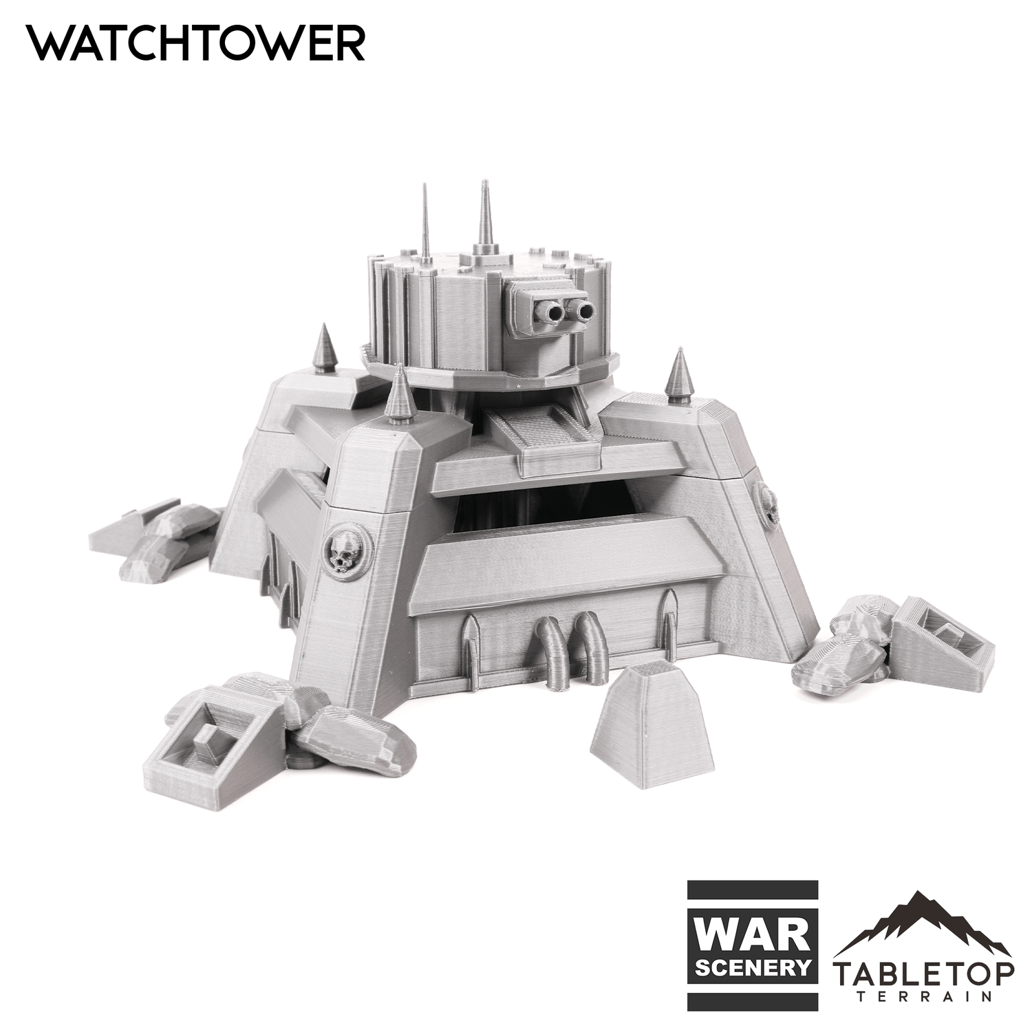 The Watchtower is a fortified bunker, with a mounted double cannon on top. The set comes with sandbags and stone blocks for reinforcing the location, and the Watchtower itself has a removeable roof for placing minis within. The Watchtower is designed for sci-fi wargames, but can be used with any system..