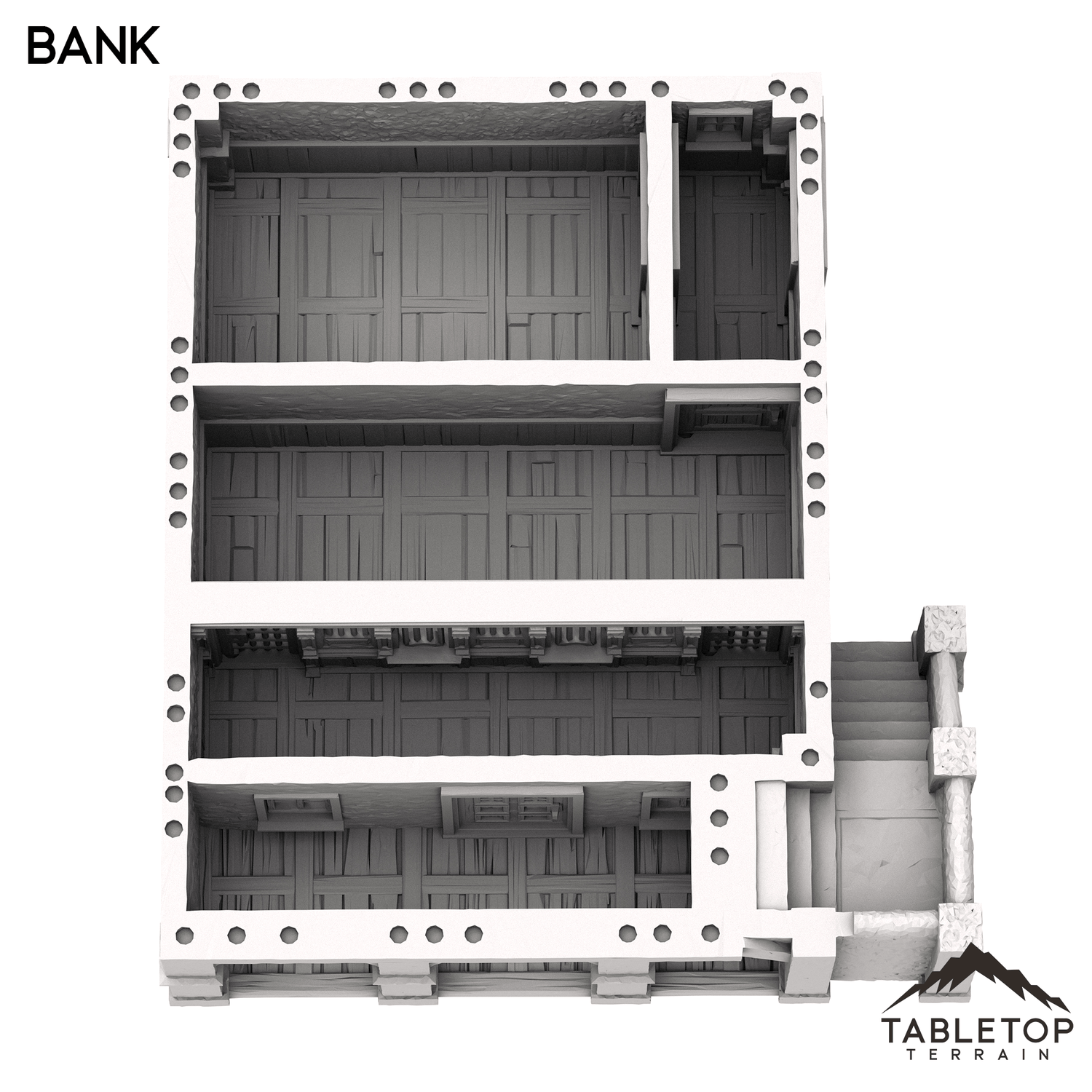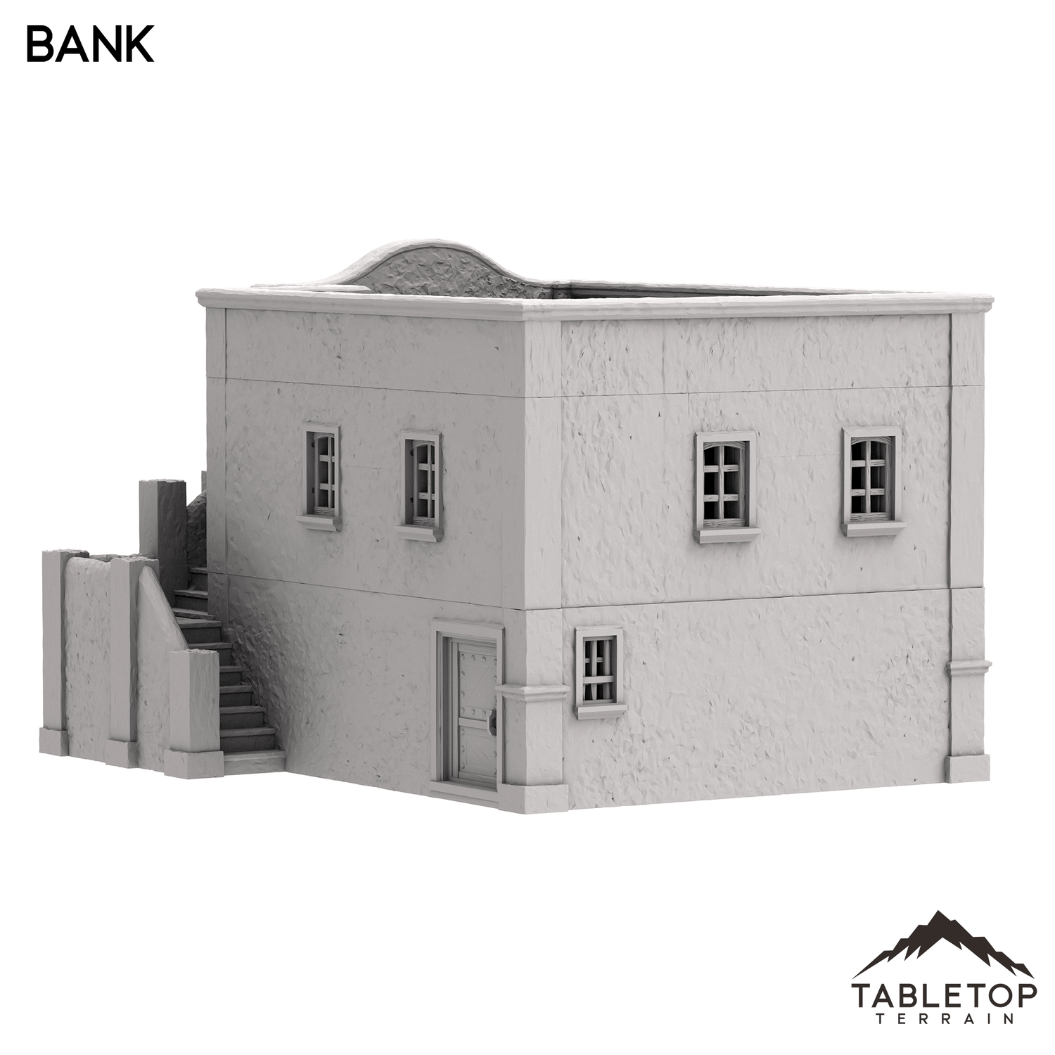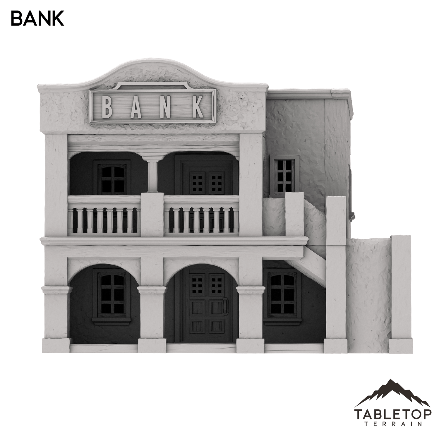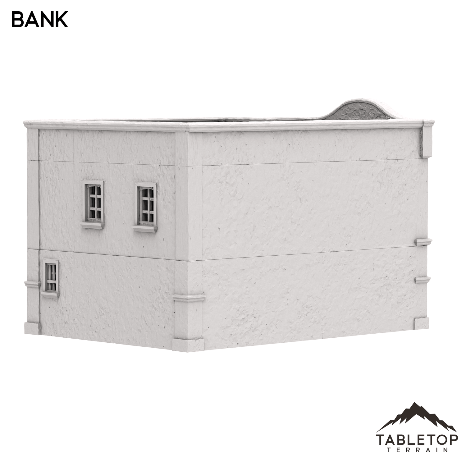 The Bank is a two story Spanish style building with removable floor for interior miniature placement.