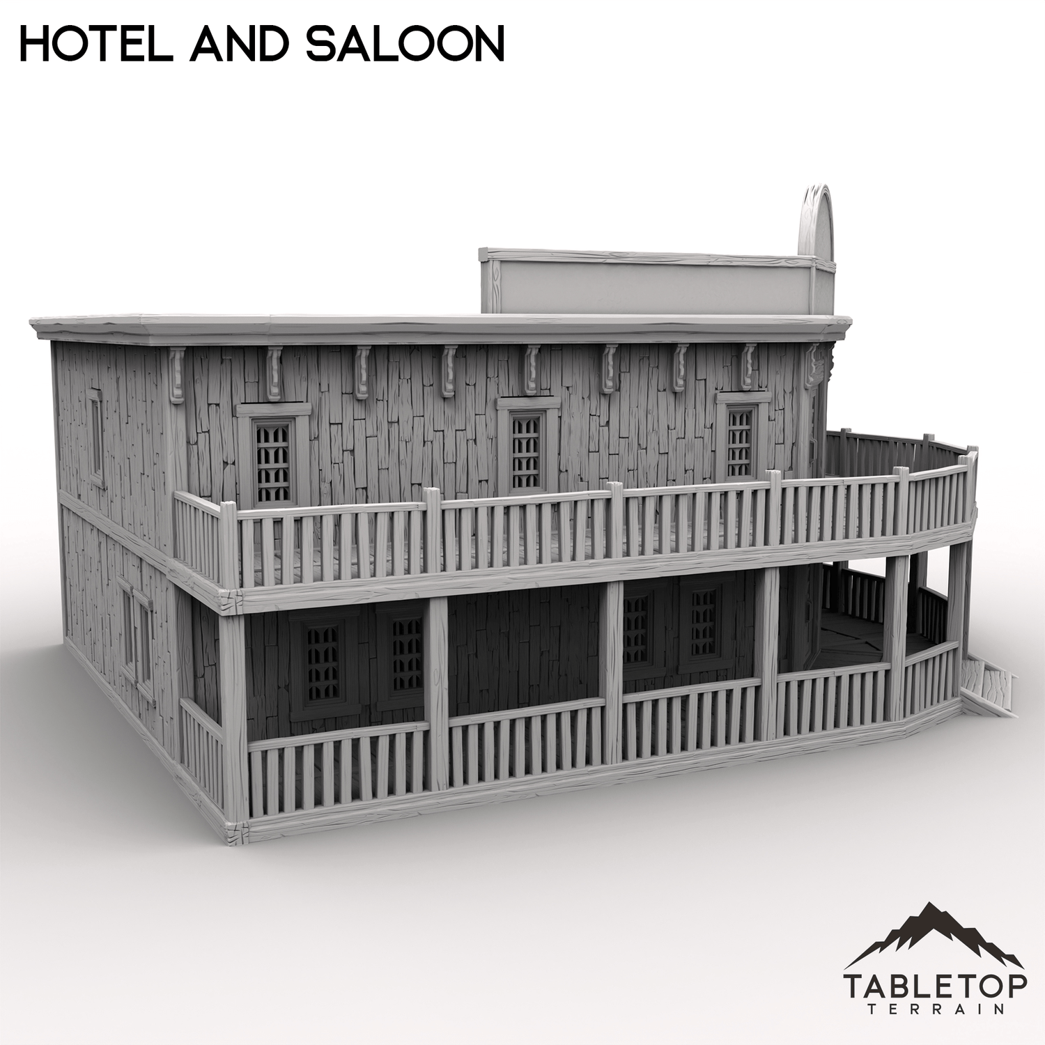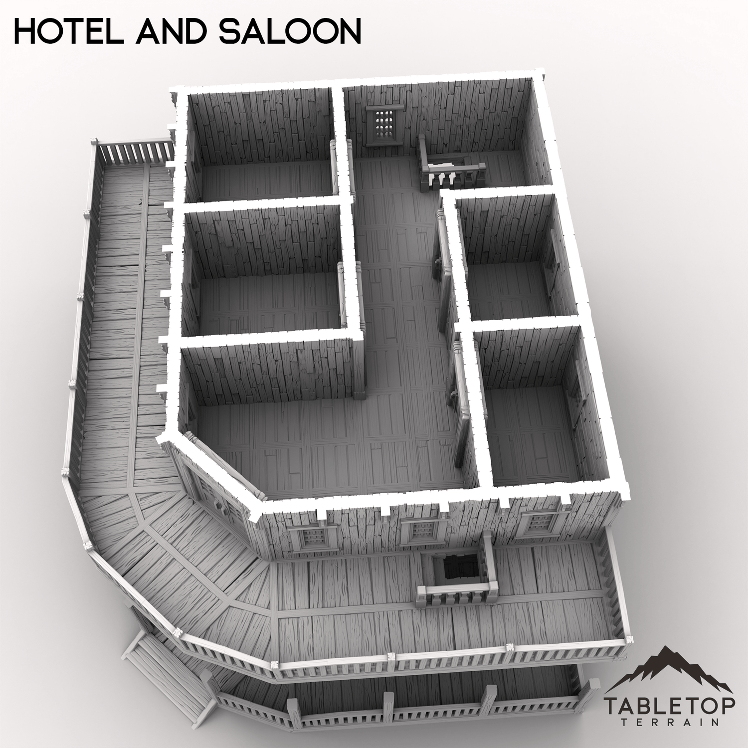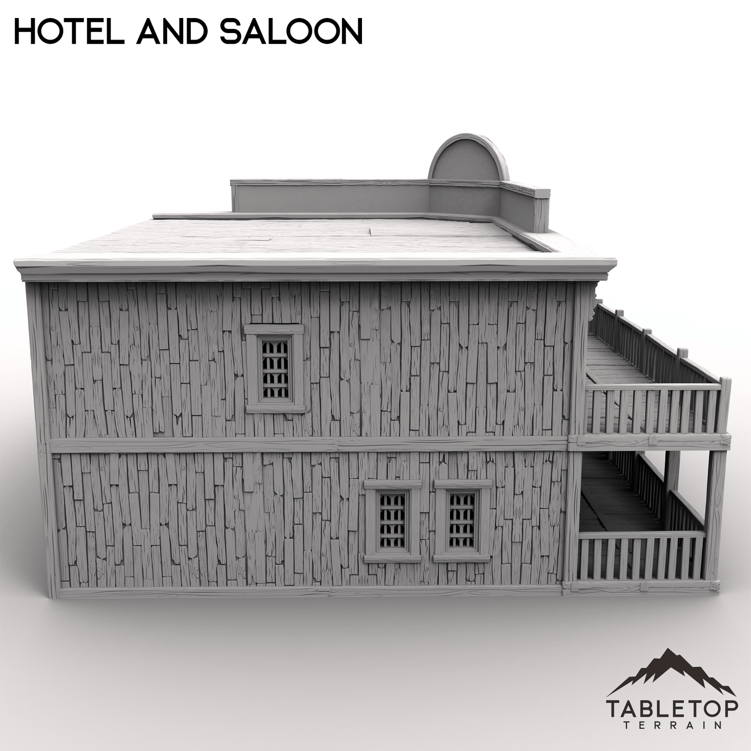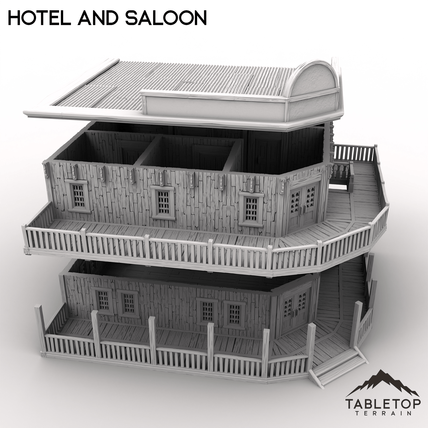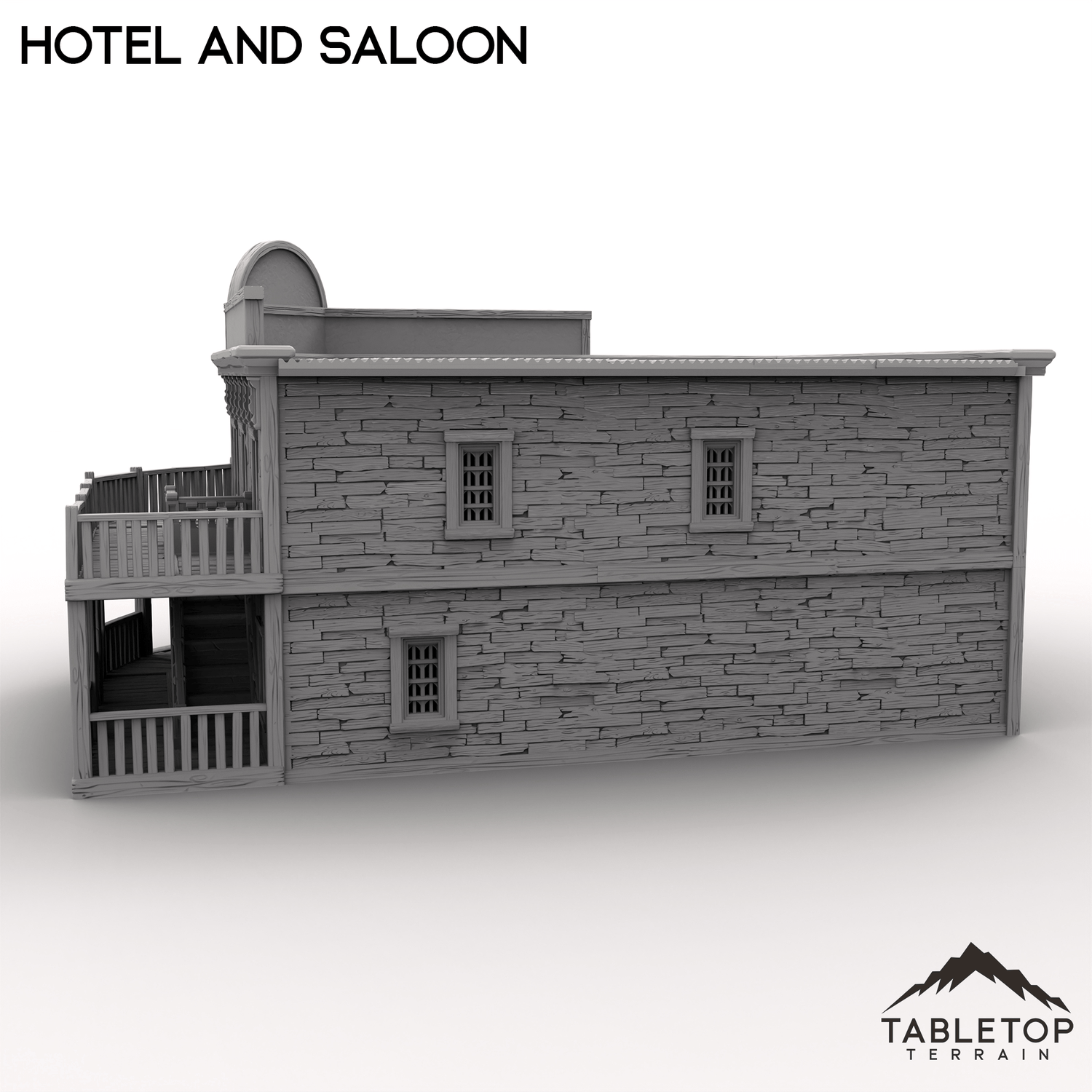 The Hotel and Saloon features a two-story design with a balcony stretching across its facade, supported by sturdy wooden posts. The ground floor boasts wide entry doors, ideal for welcoming patrons to the bustling saloon or travelers seeking lodging. Its rustic architecture and distinctive charm make it a great center piece for any western-themed setting or tabletop scenario.