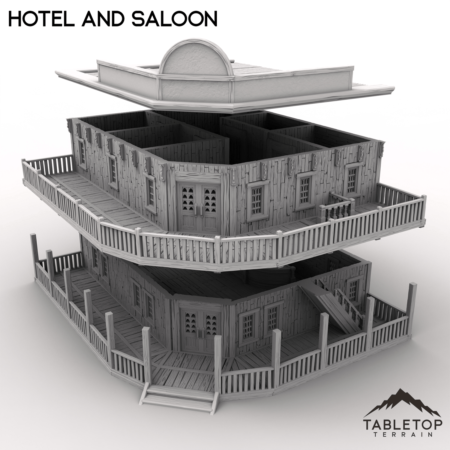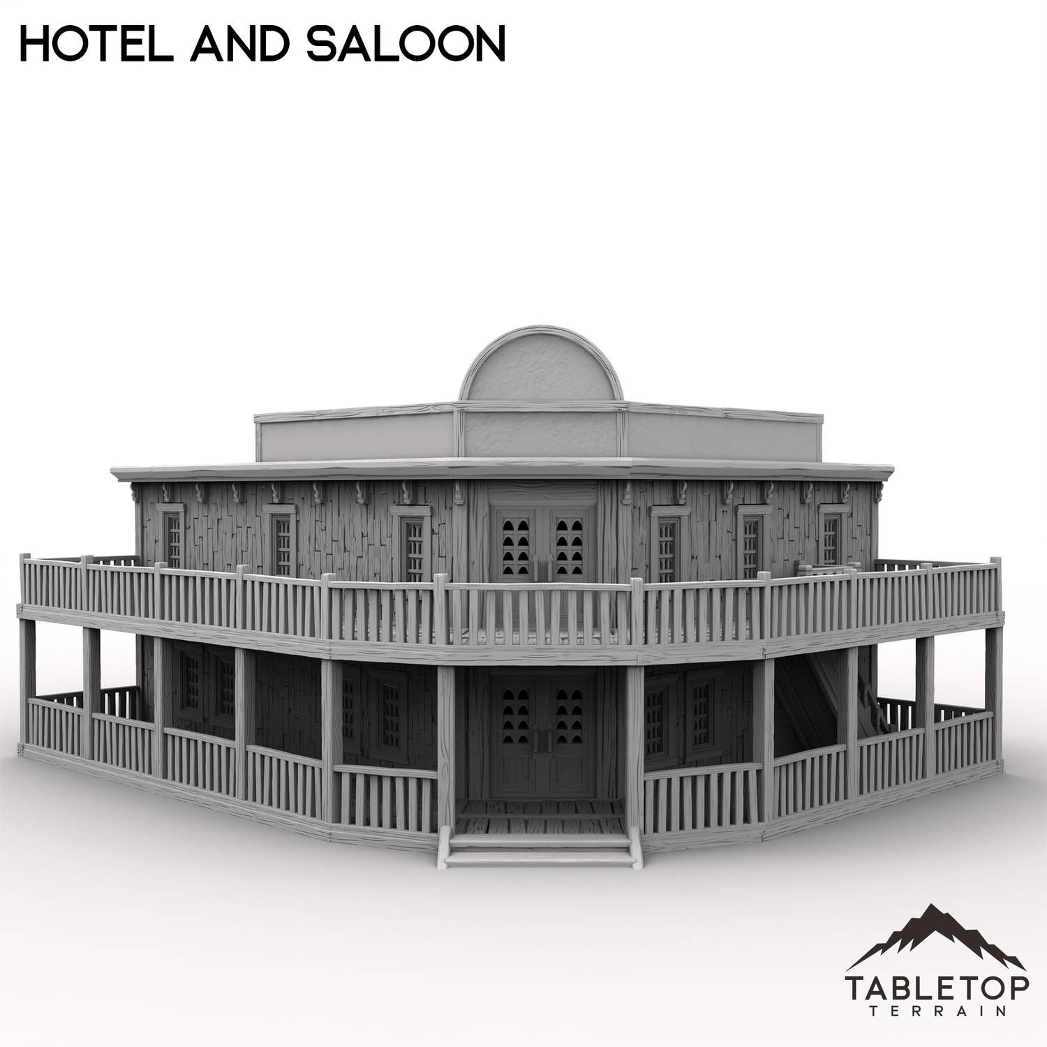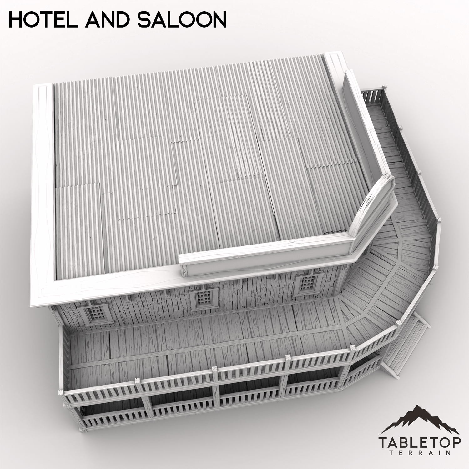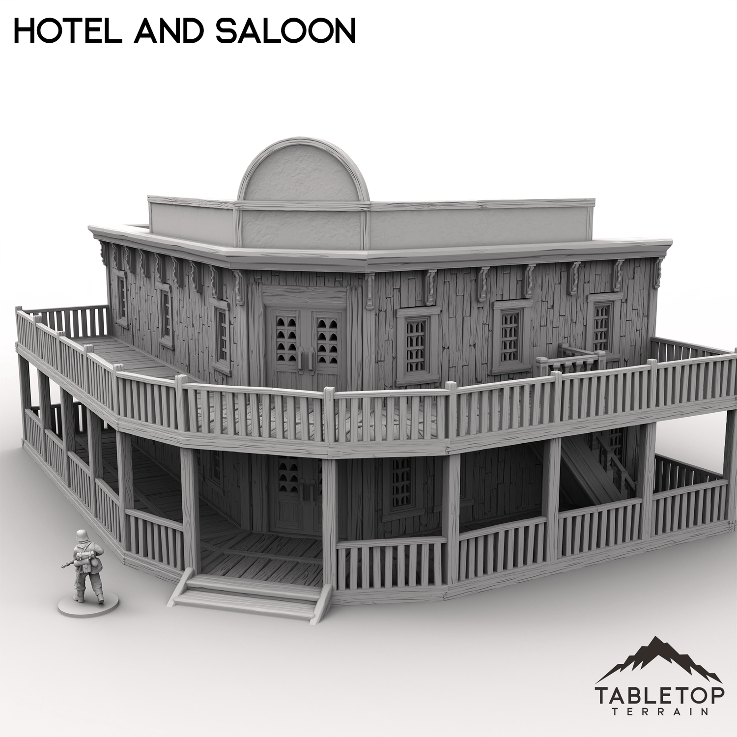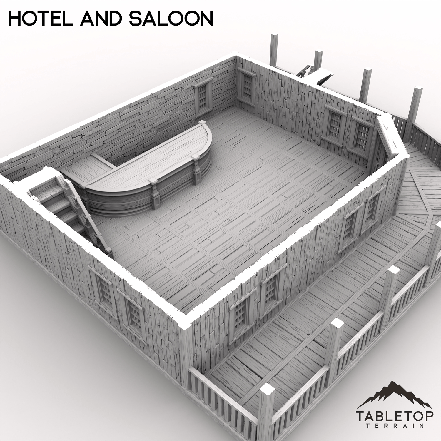 The Hotel and Saloon features a two-story design with a balcony stretching across its facade, supported by sturdy wooden posts. The ground floor boasts wide entry doors, ideal for welcoming patrons to the bustling saloon or travelers seeking lodging. Its rustic architecture and distinctive charm make it a great center piece for any western-themed setting or tabletop scenario.