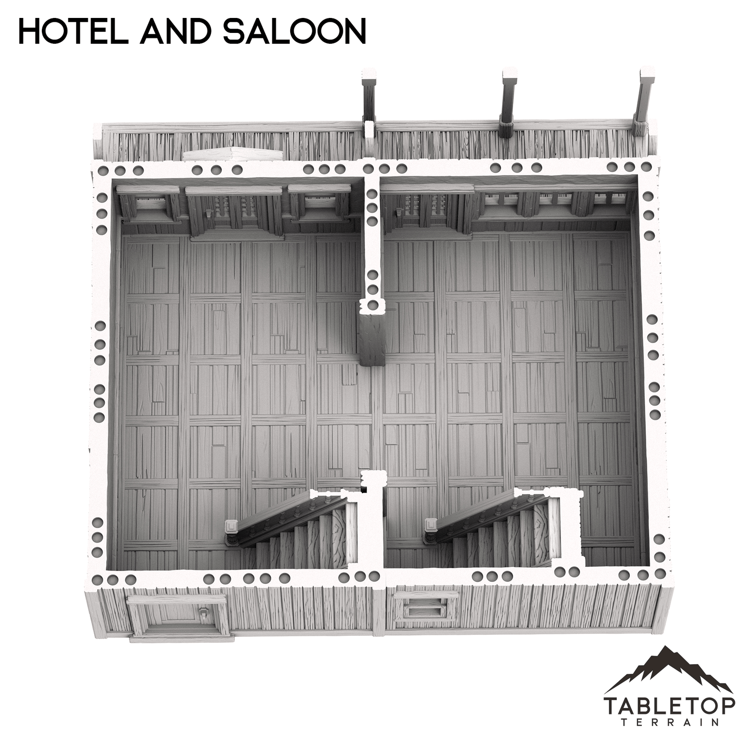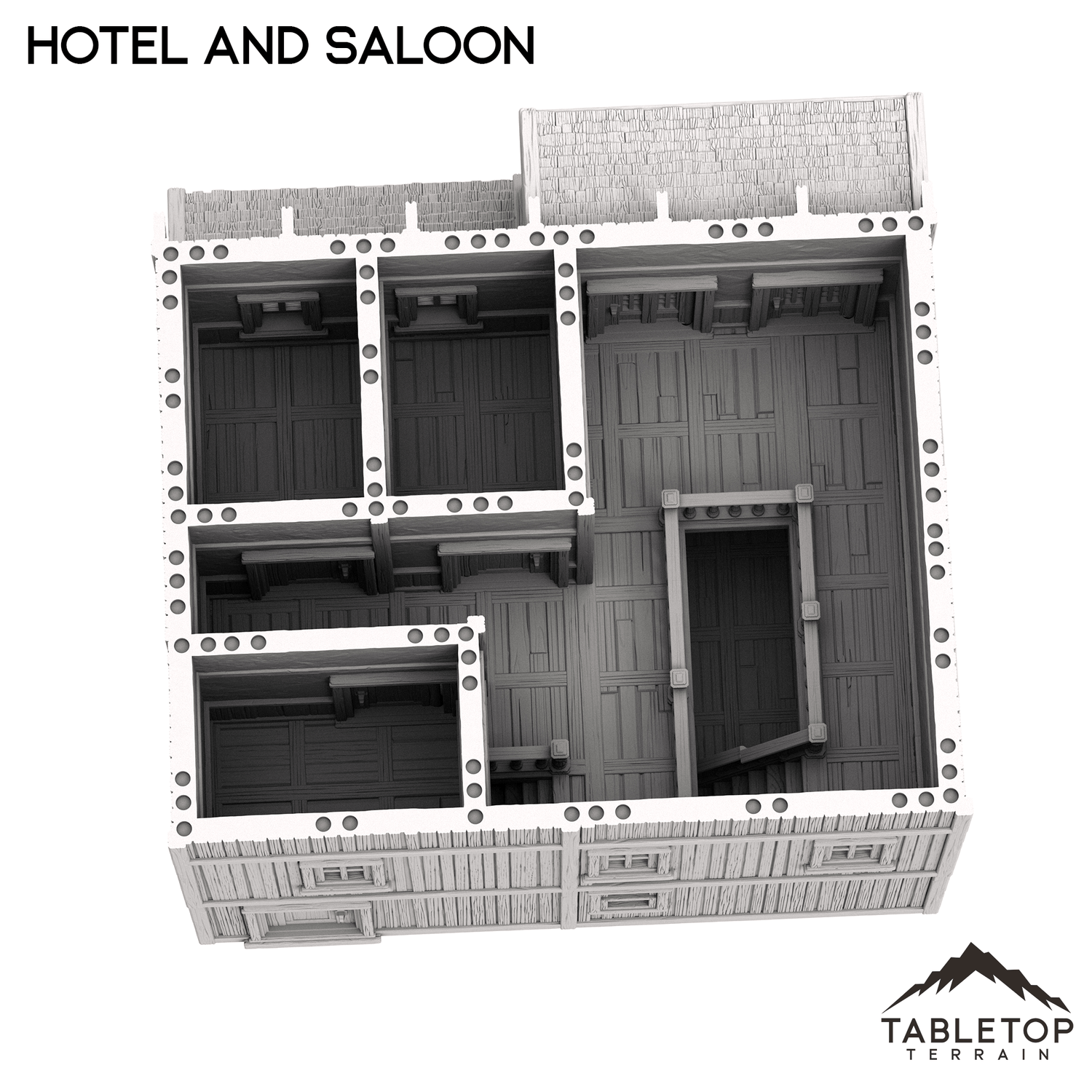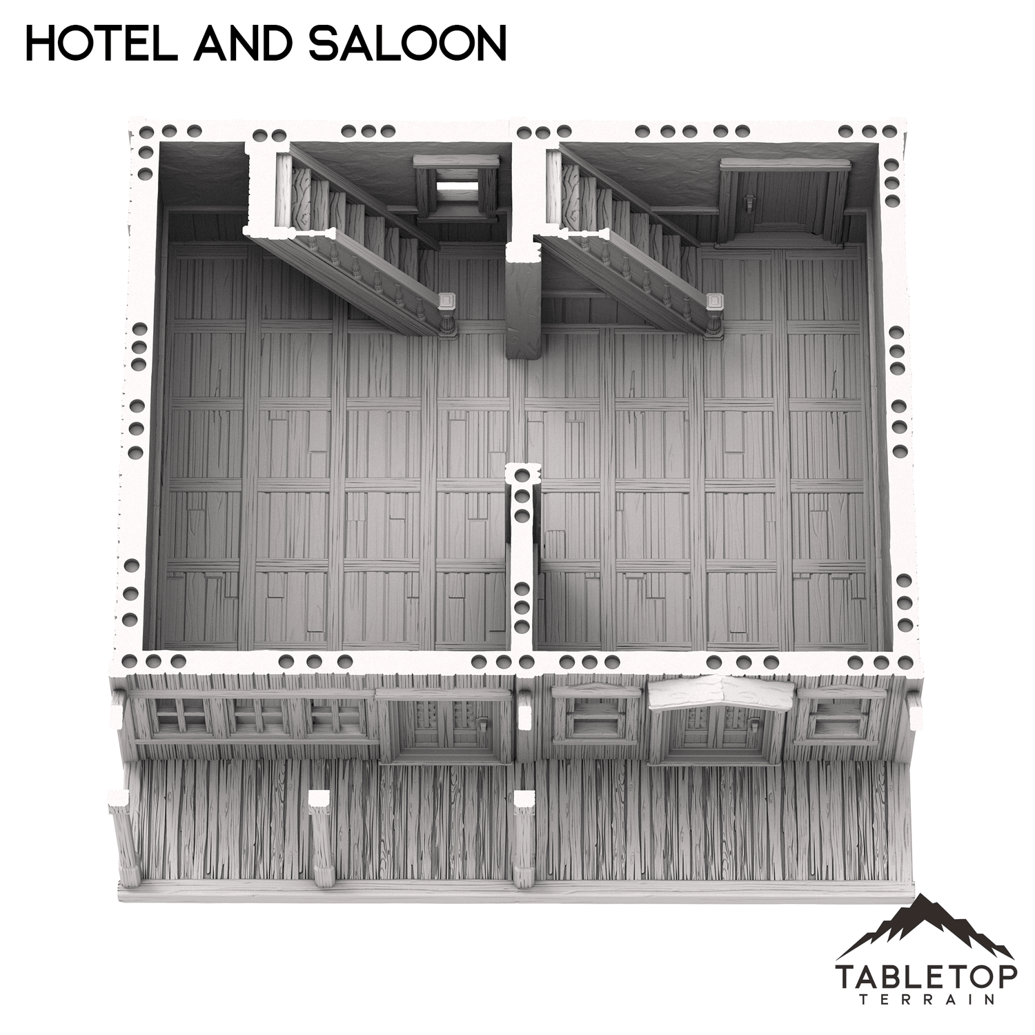 The Hotel and Saloon is a very large Old West themed building. Both buildings are combined together into one large structure. The roof is removable for interior miniature placement on both the upper and lower levels.